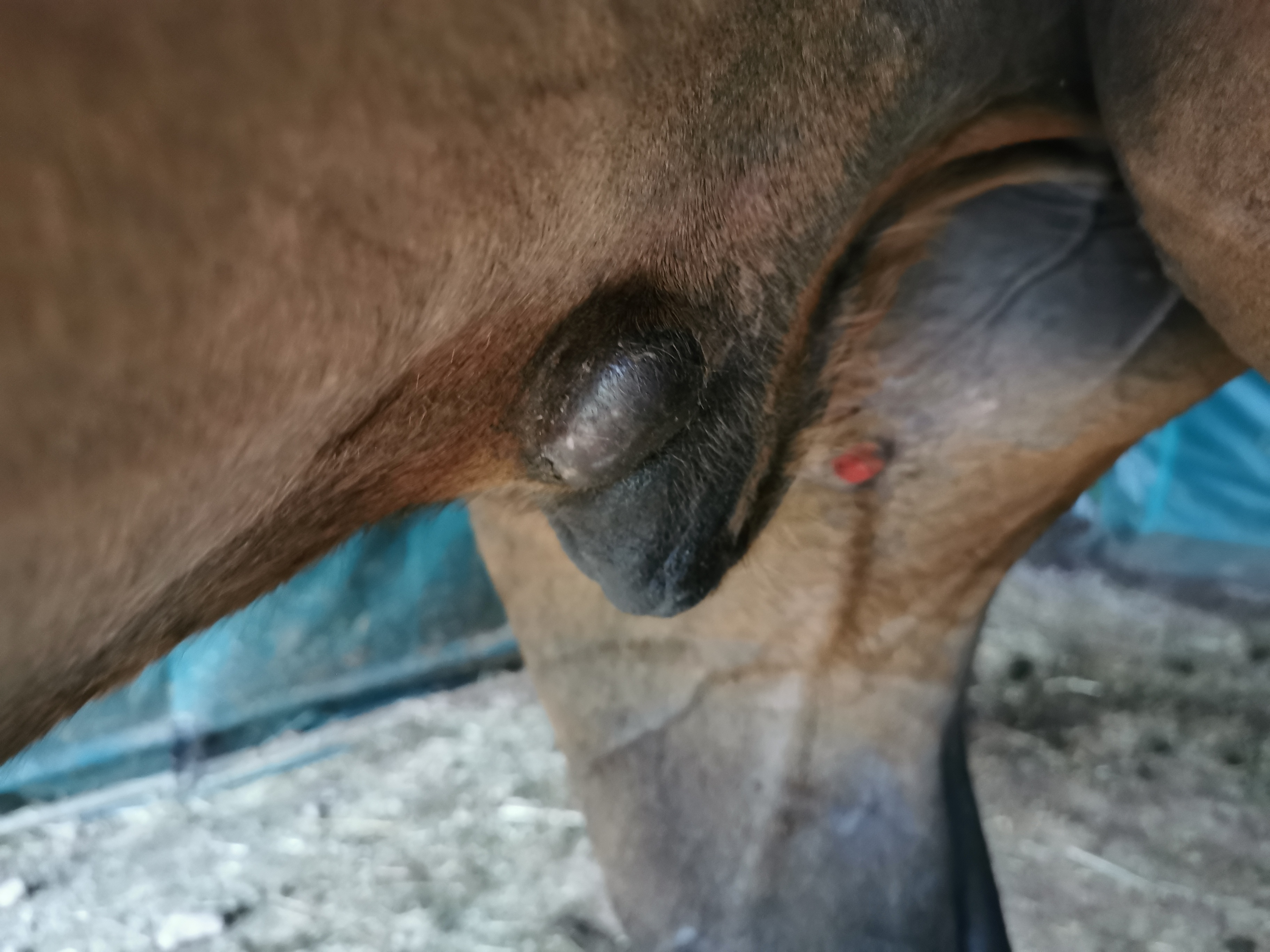 Es sind 2 Knubbel. Der eine am Schlauch war eine halbe Pflaume und jetzt ein Tischtennisball. Der 2 ist am Hinterbein innen und war rechteckig ca 5mm dick und jetzt eine Kugel zwischen Pflaumen und Tischtennisgröße.