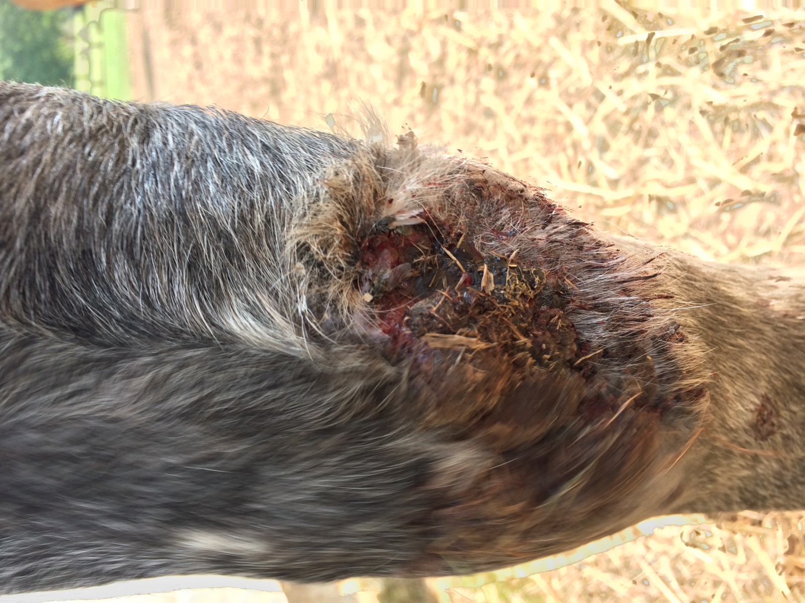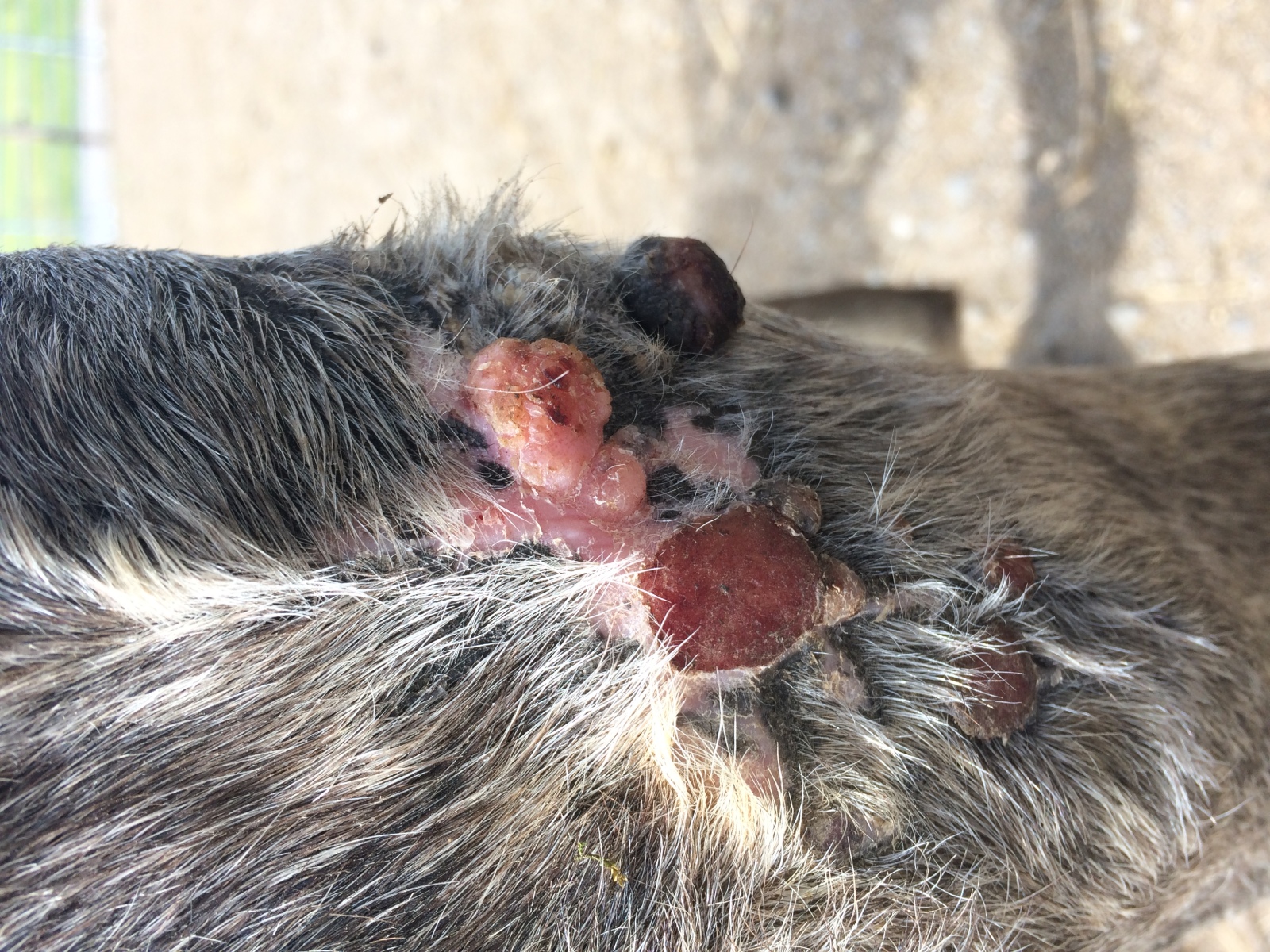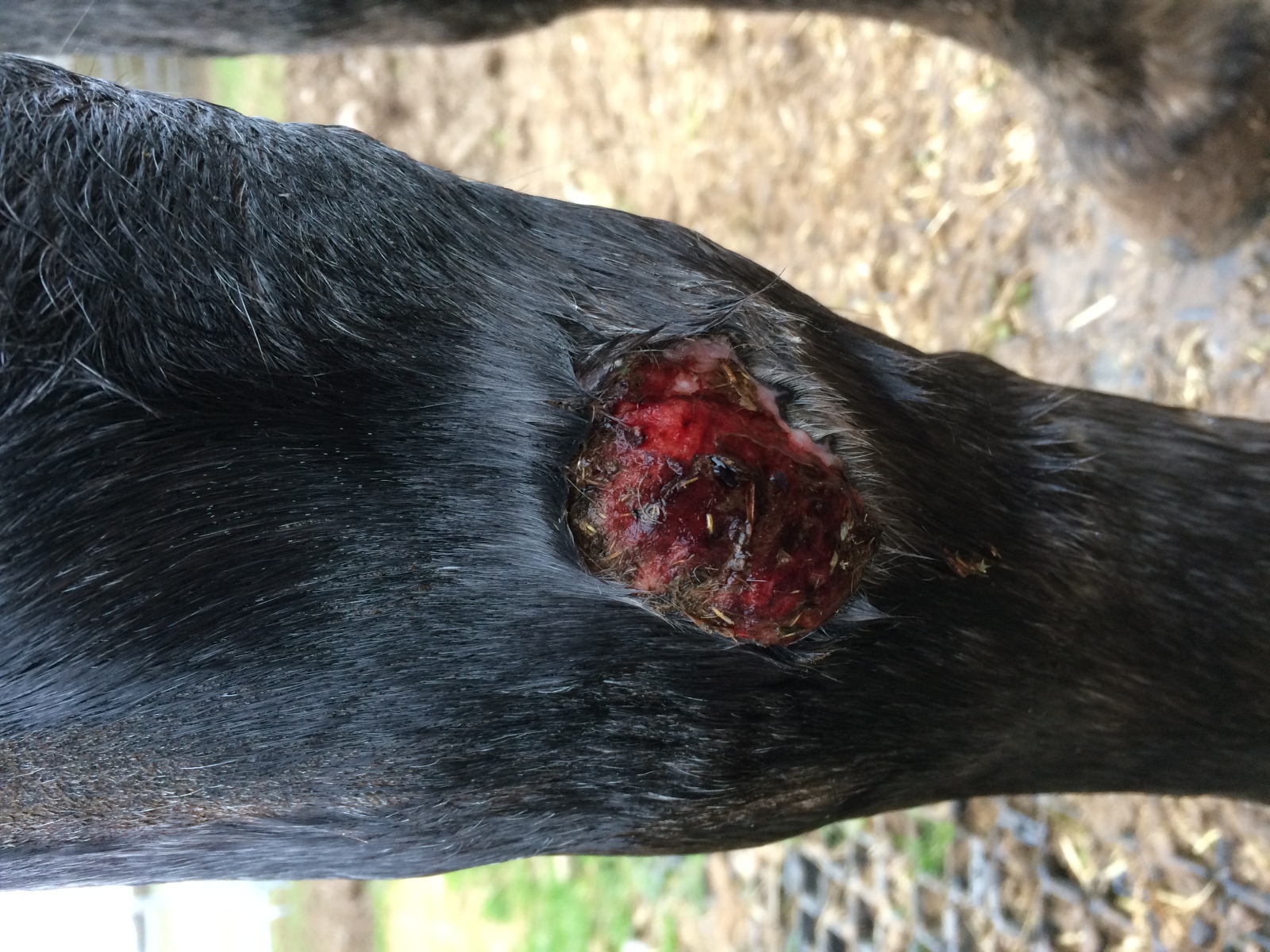 Im Alter von 1 1/2 Jahren hatte er eine kleine offene Stelle am linken Vorderbein. Da er immer auf dieser Stelle lag, dachte ich zuerst er hätte auf einem Steinchen gelegen. Innerhalb eines halben Jahres wuchs die Stelle aber dann auch nach außen. Als sie so groß wie ein 10cent Stück war, rief ich meinen Tierarzt. Er sagte, dass es wahrscheinlich ein ES sei und so schnell wie möglich weg operiert werden sollte. Das habe ich am Tag darauf auch direkt machen lassen. Von dieser Zeit habe ich leider keine Bilder mehr. Das war im Januar diesen Jahres. Die Wunde platze wenige Tage danach direkt auf und das ES kam wesentlich größer explosionsartig wieder. Der Tierarzt sagte es sei nur wildes Fleisch und behandelte es auch dementsprechend. Nachdem ich ein paar Wochen dabei zugesehen hatte wie es so stark wächst fuhr ich in die Klinik. Dort wurde er im Anfang April diesen Jahres dann wieder operiert. Die Tierärztin sagte, dass bei der Größe eine andere Behandlung erstmal nicht in Frage kam. Da die Stelle so blöd war musste er zur Heilung 5 Wochen mit Gips/später Schiene angebunden in der Box stehen. Alles sah super aus, er durfte wieder nach Hause und nur noch eine kleine Stelle war offen. Nach 2-3 Wochen mit Pflege 3 mal täglich (Wundpflege mit Ringelblumensalbe und Vulketan) kamen erste kleine Knubbel wieder raus. Mittlerweile hatte ich den Tierarzt gewechselt und der neue Tierarzt, der auch die Wundbehandlung bis dahin gemacht hatte, empfohl mir das Newmarket Bloodroot Ointment. Die Salbe schlug erst gut an, die kleinen Knubbel fielen ab. 2-3 Wochen später bildeten sich trotz weiterem schmieren aber neue größere Knubbel.