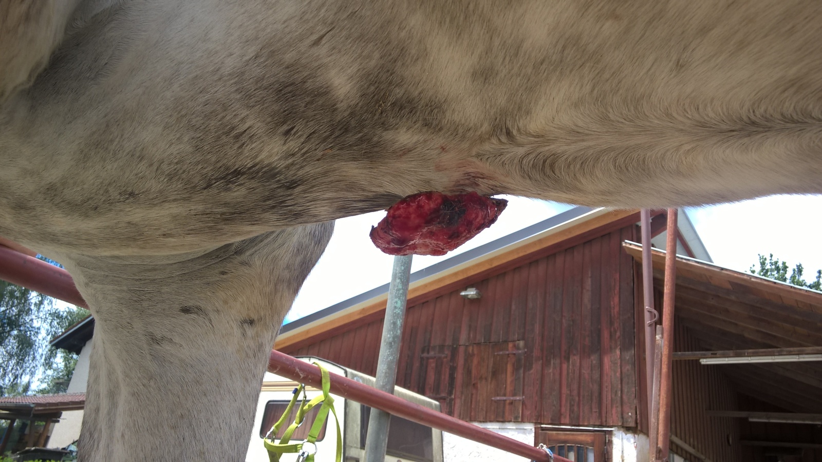 Im Mai 2017 war das ES nun so groß und schwer, dass es die Haut am Bauch dehnte. Meinem Pferd ging es in dieser Zeit gar nicht gut. Das ES störte ihn extrem, er lief nicht mehr schneller als im Schritt, da das Ding an seinem Bauch immer so arg baumelte und an der Haut zog.