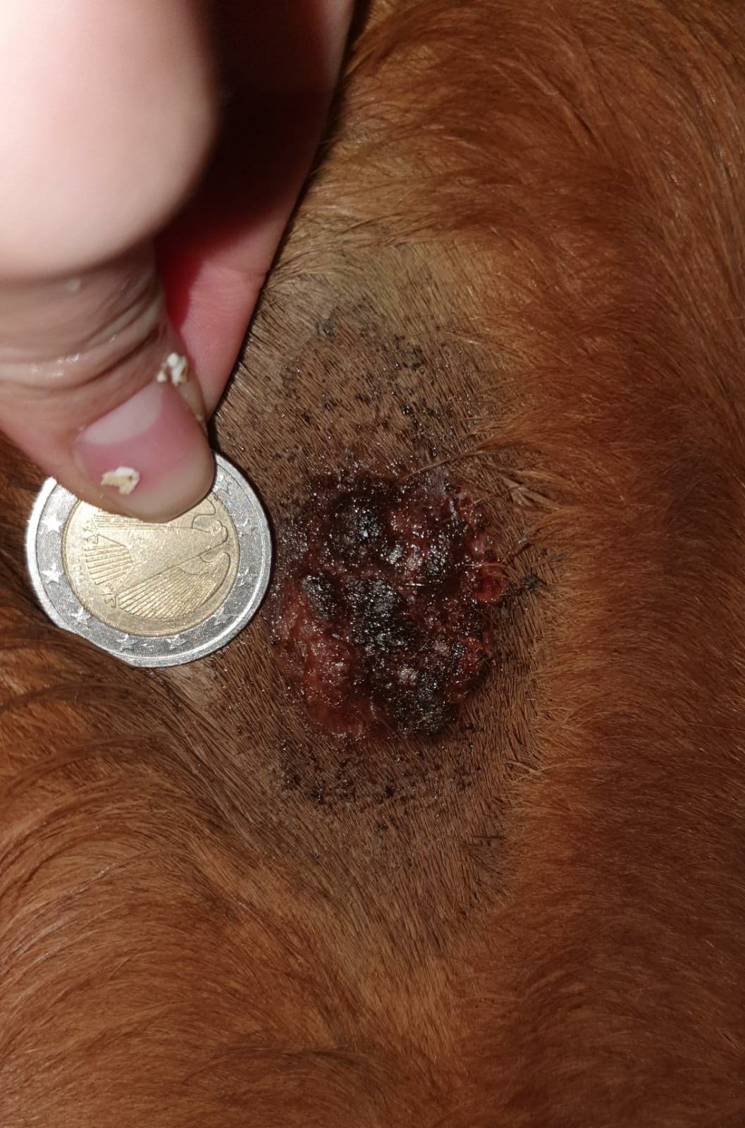 Nach Anraten meiner Tierärztin begann ich dann die Behandlung mit "Lotagen", was die Stelle jedoch nur rötlich färbte, etwas ätzte und das Wachstum des Sarkoids gefühlt beschleunigte. Eine Kruste o.ä. bildete sich nie, weshalb ich die Behandlung mit "Lotagen" nach 28 Tagen nach Rücksprache mit meiner Tierärztin abbrach.