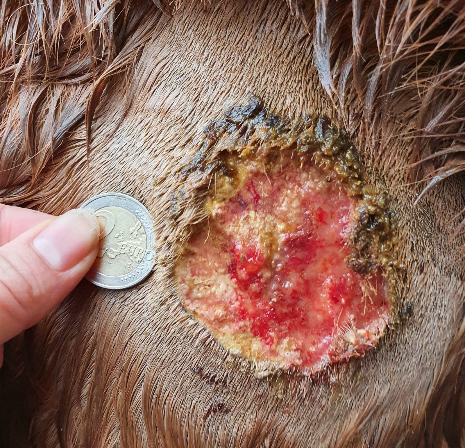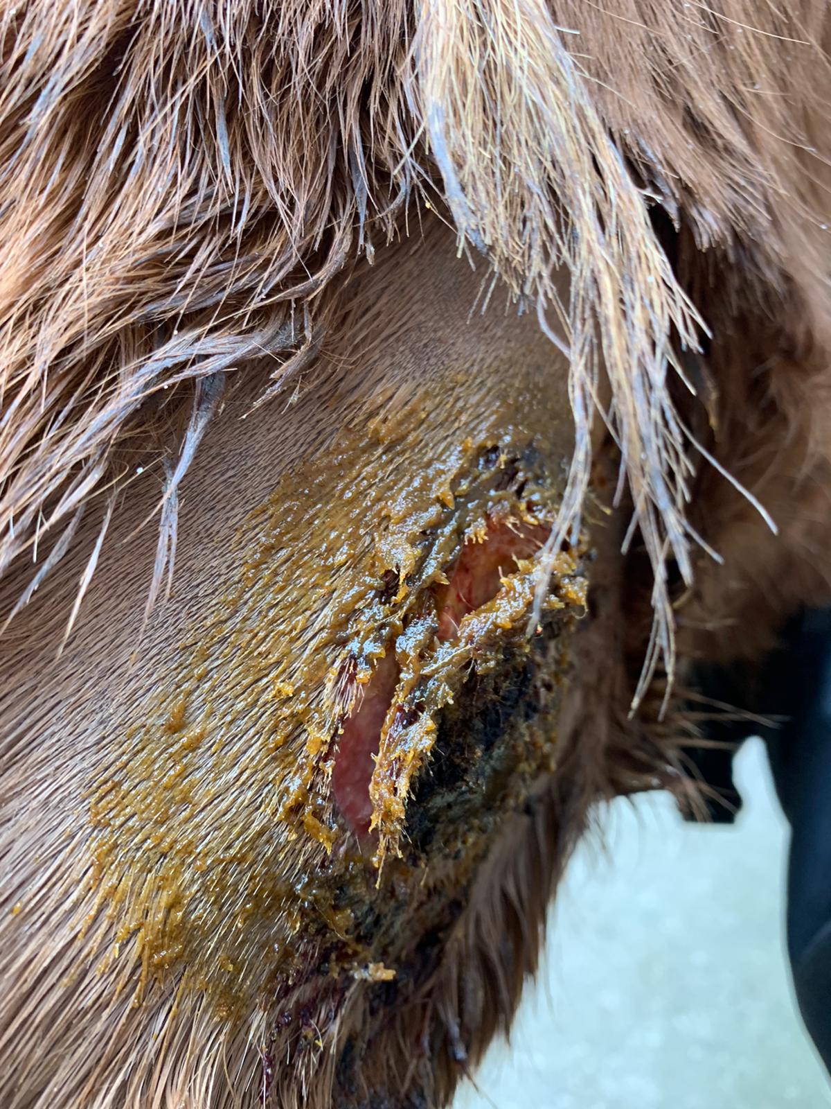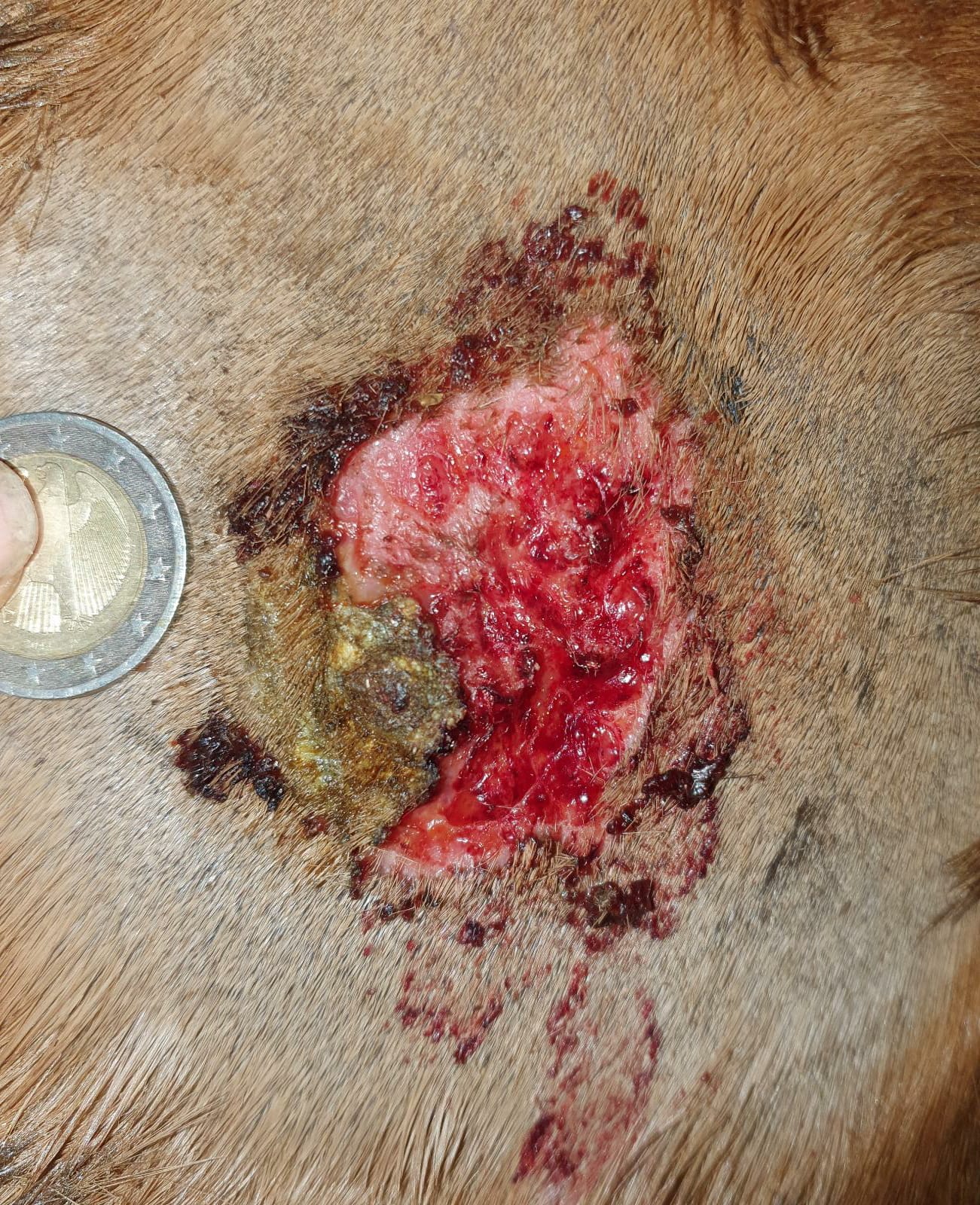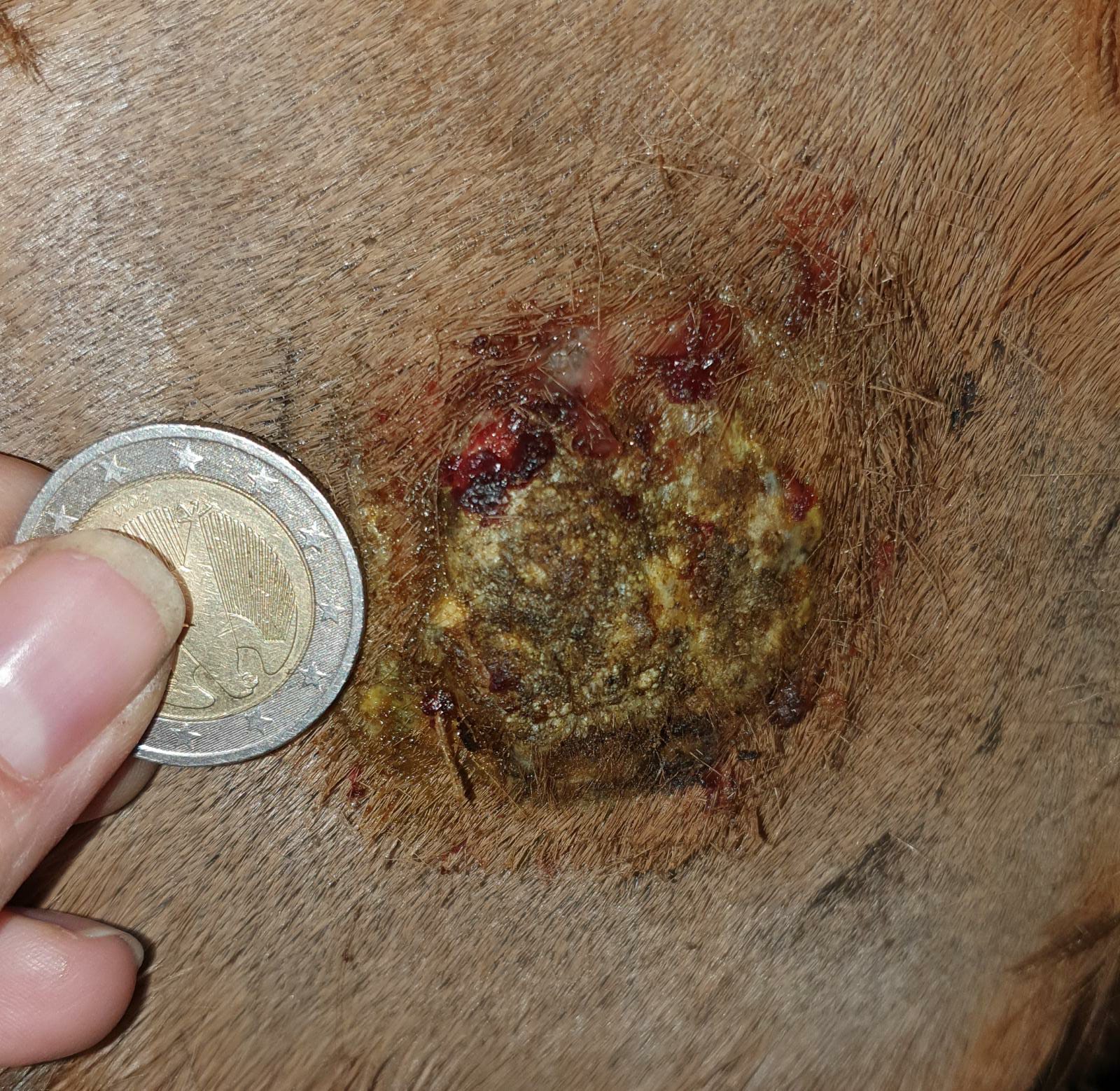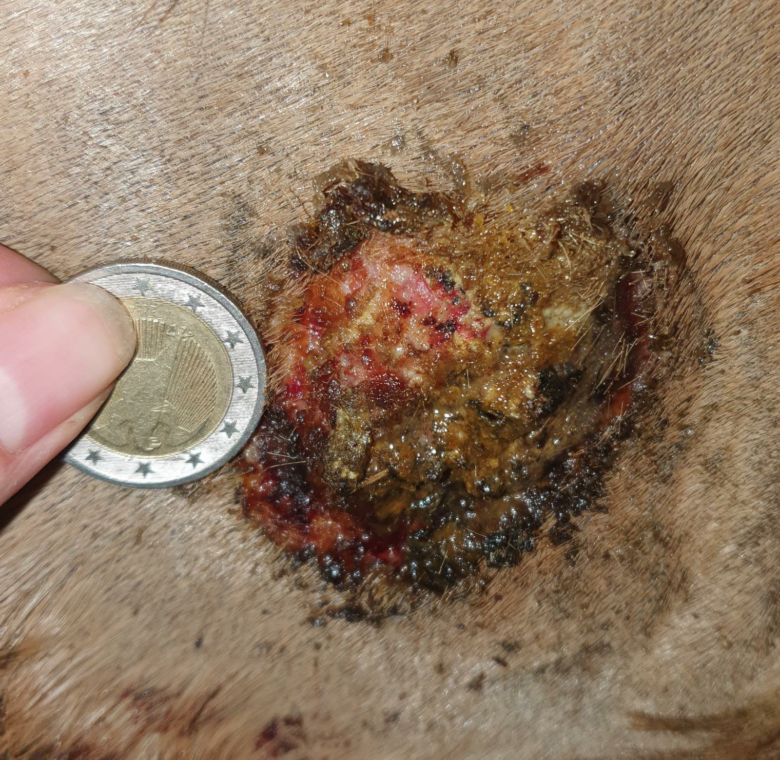 Selber Tag, nachdem das Pferd getobt hat. Die Kruste unten links hängt nur noch an einem Zipfel. Stärkere Blutung. Trotzdem COMPX draufgeschmiert