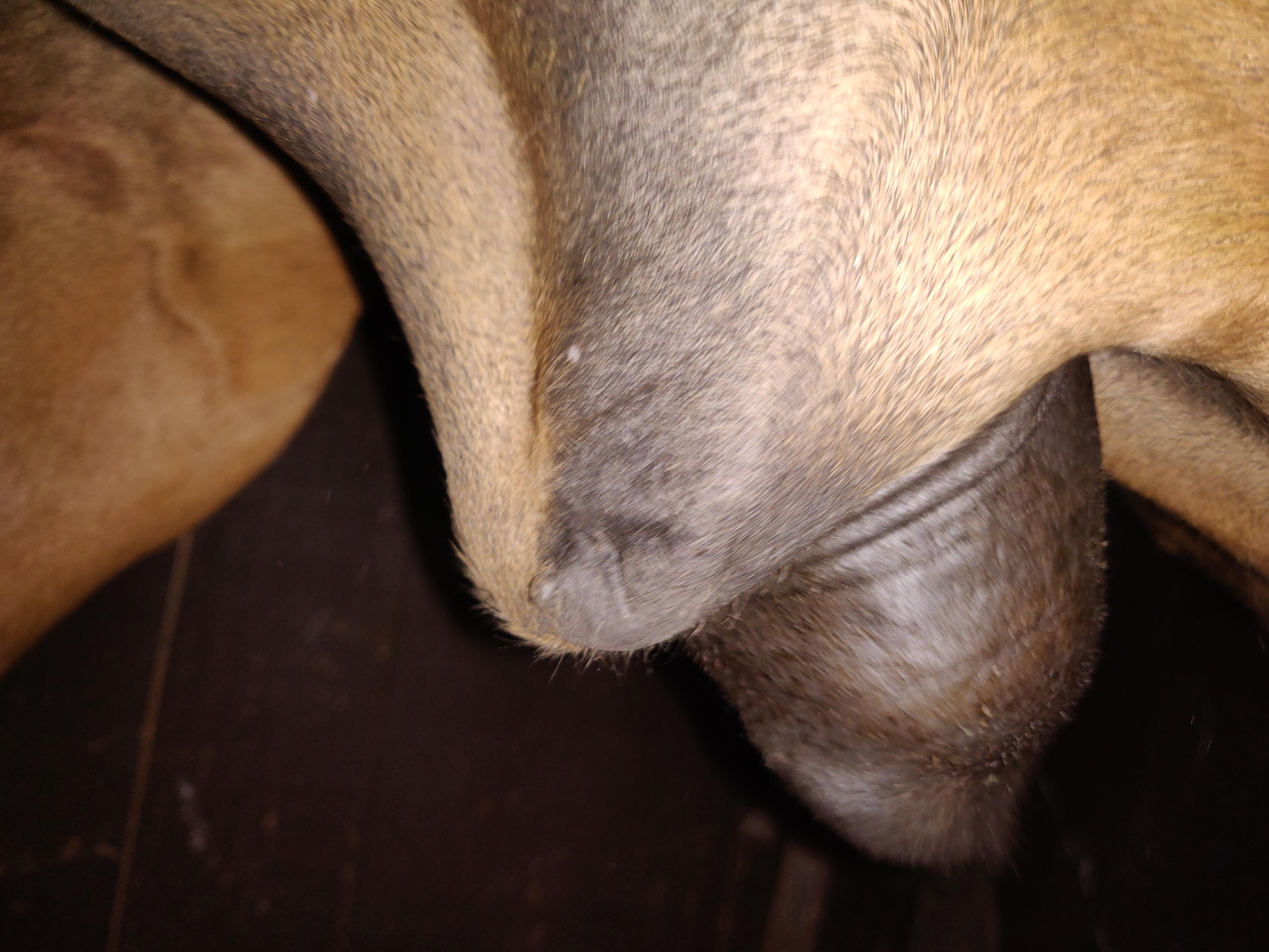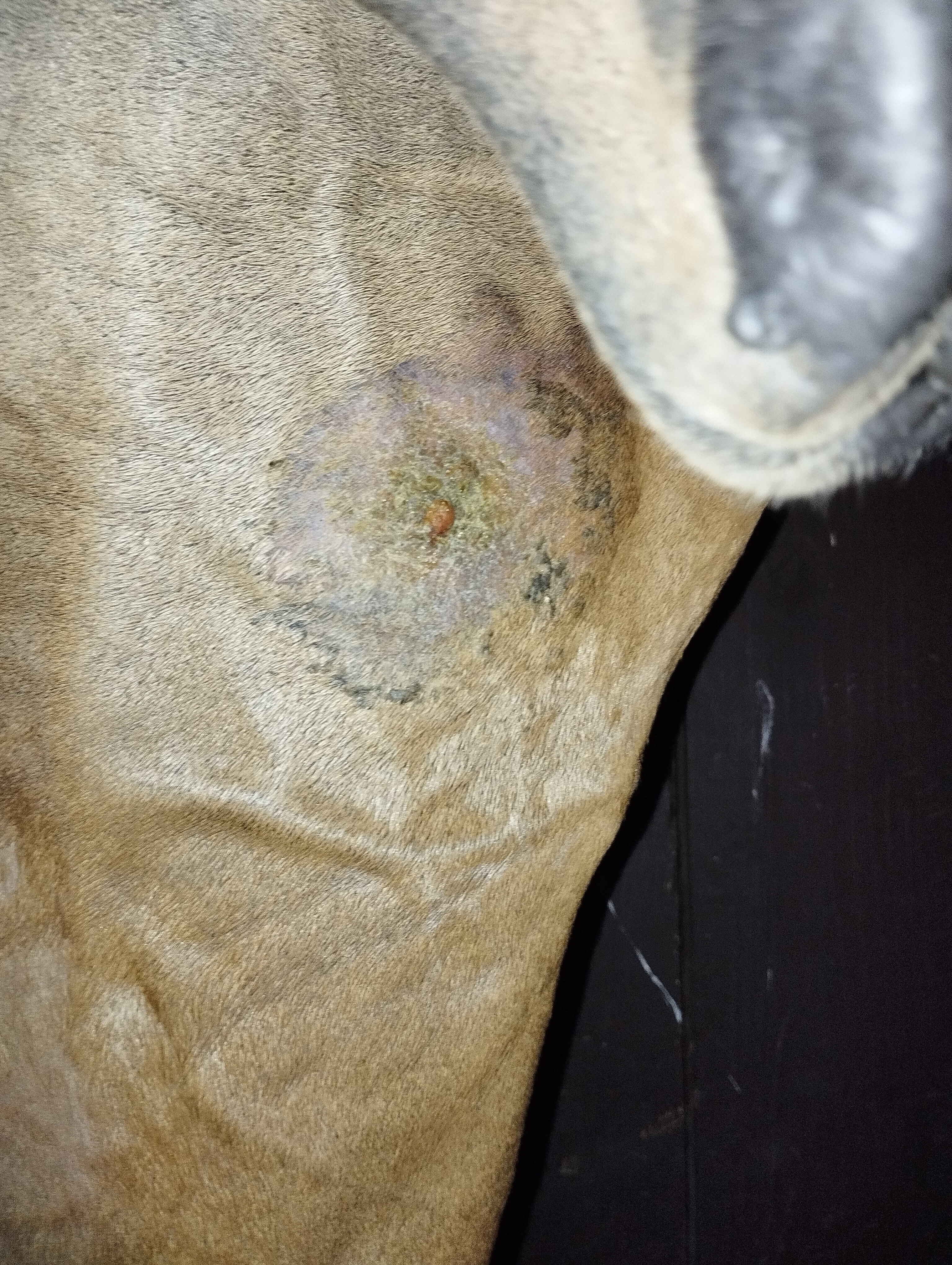 Stand 20.07.23: seit einer Woche in Behandlung. Es wurde bis jetzt 3mal gecremt. Die oberste Hautschicht ist schon weg. Die Gegend um das Sarkoid ist leicht geschwollen. Das Reinigen des Sarkoids und das Entfernen der Krusten tut ihm etwas weh. Das Auftragen der Creme stört ihn nicht.
