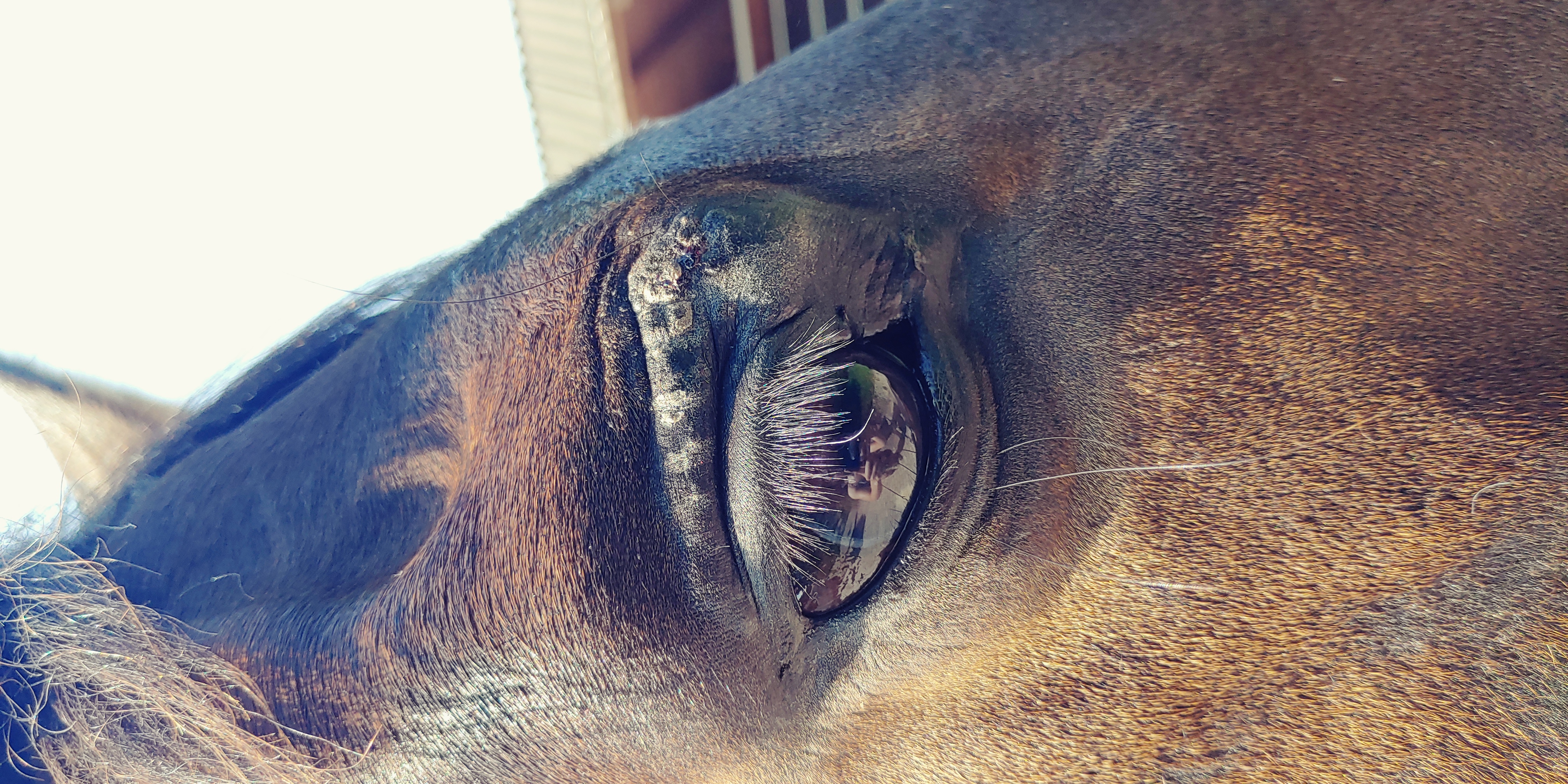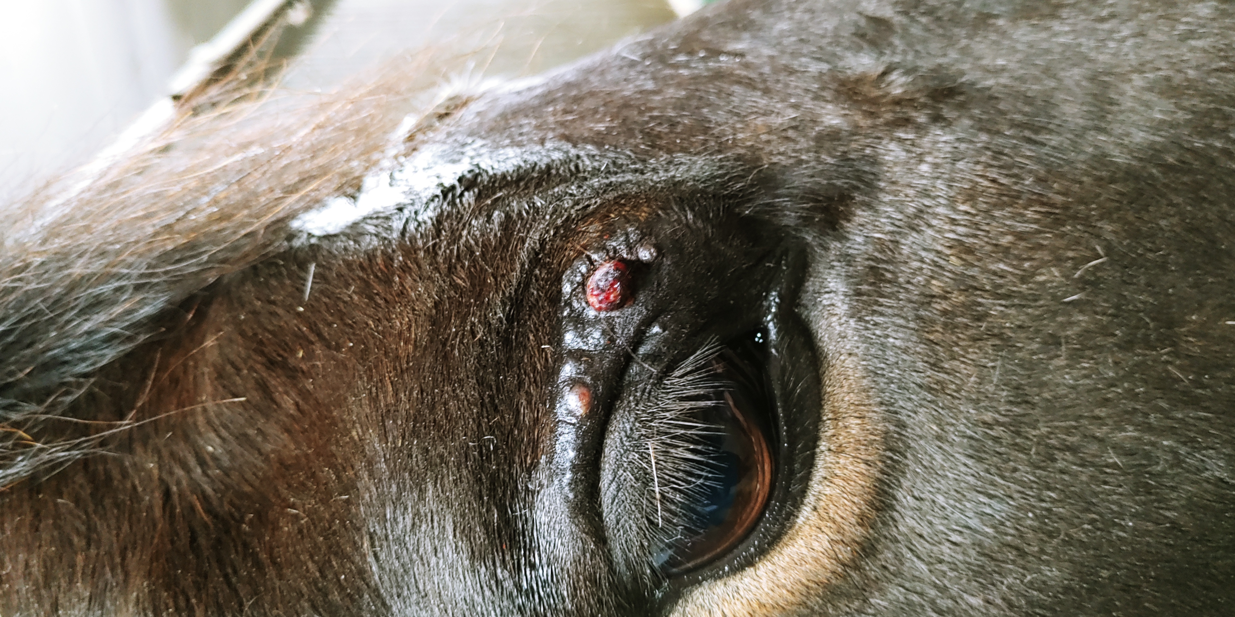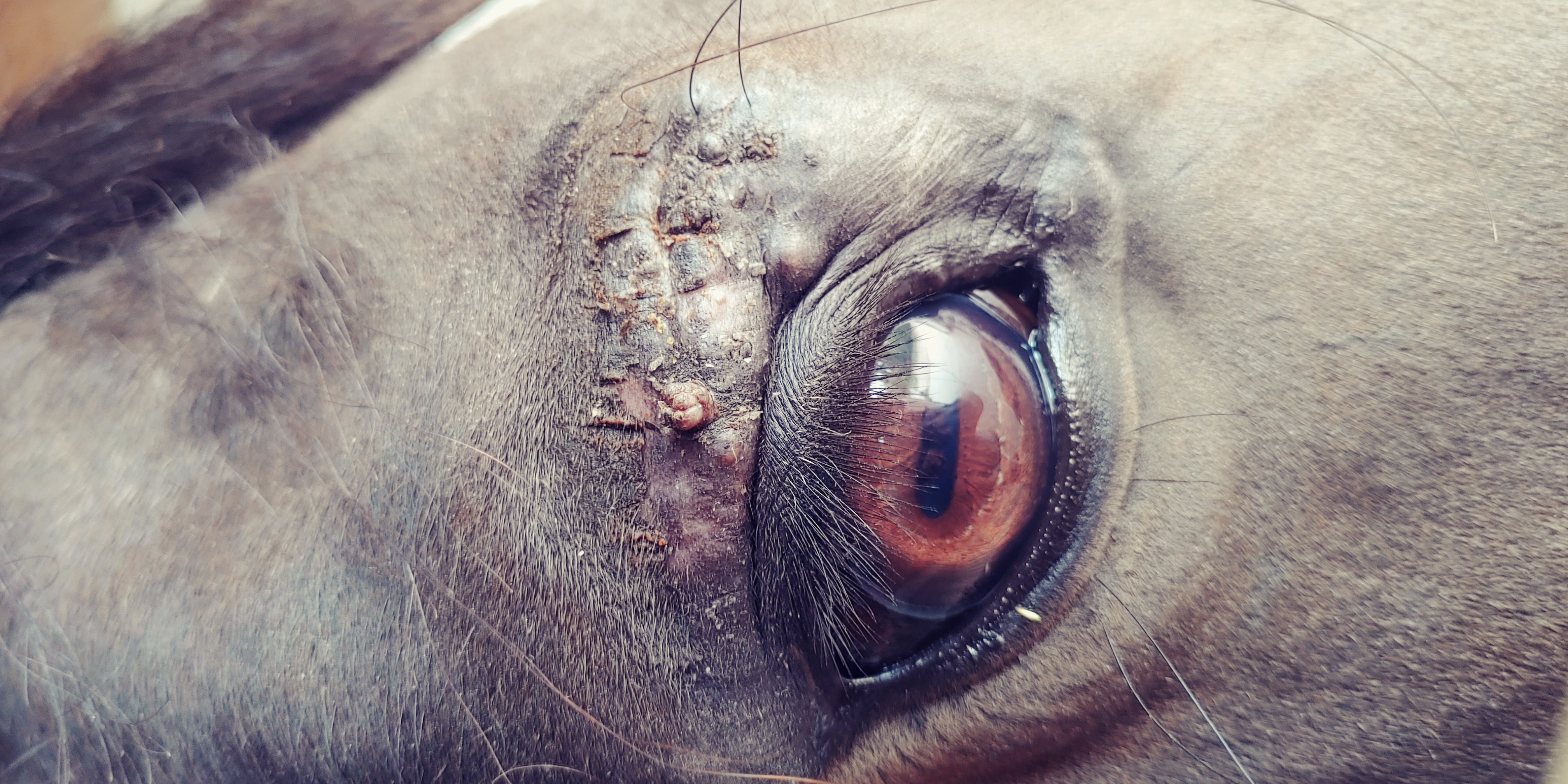 schon länger schaue ich immer mal wieder im Forum vorbei und lese mir Behandlungstagebücher von anderen Pferden durch. Ich selbst habe seit fast 3 Jahren einen Wallach, welcher erstmals im Sommer 2020 Auffälligkeiten am Auge zeigte. Seit er Fohlen ist, hat er über diesen Auge eine kahle Stelle durch eine Verletzung. Zuerst vermutete ich da einen Stich, aber es wurde immer warziger. Ich belas mich dann zu diesem Thema und hatte immer mehr den Verdacht es könnte ein Sarkoid sein.