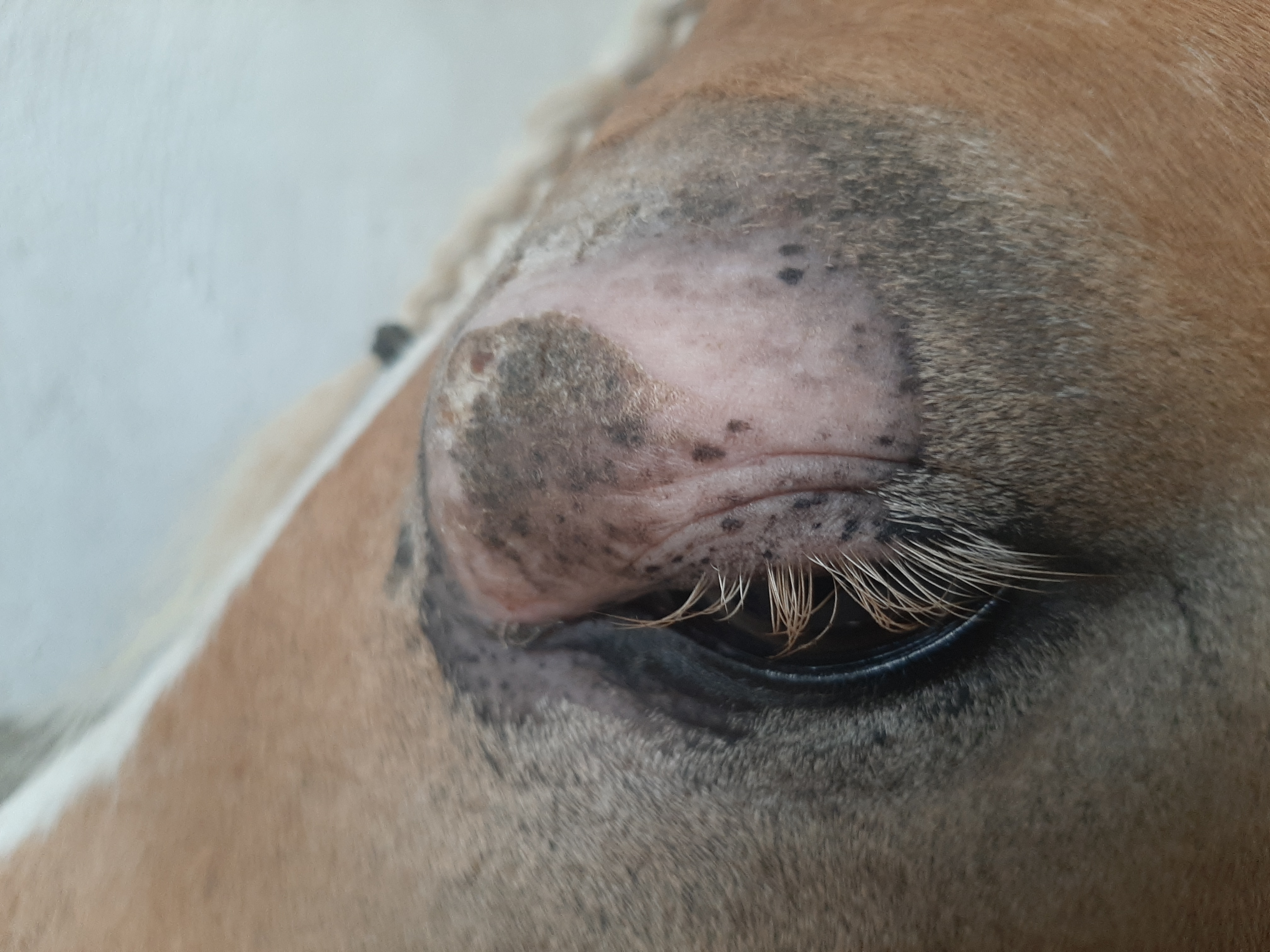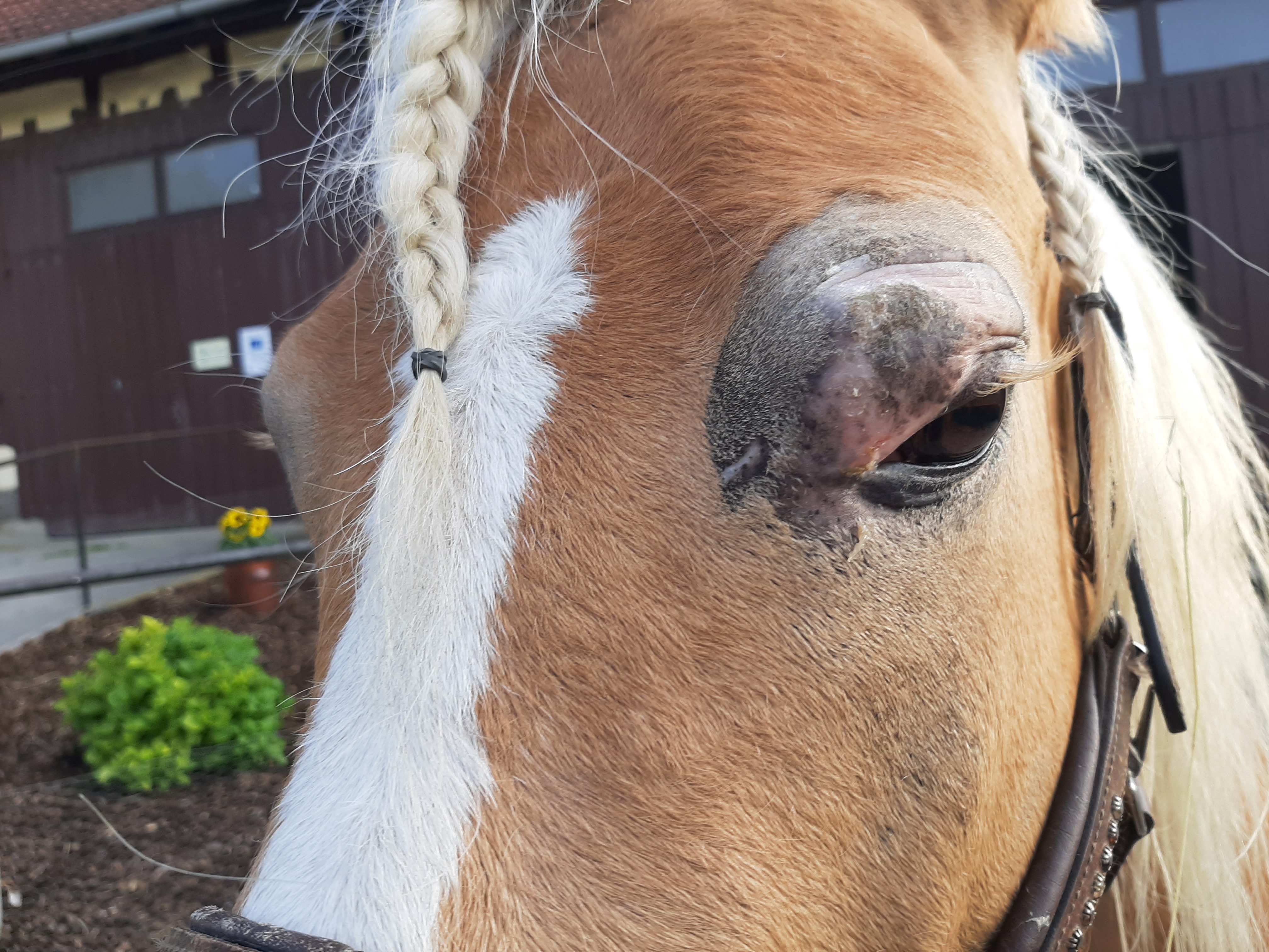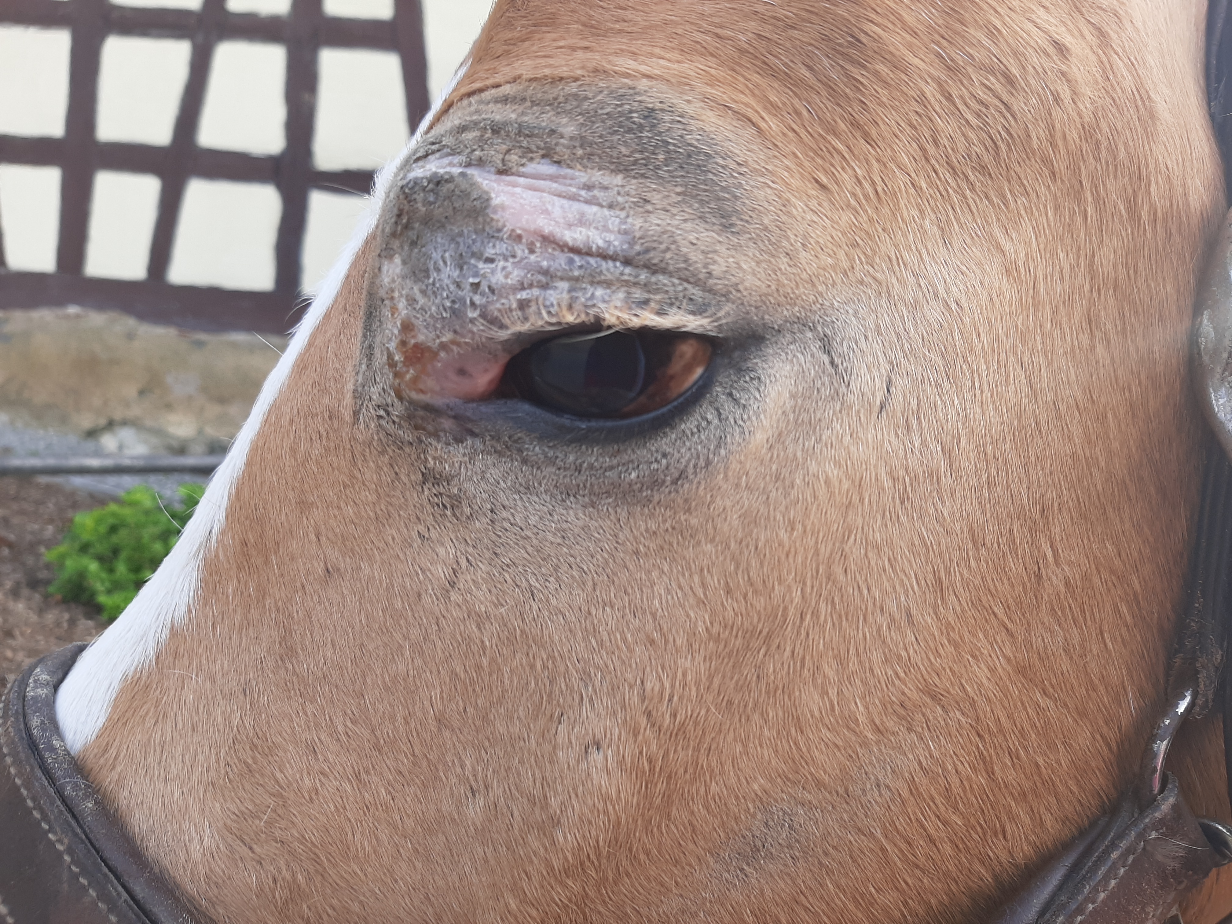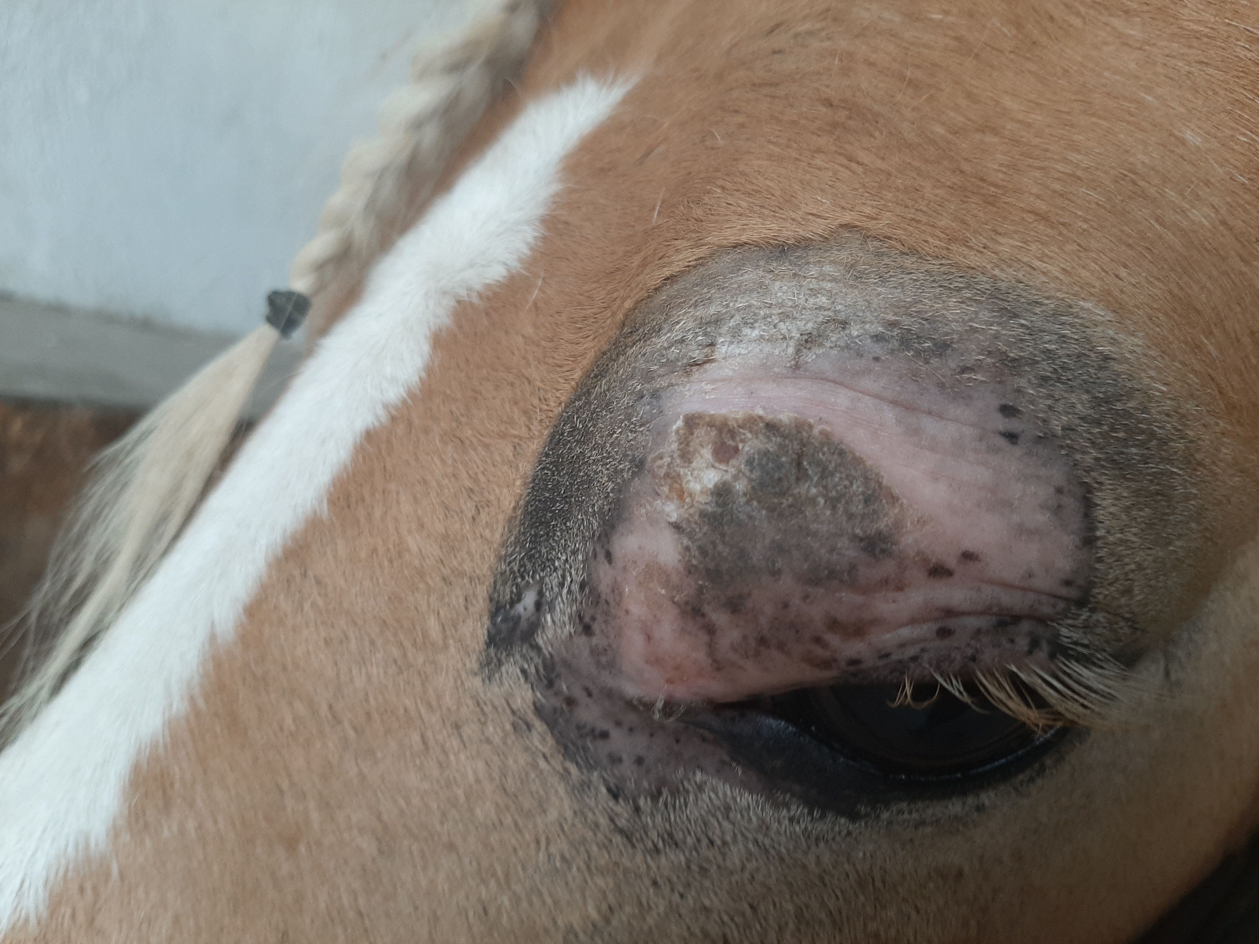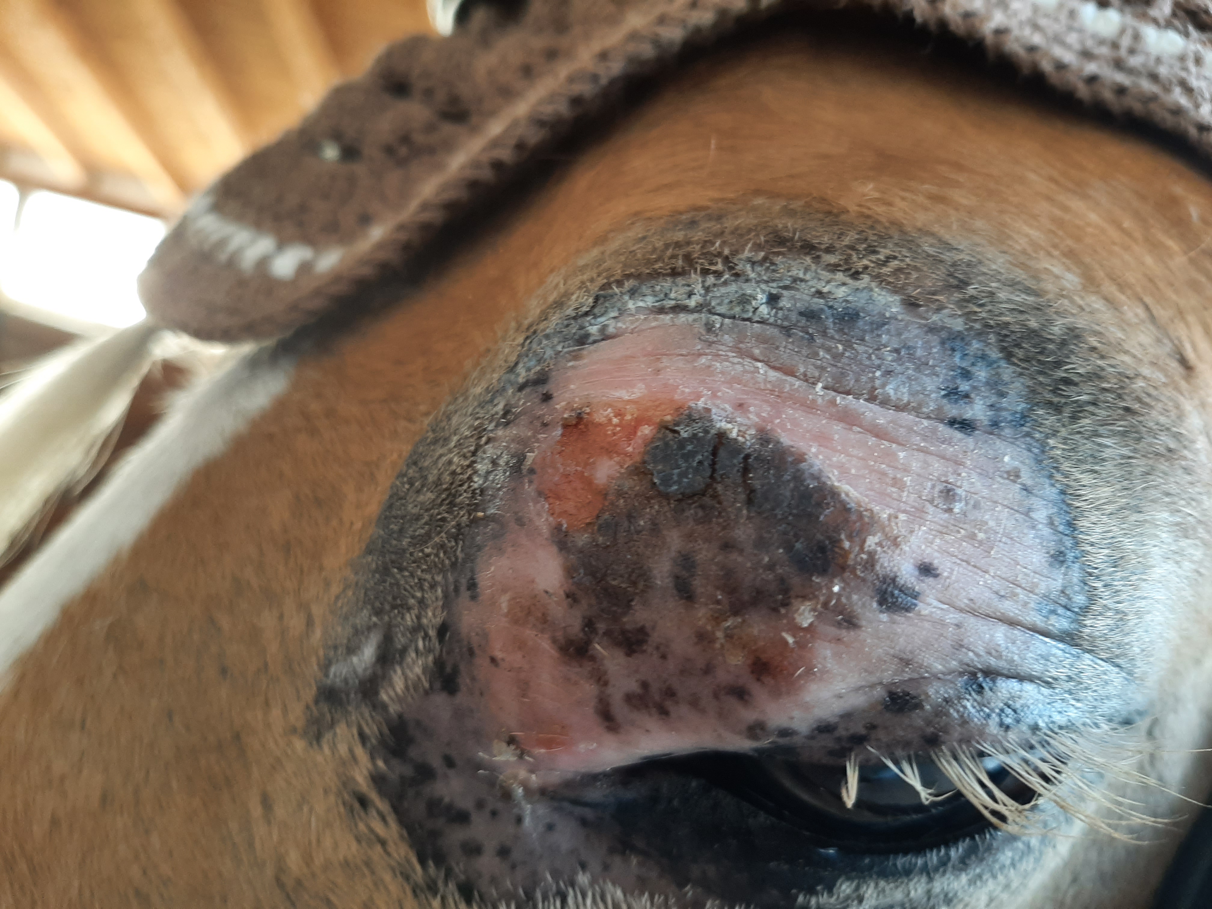 Der Bereich ist jetzt teilweise schuppig und löst sich ab, im Augenwinkel nässend. Die Schhwellung ist ziemlich ordentlich, trotzdem ist das Pony gut gelaunt und für jeden Quatsch zu haben.