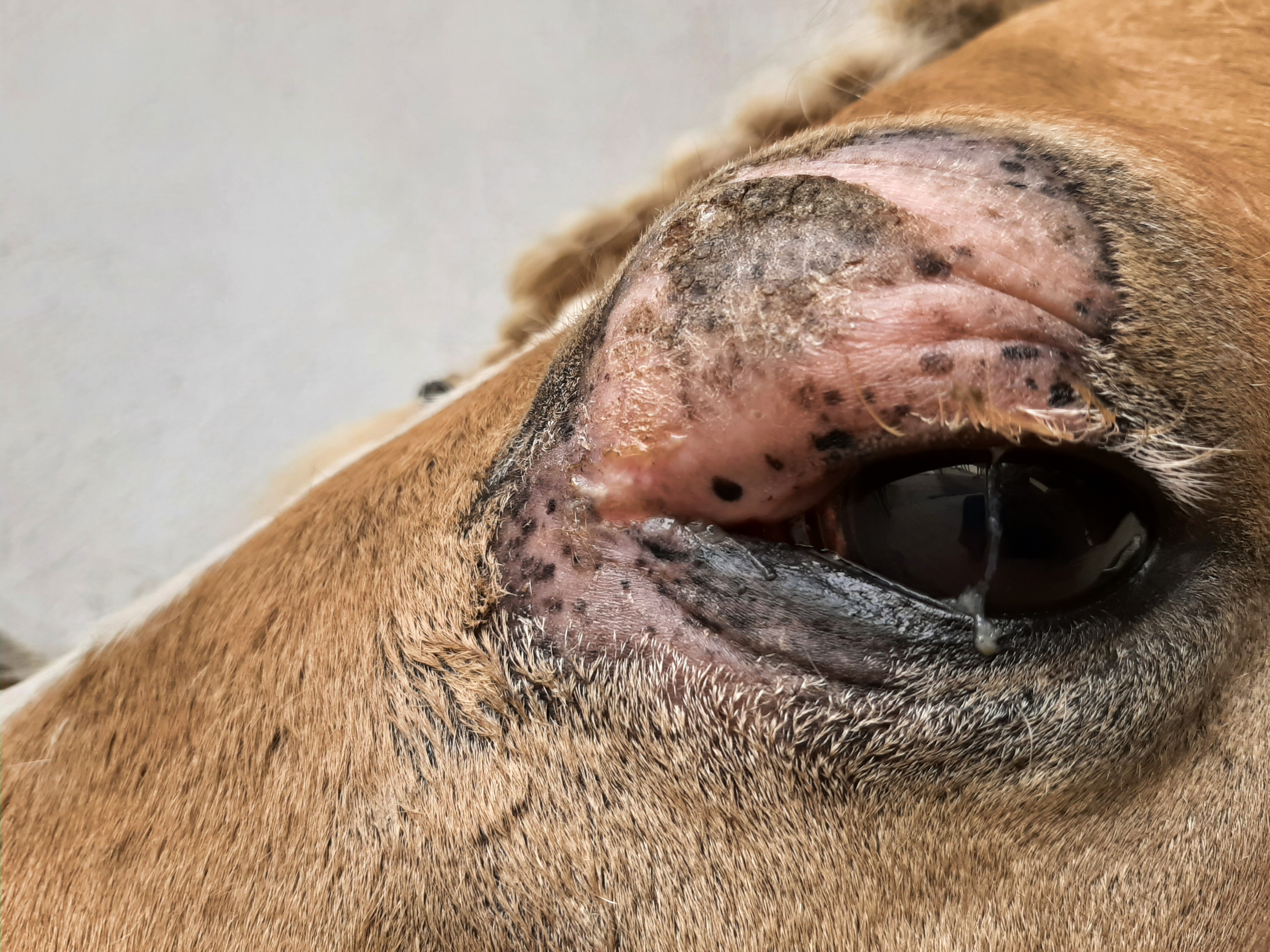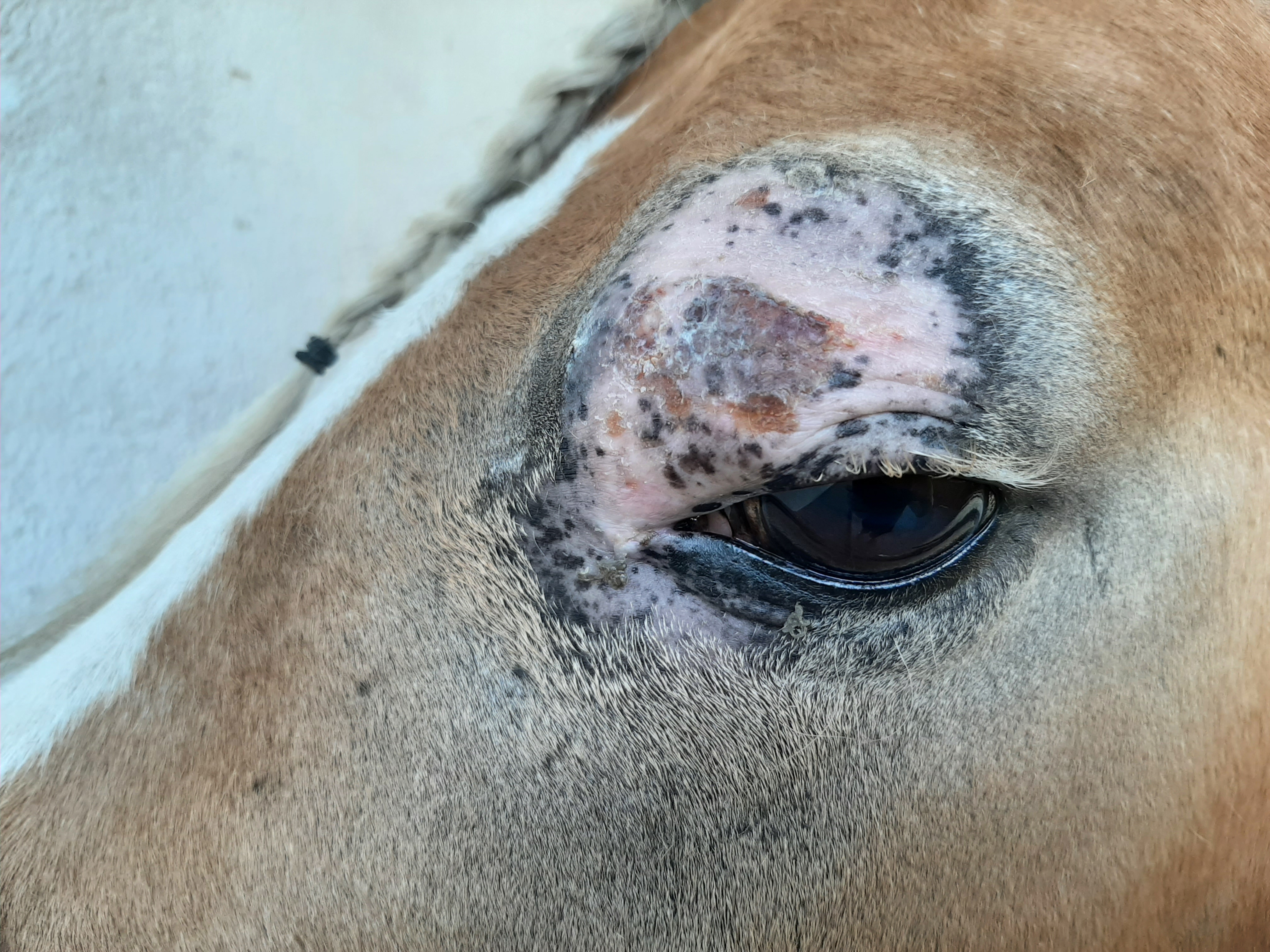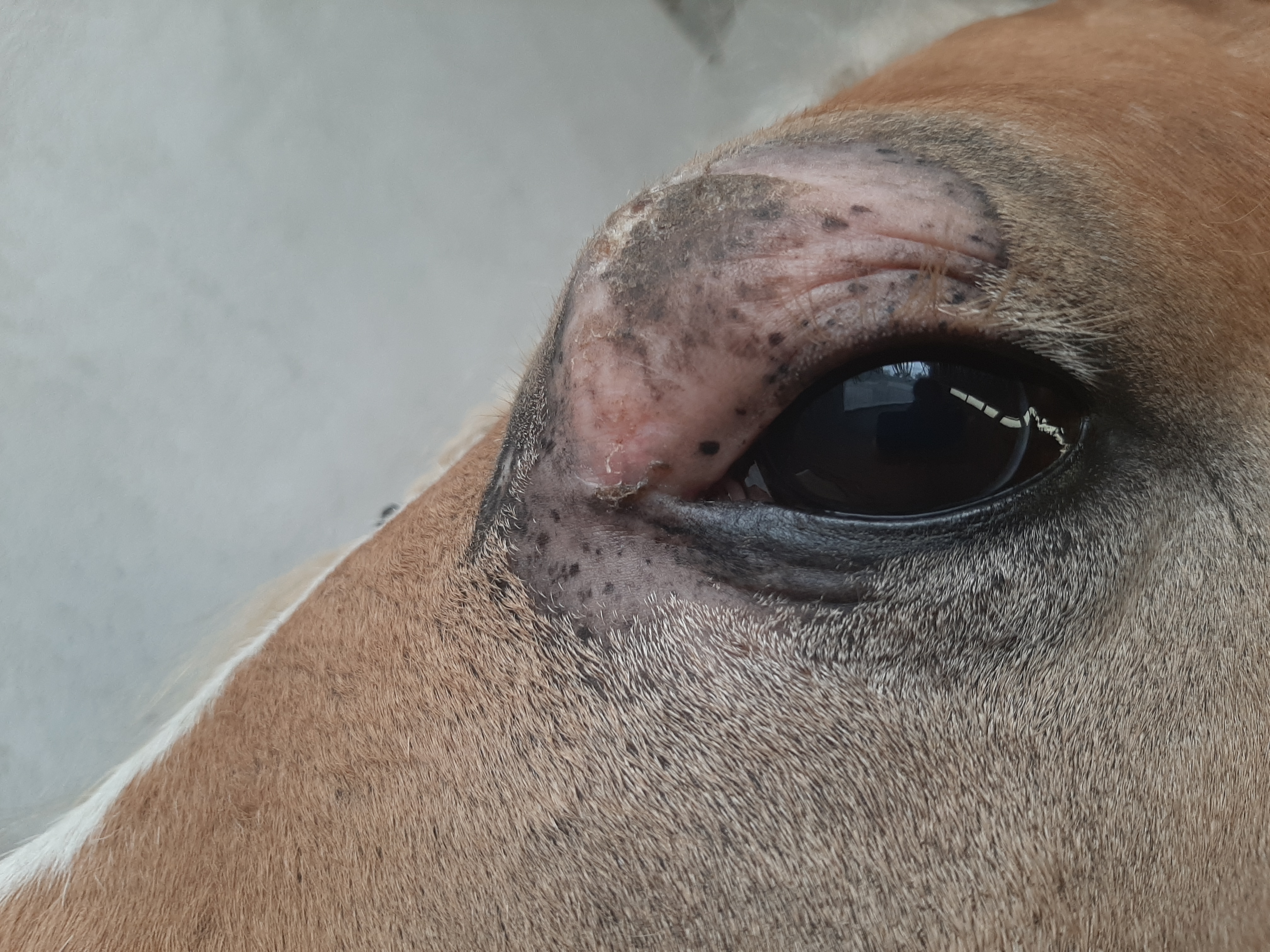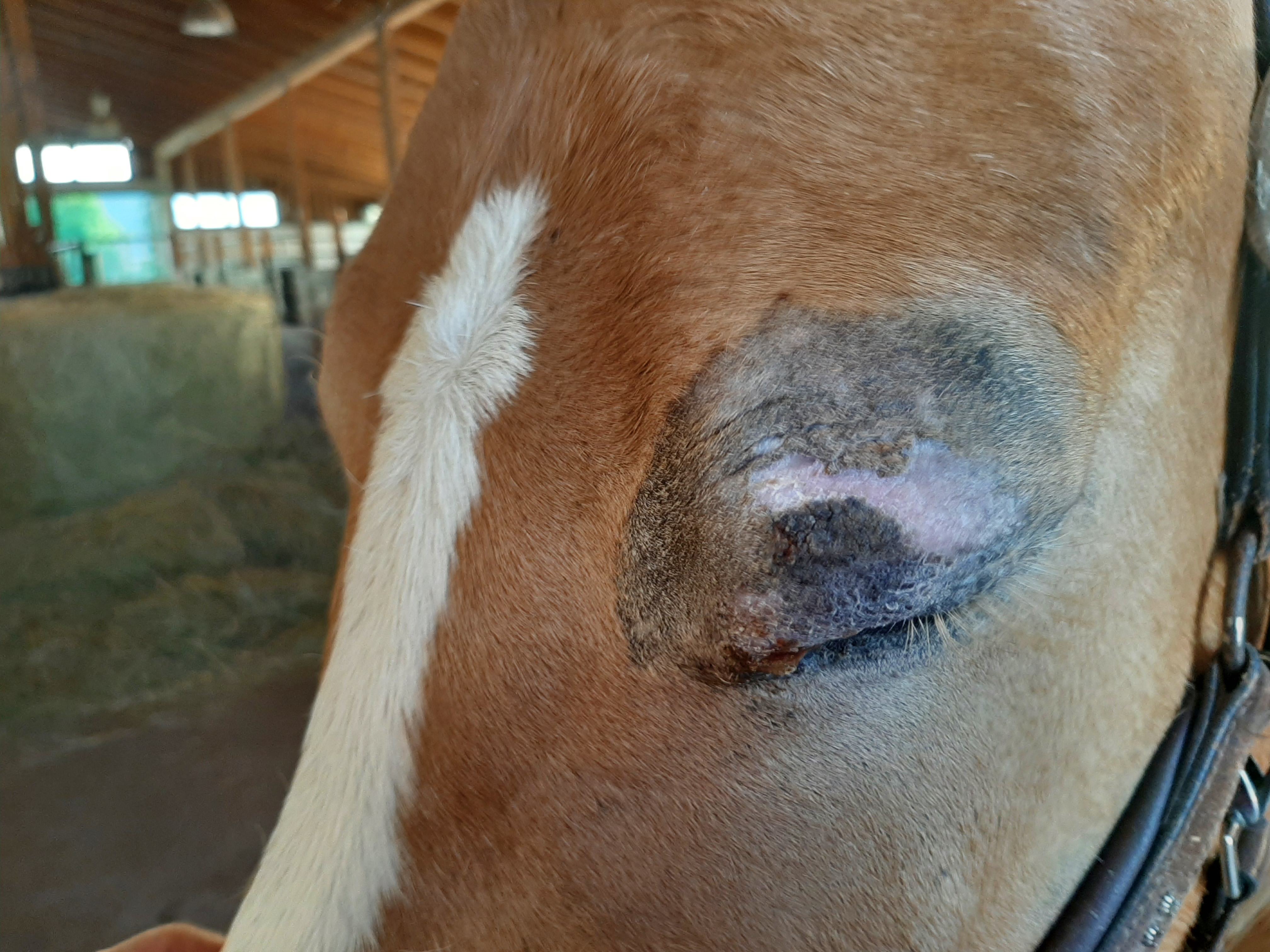 Der Bereich ist jetzt teilweise schuppig und löst sich ab, im Augenwinkel nässend. Die Schhwellung ist ziemlich ordentlich, trotzdem ist das Pony gut gelaunt und für jeden Quatsch zu haben.