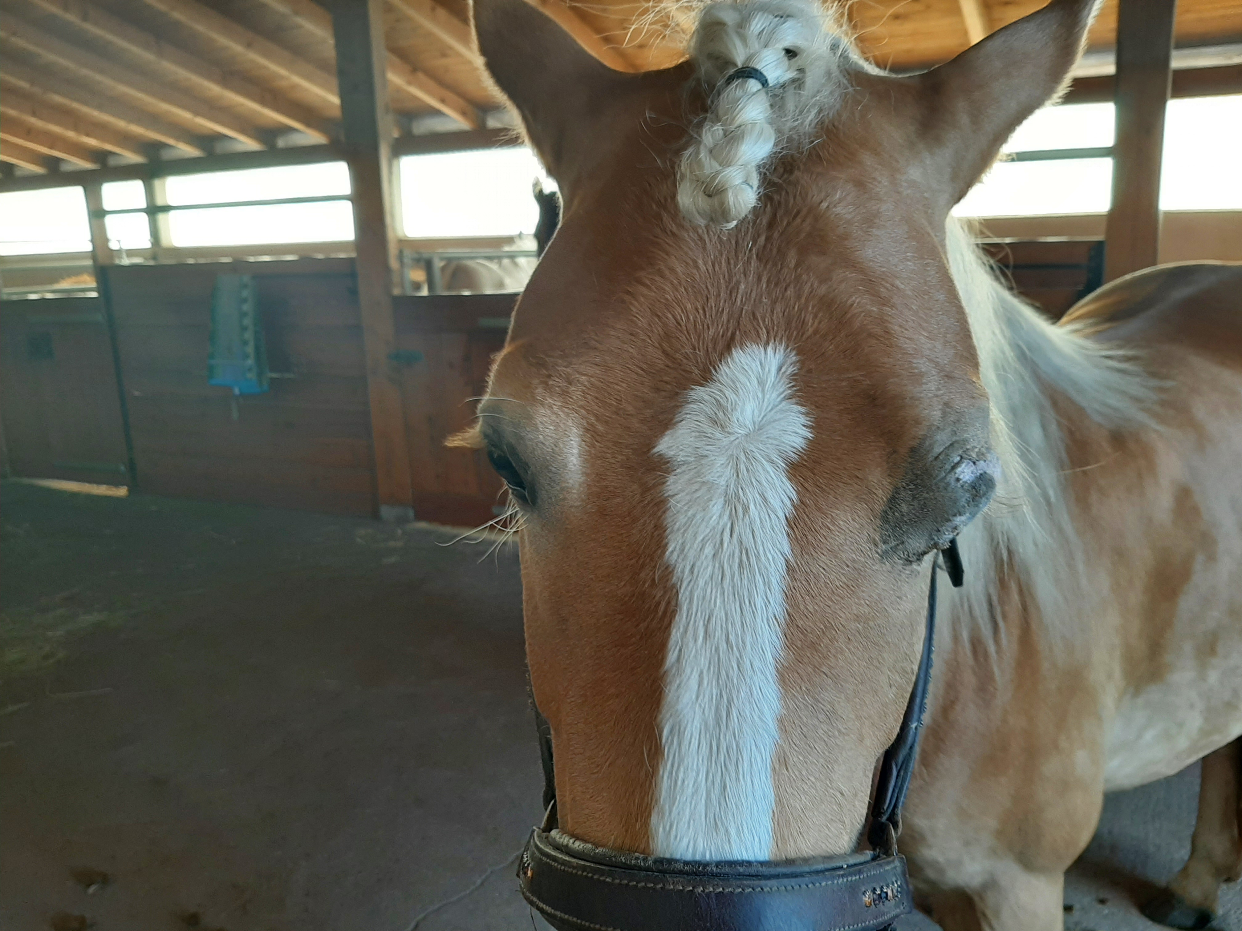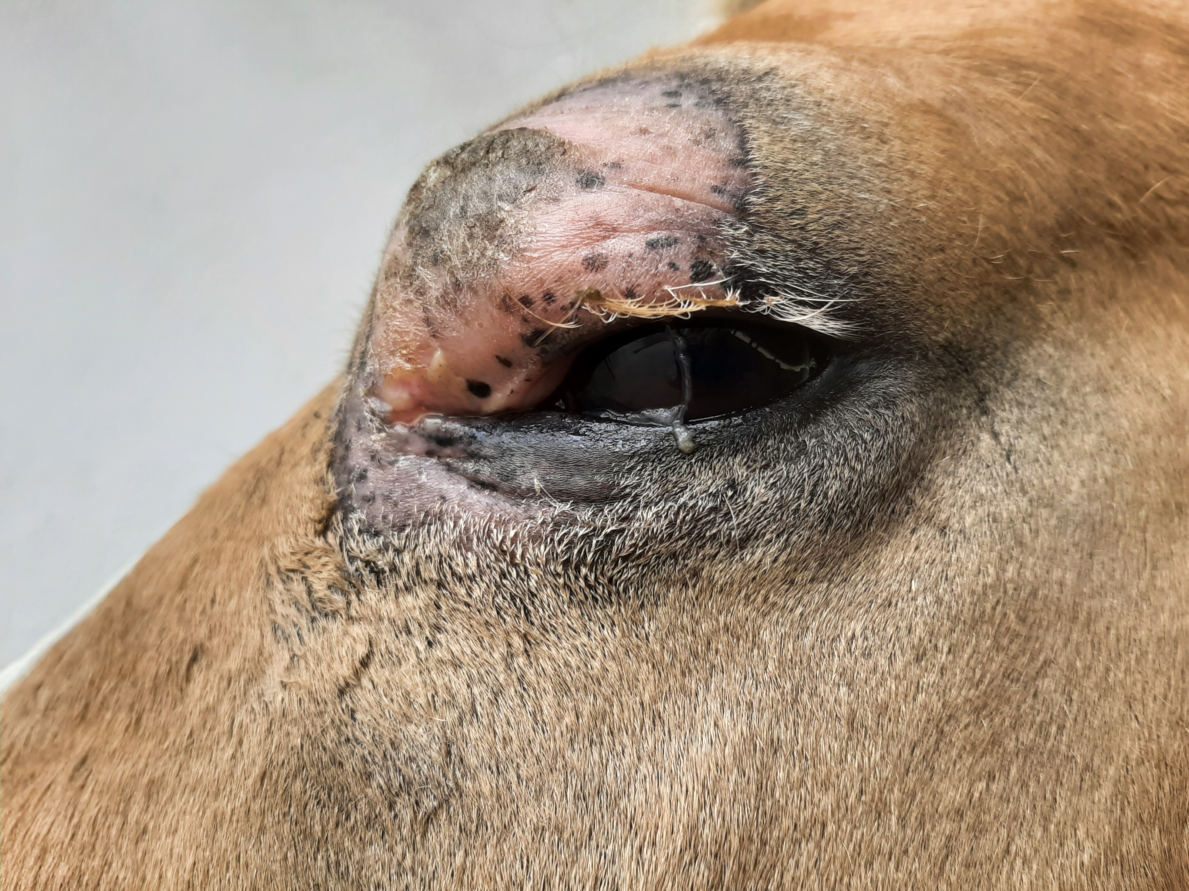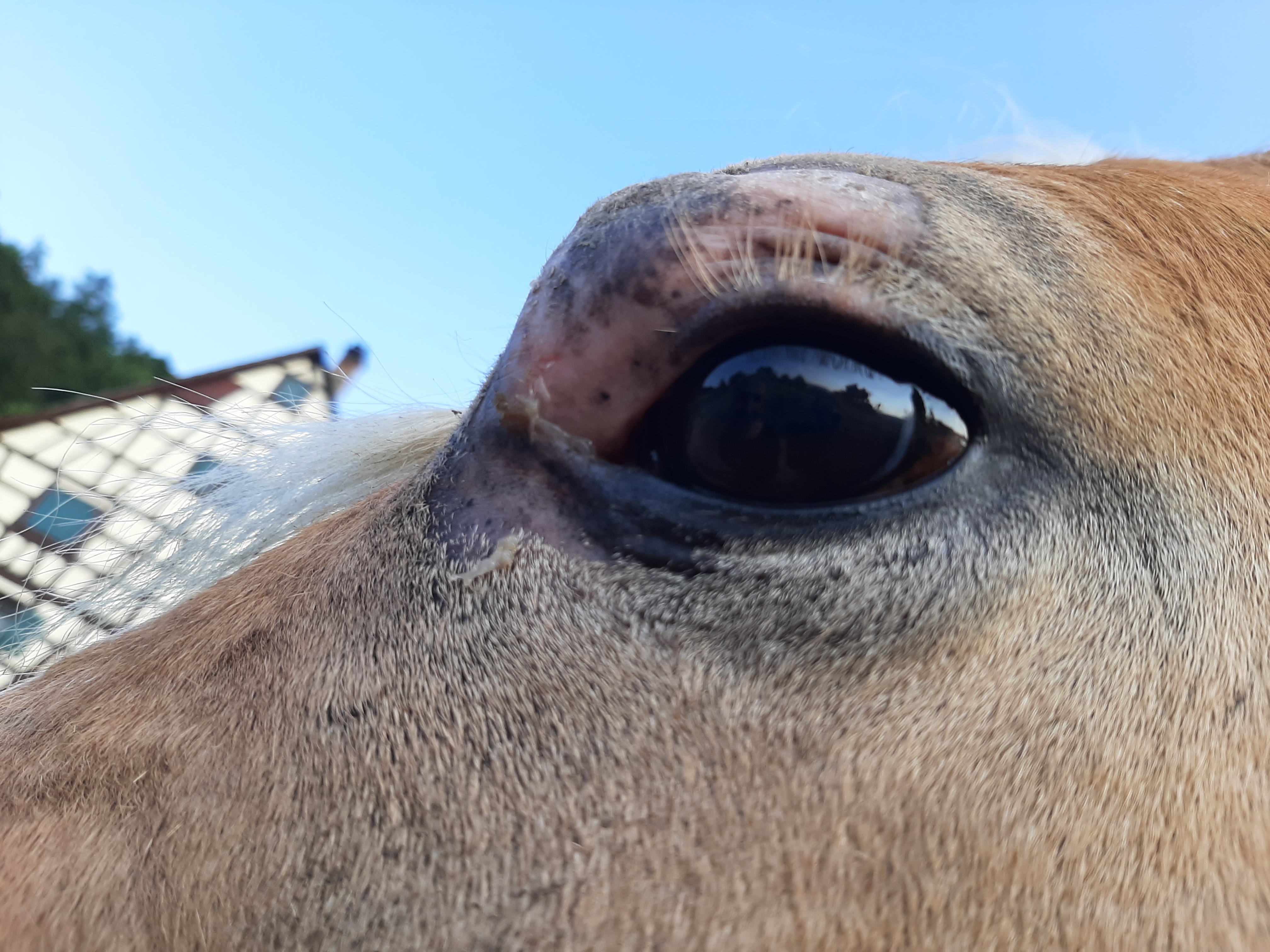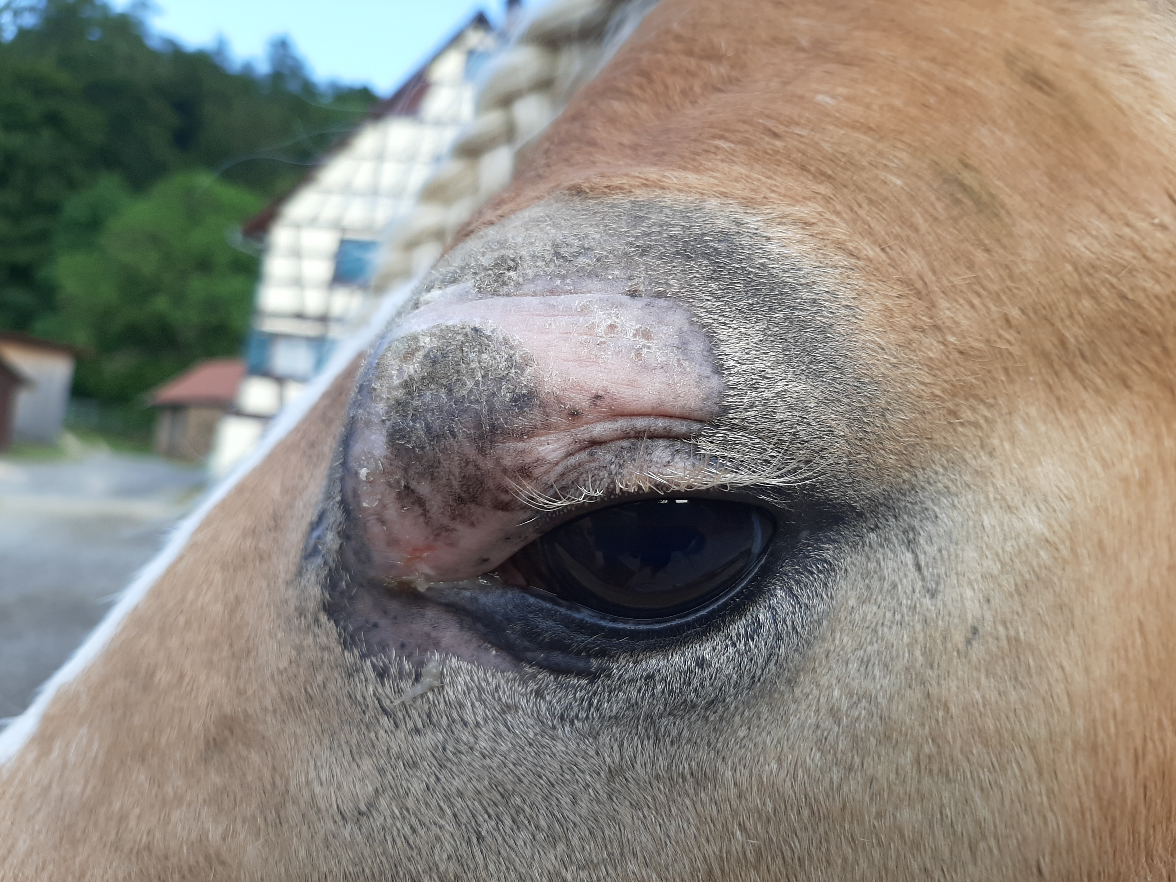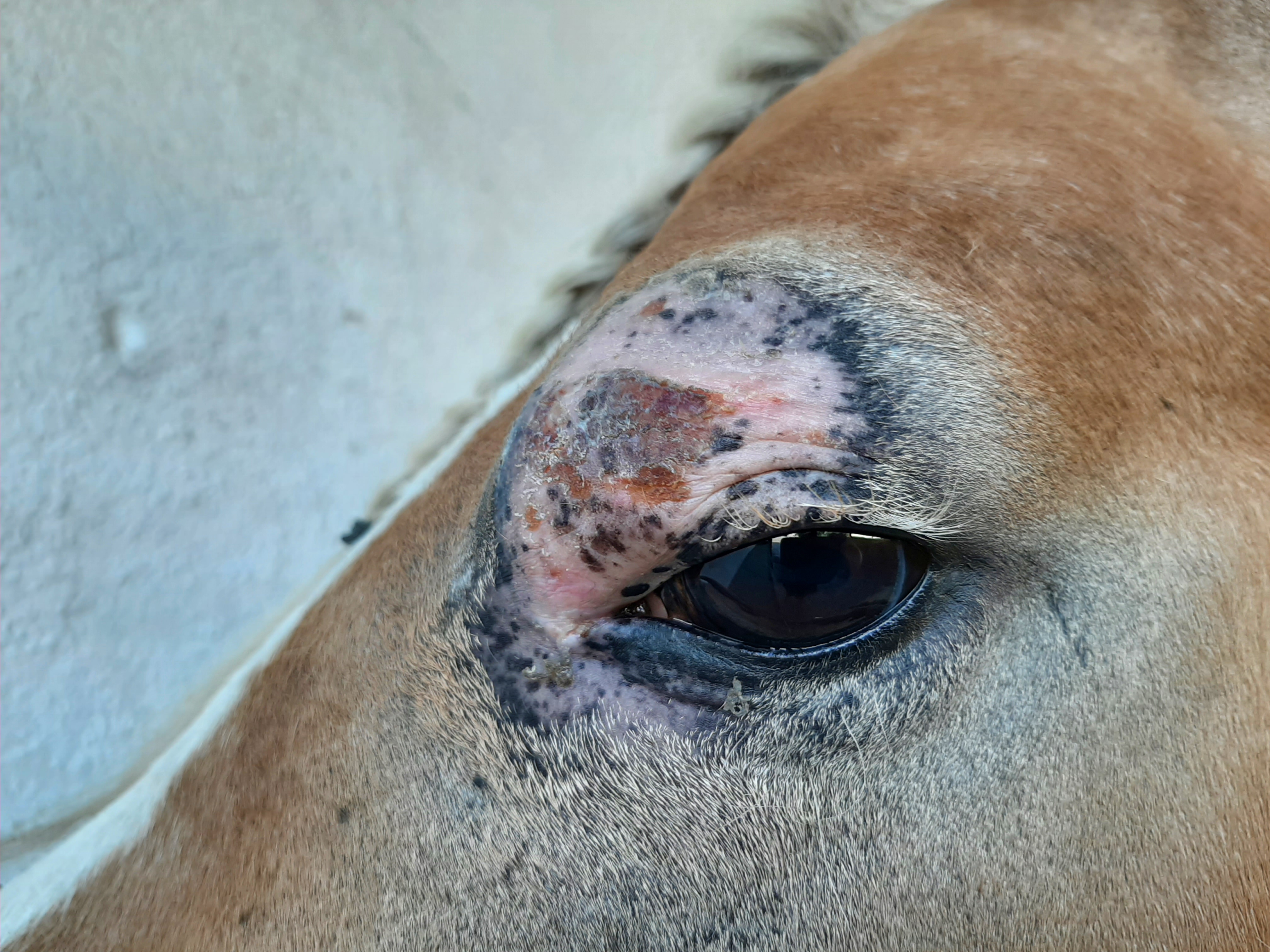 Der Bereich ist jetzt teilweise schuppig und löst sich ab, im Augenwinkel nässend. Die Schhwellung ist ziemlich ordentlich, trotzdem ist das Pony gut gelaunt und für jeden Quatsch zu haben.