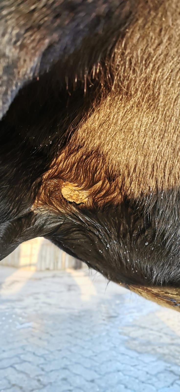 Letztes Jahr im Sommer habe ich angefangen das Sarkoid über das Futter zu 'behandeln', dies hat auch eine Reaktion ausgelöst (). Da es aber nicht zum Erfolg führte hab ich mich im Dezember mit Rücksprache meiner Tierärztin dazu entschlossen mit der Salbe Dermequin zu beginnen. Nach kurzer Zeit reagierten die Sarkoide und mir wurde erstmal bewusst, das wir nicht nur ein Sarkoid haben sondern 8