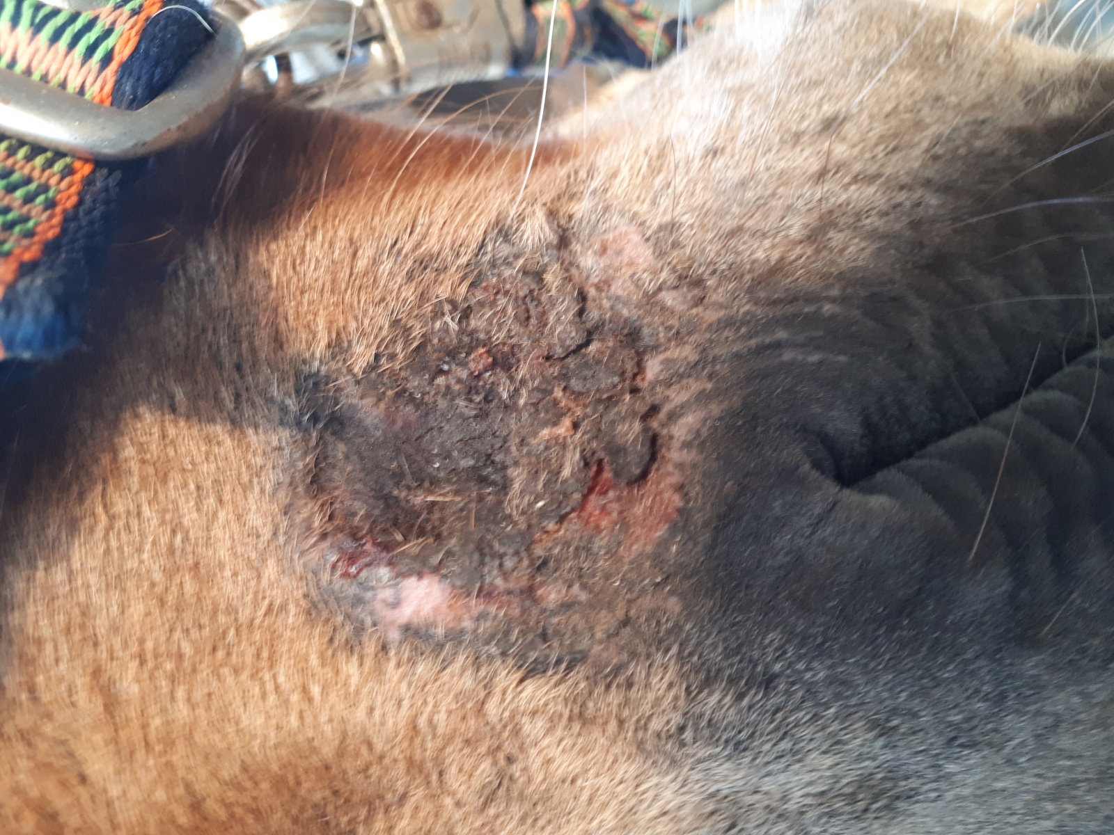 Leider habe ich am rechten Vorderbein eine schorfige, haarlose Stelle gefunden ... Die wird nun auch behandelt. Mal gucken, wie die reagiert!