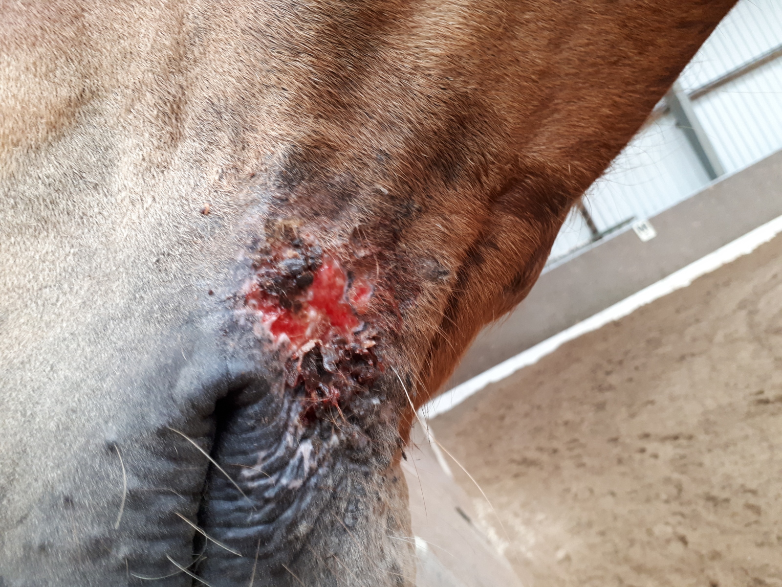 Die Kruste hat sich dann während des Reitens uuund beim ausgiebigen Kratzen danach, gelöst und es klaffte doch eine ganz schöne Wunde. Ein Teil Kruste sitzt noch fest. Auf die Wunde habe ich direkt wieder compx geschmiert, hoffentlich war das richtig..?