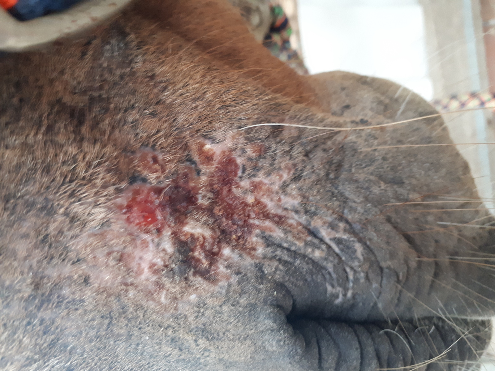 Als ich in den Stall kam konnte ich gleich sehen, dass sich die dicke Kruste, die sich in den letzten Tagen entwickelt hat, zu lösen begann. Davon gibt es das erste Bild. Ich hab mich dabei die letzten Tage die ganze Zeit gefragt, was davon wirklich alles sarkoid ist und was davon getrockneter Siff ist