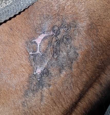 Es ist aber seit 2 Wochen irgendwie "gleich". Immer noch 2 rosa Stellen und der Rest drum rum ist dunkel, von außen wächst Fell nach, aber innen drin ist es immer noch so ähnlich wie Narbengewebe.