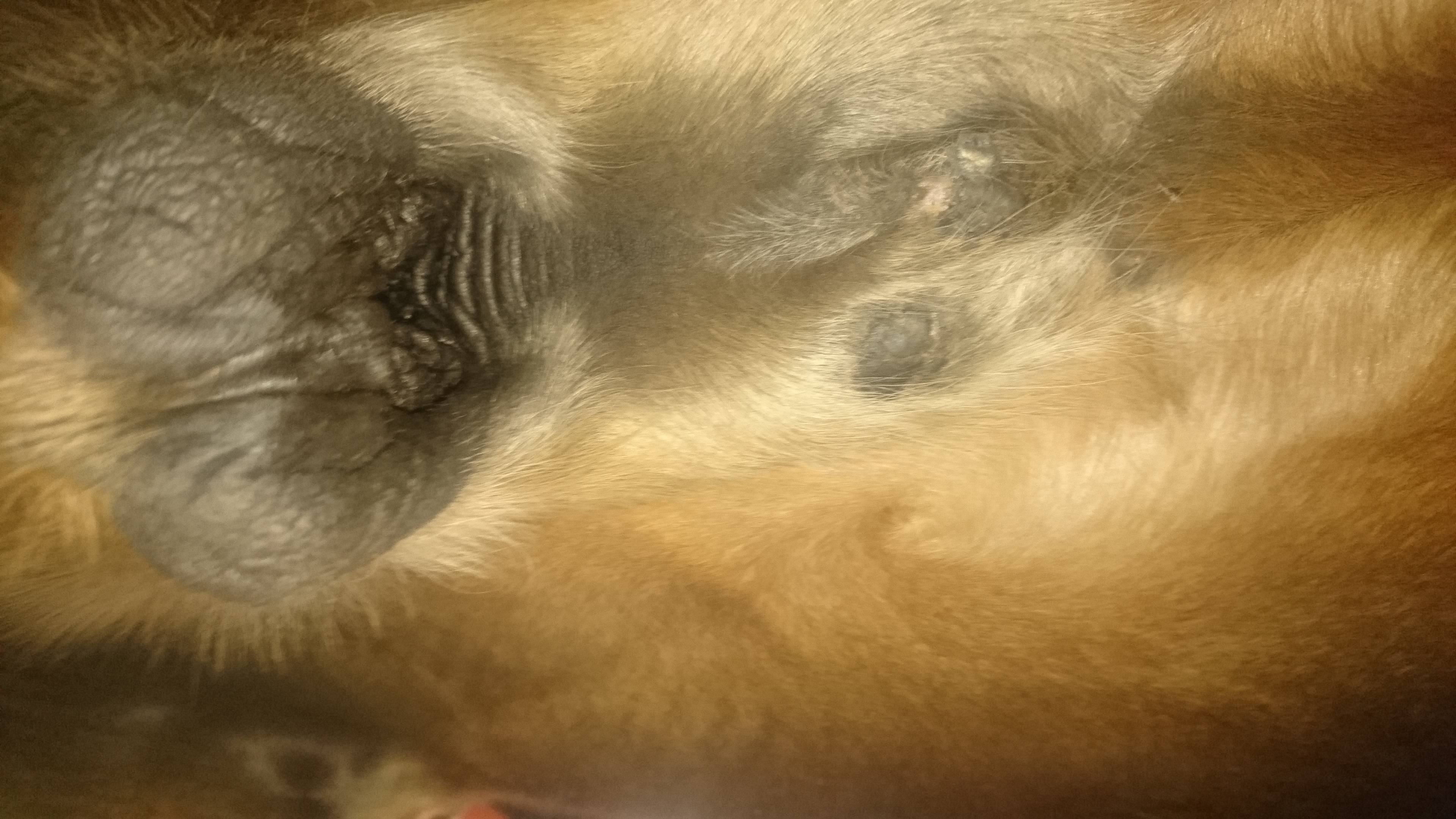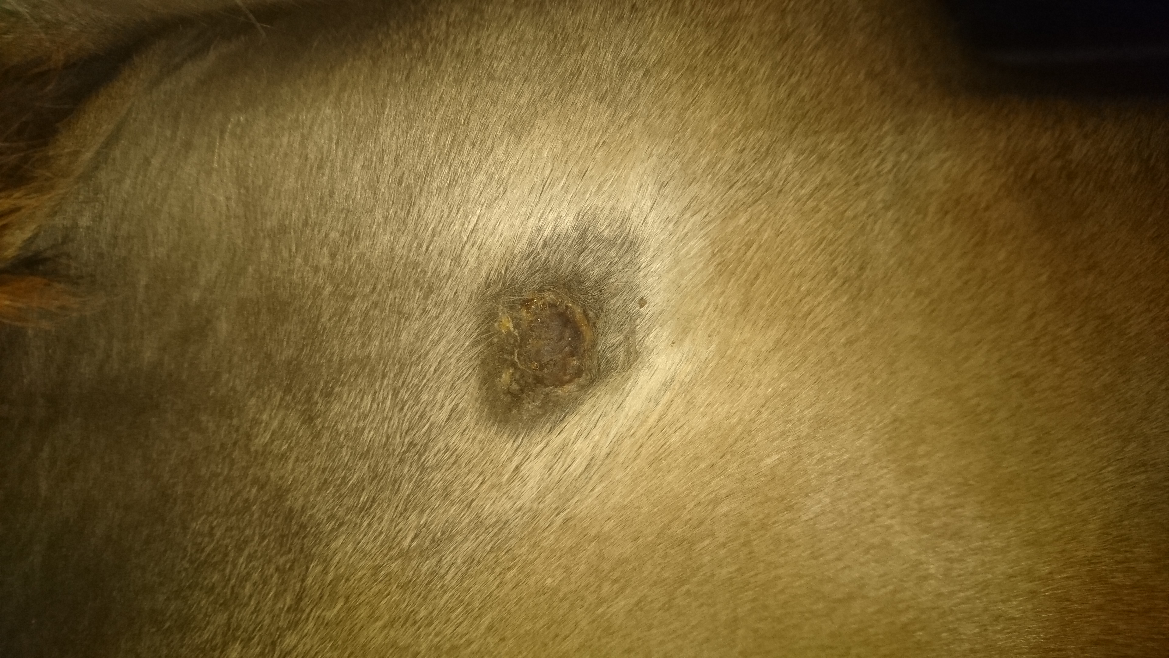 Bild 1 und 2 sehen eigentlich nach Kruste aus (wobei bei Bild 1 so helle Flecken an der Bauchnaht sind - ist das auch Sarkoid? abgeheiltes Sarkiod? abgefallene Kruste? auf dem Bild scheinen mehrere Baustellen zu sein)
