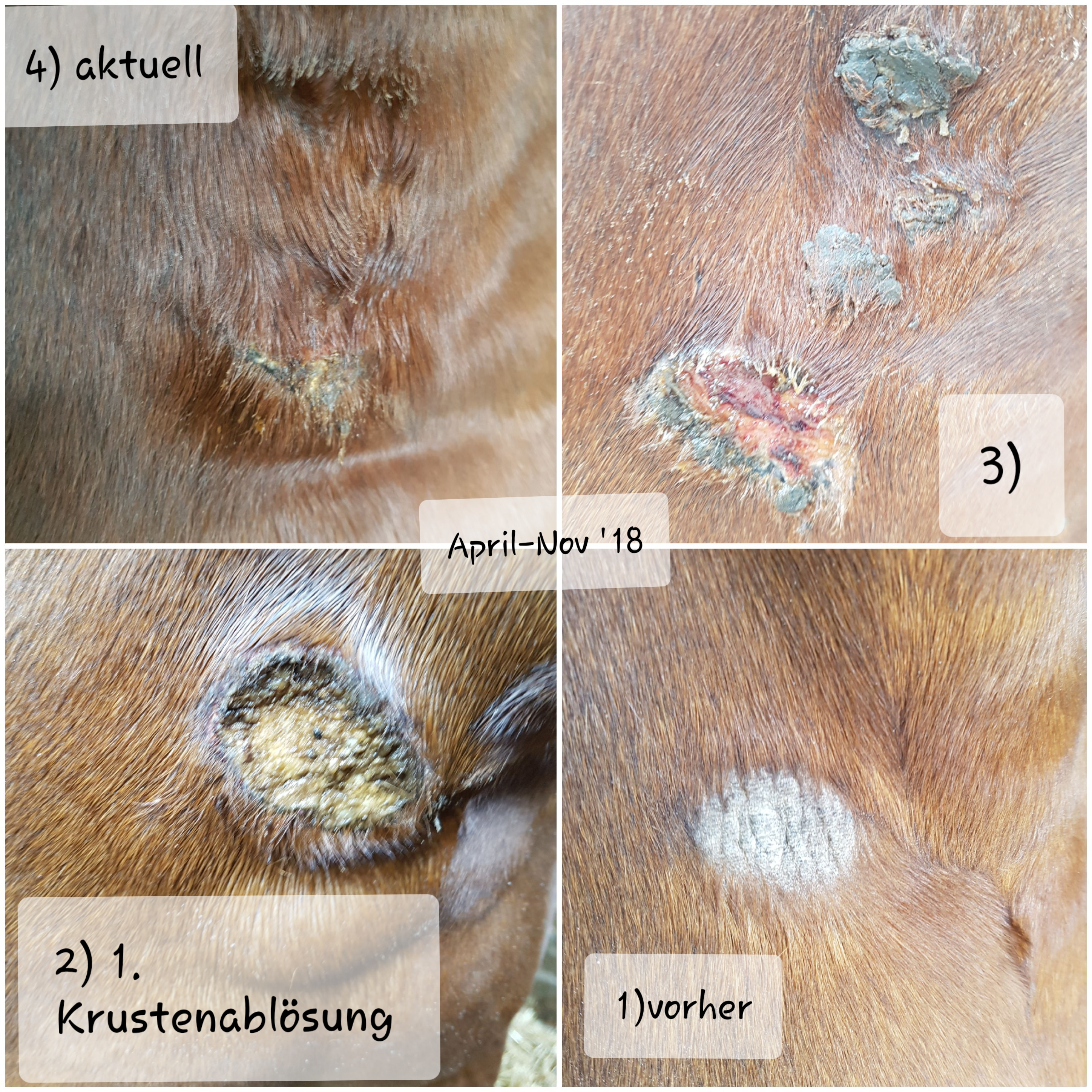 Am Hinterbein halten die Krusten nicht so lang, bzw es fehlt halt immer mal ein Stück Kruste mal hier mal da.