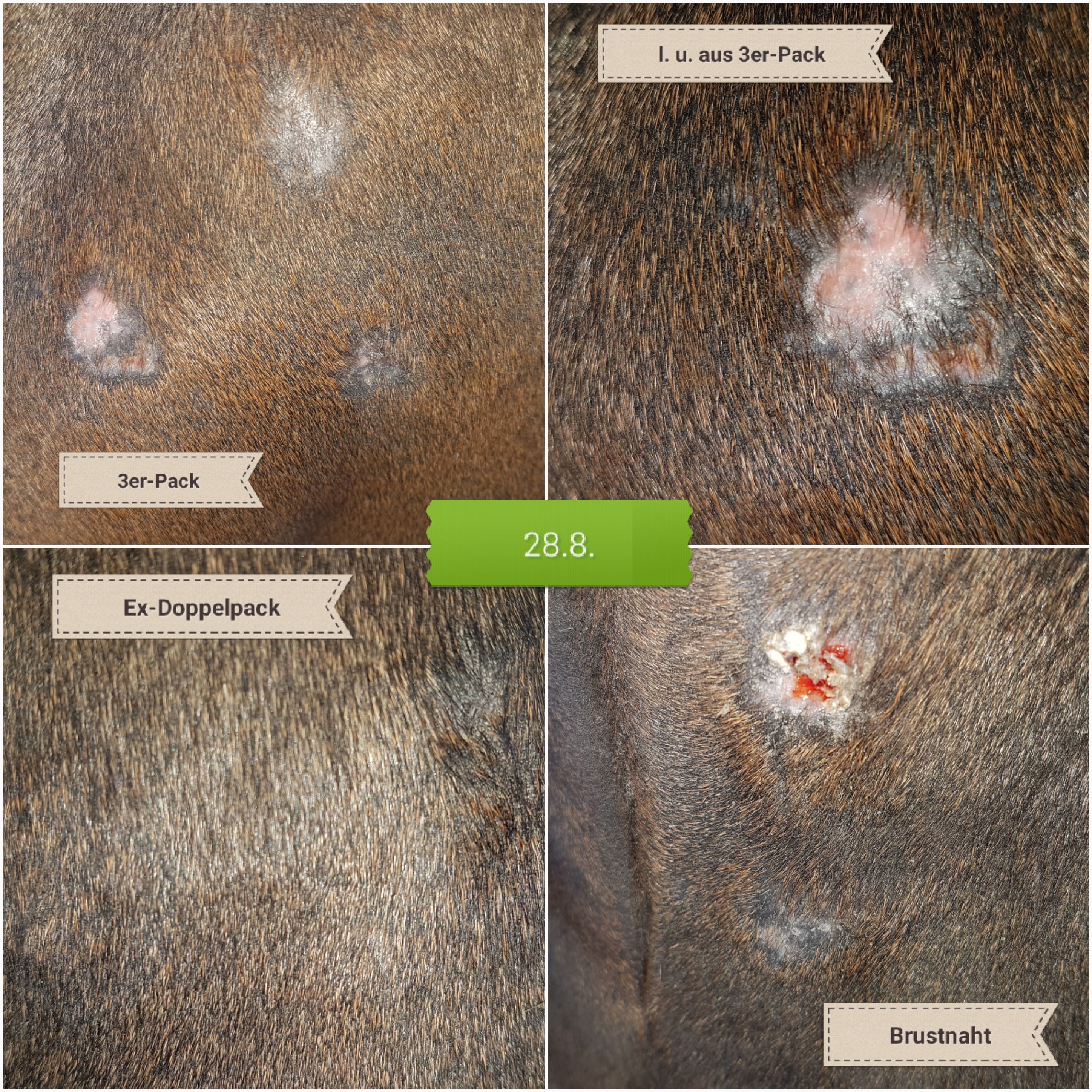 So, die Krusten haben sich gestern mal wieder gelöst (die an der Brustnaht auch nach dem Schmieren, aber da war das Foto schon gemacht). Ich bin verhalten optimistisch. Überall sprießen langsam Haare (auch im 3er-Pack l.u.), aber ich schmiere weiter (verdünnt und nur noch 2x pro Woche bzw. nach Gefühl) und beobachte argwöhnisch. Besonders freut mich die Achsel, denn gerade bei dem Riesending (siehe Foto vor 6 Wochen zum Größenvergleich) scheint es größtenteils gegessen zu sein (der kleine Punkt oben drüber ist weg und auch die ferne 14-Uhr-Stelle ist nichts Neues). Beim Doppelpack ist nur noch eins erkennbar, das "mittendrin" und "kleiner Scheißer" sind schon länger nicht mehr auffindbar, sprich: Fell drüber, Haut weich, keine Rückstände.