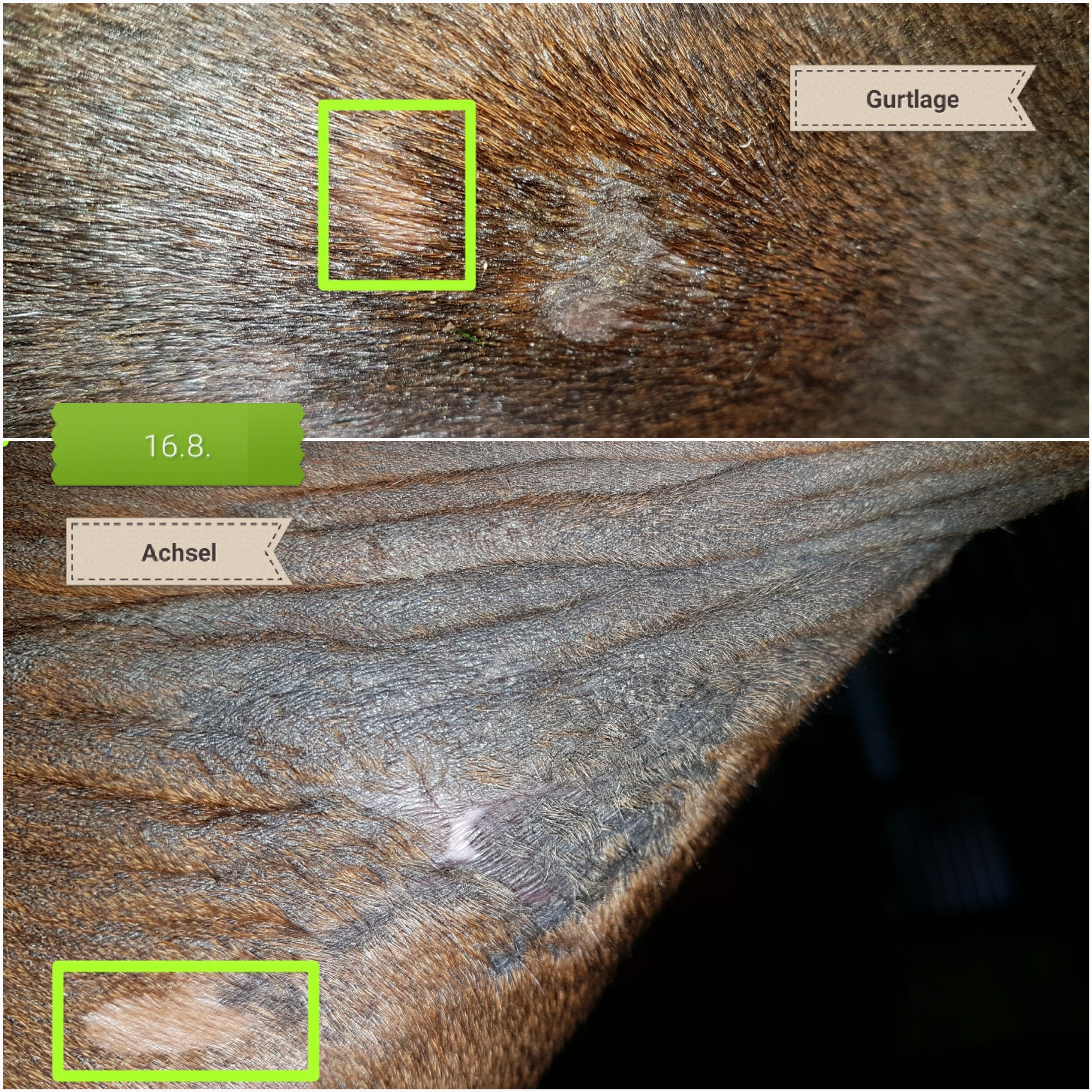 So, jetzt muss ich doch mal in die Runde fragen: die Sarkoide in Achsel und Gurtlage sehen täglich besser aus, aber unter dem Achselsarkoid und neu (?) auch hinter der Gurtlage sind so helle Stellen (grün eingekästelt). Hatte so was schon mal jemand? An der Achsel ist mir das schon länger aufgefallen, an der Gurtlage so richtig eigentlich erst heute. Was denkt Ihr, was das ist? Kennt das jemand?