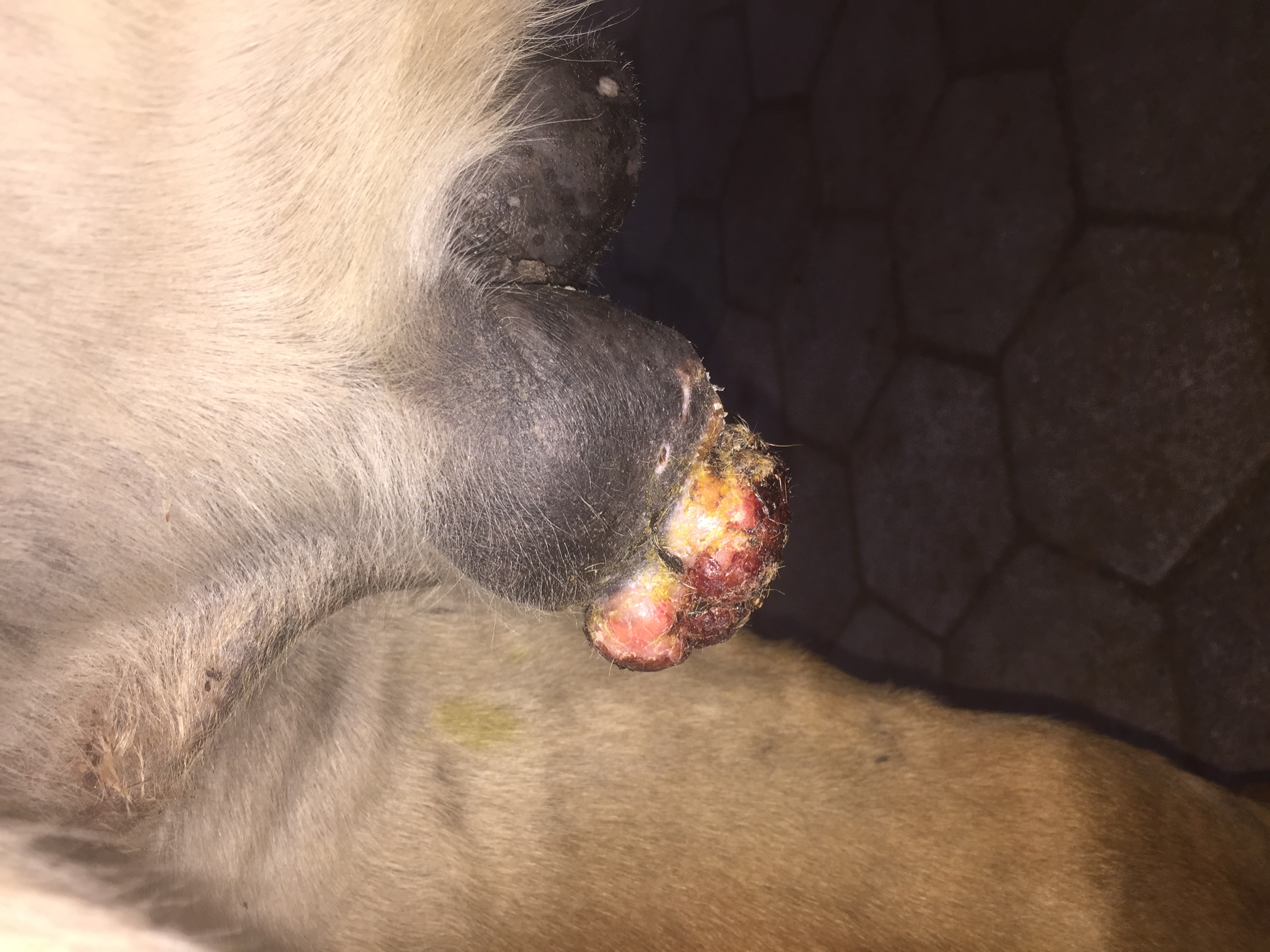 Anbei ein Foto von der Schlauchtasche vor der Operation (18.09.). Das Sarkoid kommt jetzt schon wieder.