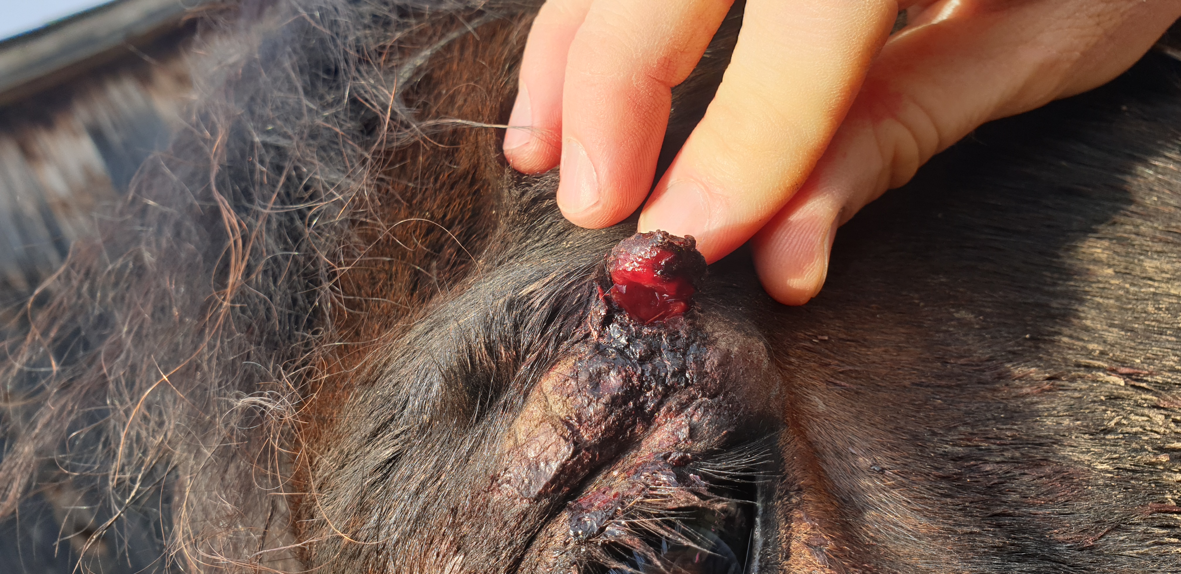Die Verletzung auf dem Bild kam wohl vom Tritt eines Spielkameraden auf der Koppel...