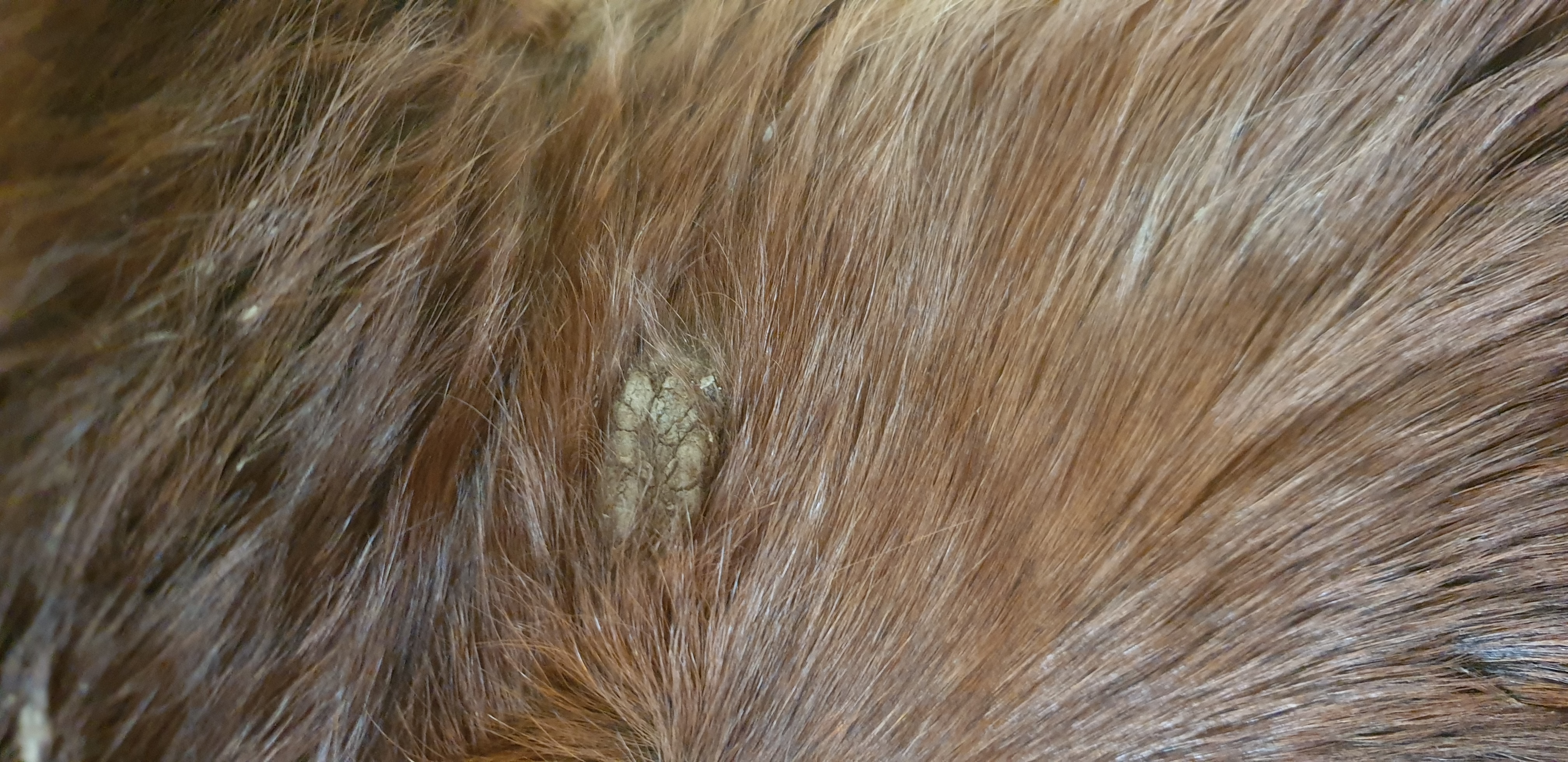 Wie lange er diese haarlose Stelle schon hatte, kann ich nicht sagen, weil der genau dort ja eine ziemlich fette Verletzung hatte, ich hänge das entsprechende Bild mal an.