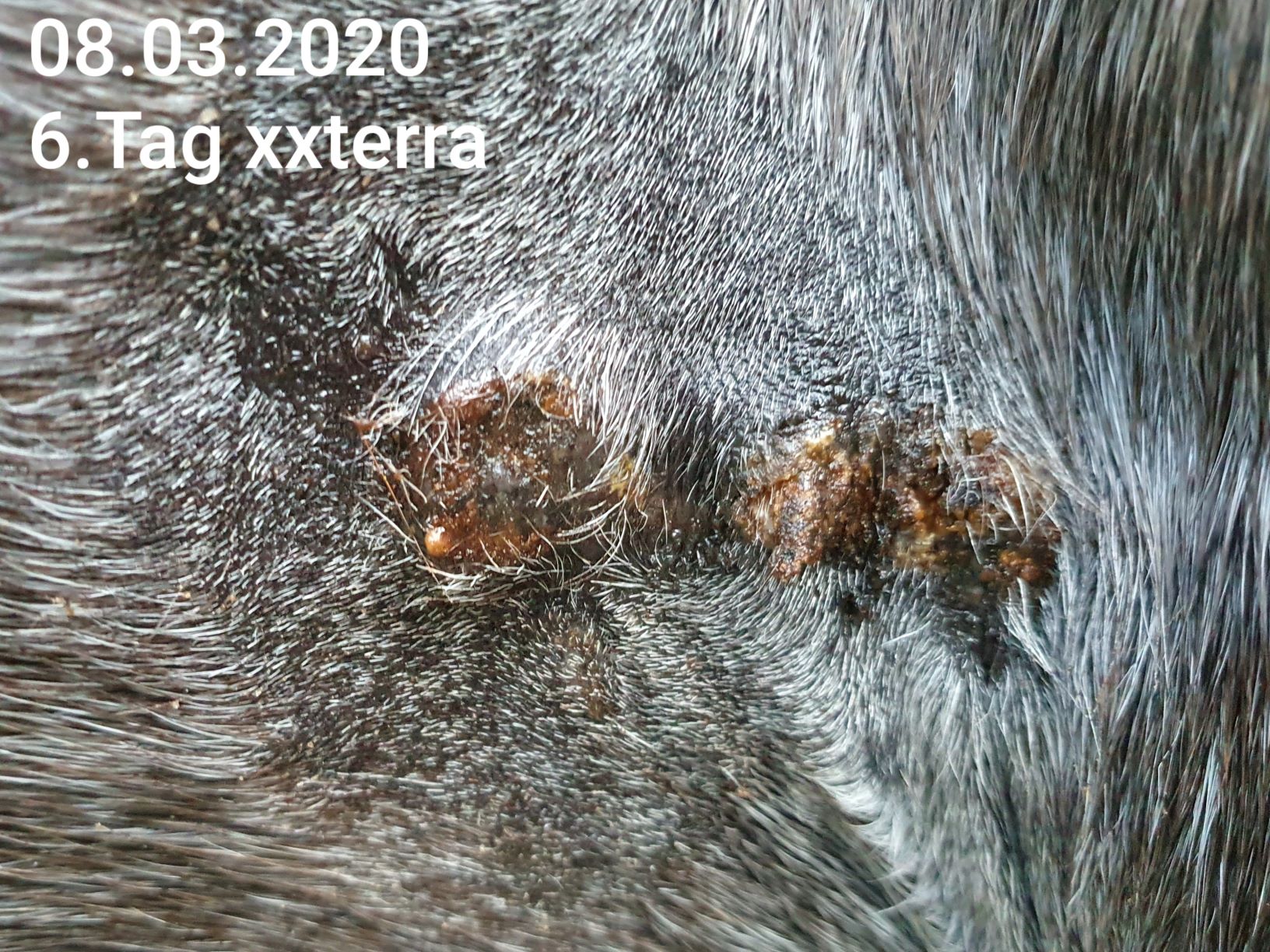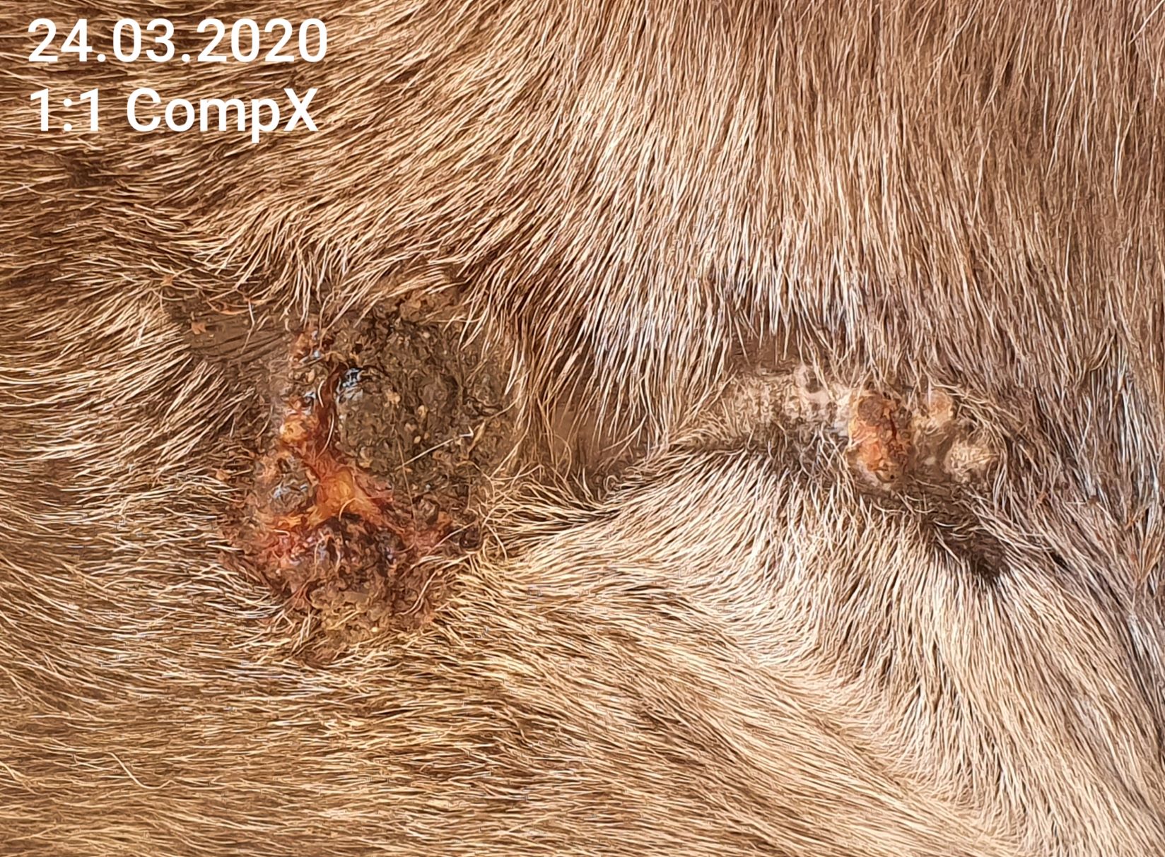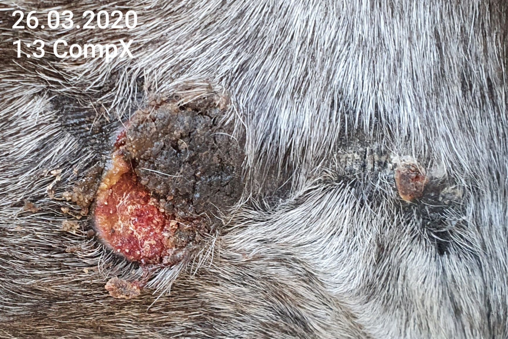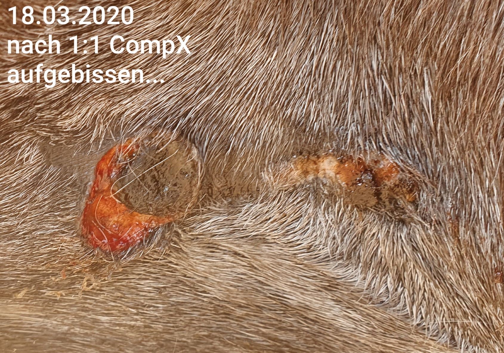 Inzwischen decke ich rundherum nicht mehr mit Melkfett ab, da die Haut daneben auf das CompX tatsächlich nicht so extrem reagiert. Auf dem Bild sieht man jedoch auf der abheilenden Stelle rechts einen krustigen Nubsi, den ich mit Argwohn beäuge...könnte das auch Sarkoidgewebe sein? Der Rest heilt ja schön rosa ab und pigmentiert sich wieder.