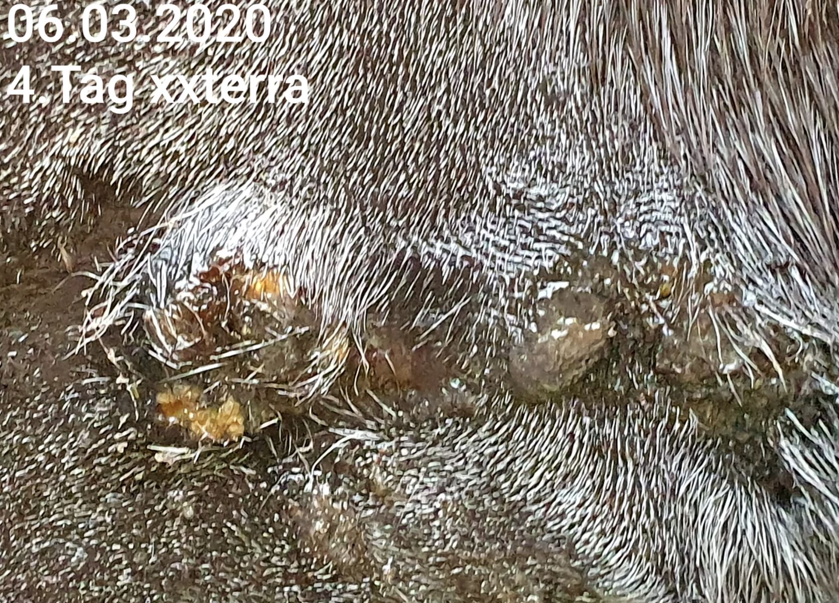 Am zweiten Tag war ich wohl etwas zu mutig, da der Herr sich das Schmieren mit 1:2 CompX am Vortag so gut gefallen liess und auch das rechts danebenliegende gereizte Gewebe über Nacht zur Ruhe kam, habe ich am 2. Tag CompX 1:1 geschmiert. Leider wurde ich sofort bestraft: Mein Pferd hat sich sofort mit einem Mal die Kruste abgebissen... Nun haben wir ein offenes Spiegelei mit zäher Nuss... Ich weiß leider nicht genau, ob es tatsächlich die 1:1 Mischung war die massiv gejuckt hat oder eine der blöden Fliegen, die ihn dort geärgert haben. Er ist extrem kitzelig an den Stellen (auch auf seiner anderen gesunden Seite). Fakt ist die schöne Kruste ist ab.