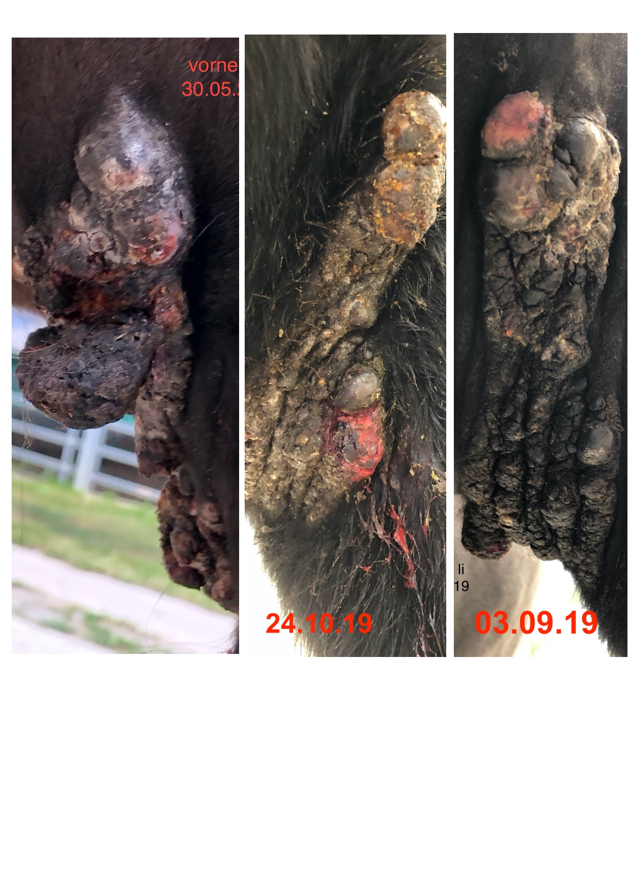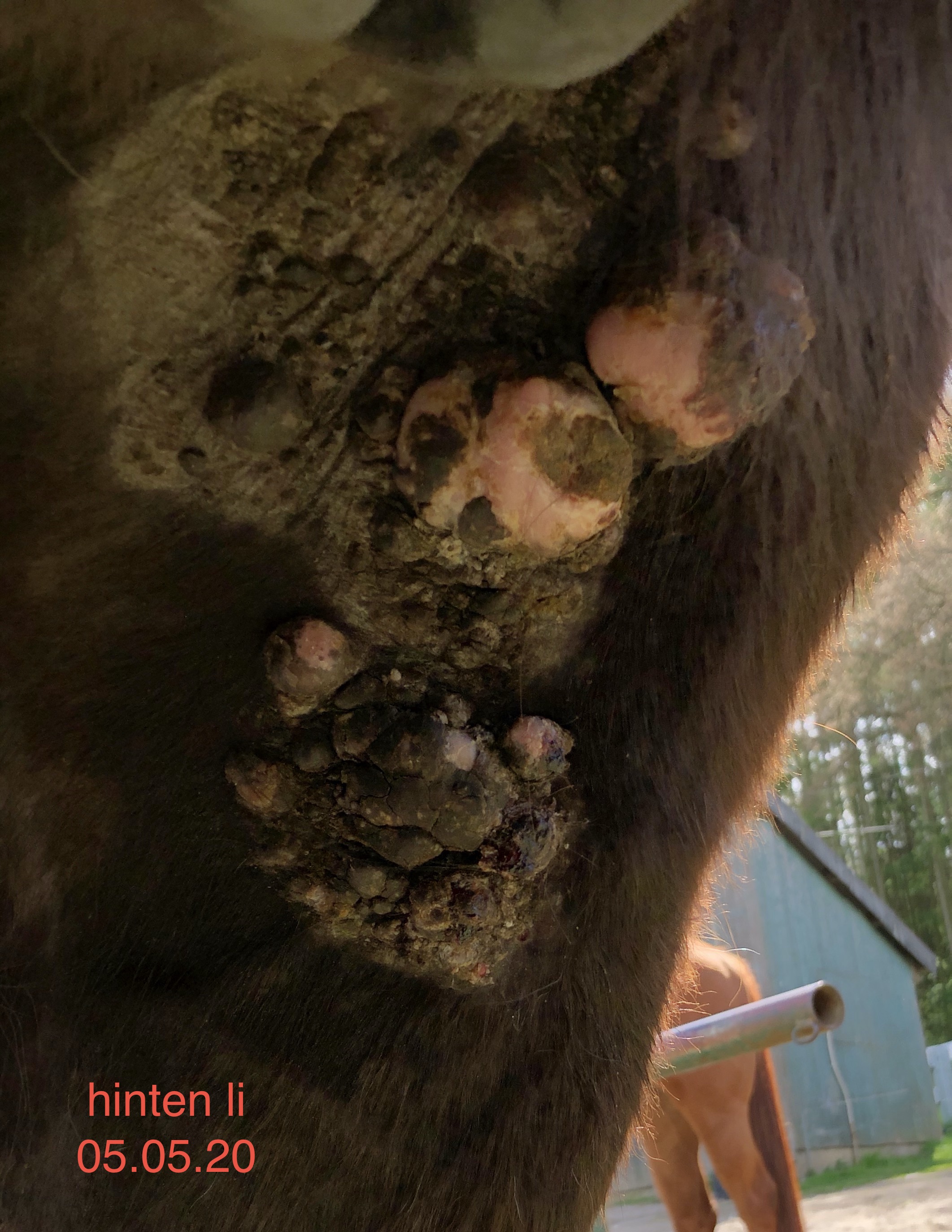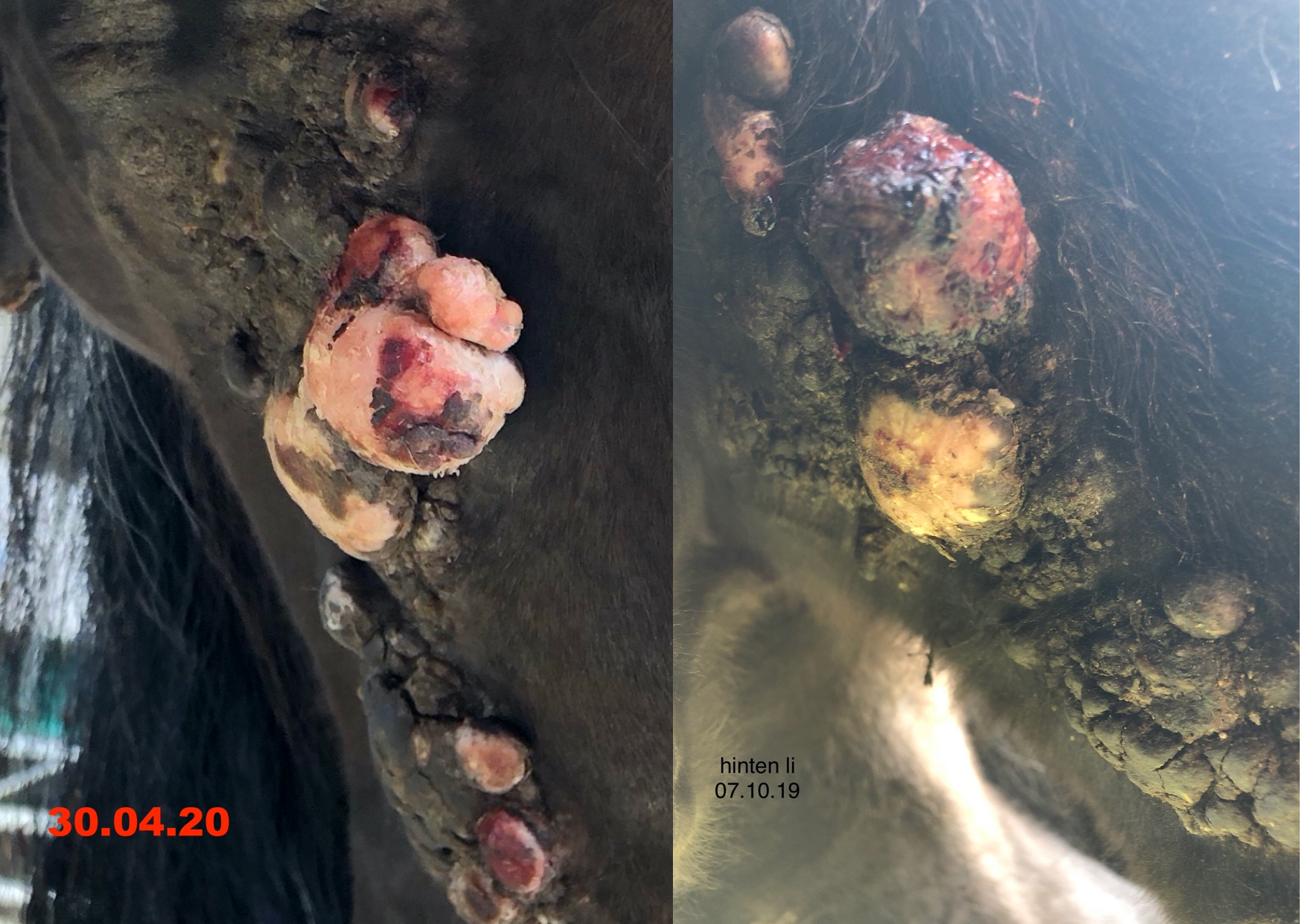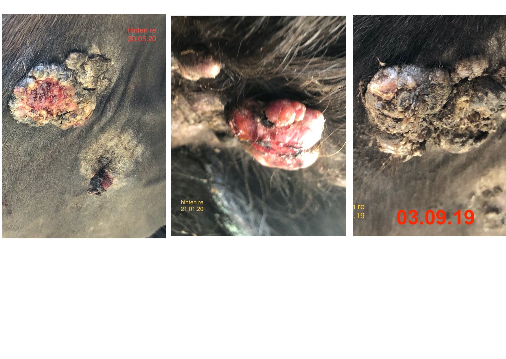 Ich gebe nicht auf, sondern schmiere regelmäßig. Ich habe bisher auch keine Schmierpause eingelegt, da er sehr viele Sarkoide hat. Hier ein paar Fotos.... ICH sehe Veränderungen und bin zuversichtlich. So viele Tumore verschwinden nicht über Nacht. Ich schmiere jetzt seit 8 Monaten. Die Dinger wachsen und fallen ab. Manchmal kommen neue, dann weiß ich, es sind noch kranke Zellen da. Manchmal kommt auch nichts mehr. Und dann freue ich mich wie eine Schneekönigin. Dem Pferdchen gehts aber ansonsten super gut. Er mag das Einschmieren nicht, versucht aber, brav zu sein.