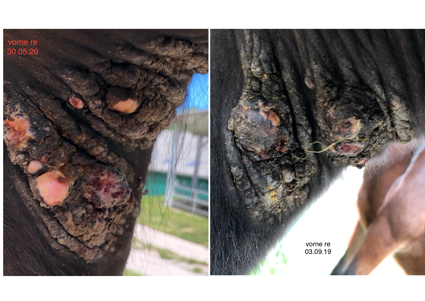 Habe mir mal die Arbeit gemacht, und einige Bereiche gegenübergestellt. Jetzt, wo es ein wenig wärmer wird und er wieder auf der Sommerkoppel stehen darf, tut sich eine Menge. Ich bin zuversichtlich, auch wenn es auf den Fotos sehr schlimm aussieht. Wir haben alle Zeit der Welt. Klar, CompX ist sehr teuer. Ich verbrauche 100g im Monat (Verdünnung 1:1). Aber es ist die erste Salbe, die wirklich hilft. Wir haben sehr viel vorher probiert. Homöopathie (Thuja und den anderen Namen habe ich leider vergessen), Besprechen, Futter von Dr. S. Weyrauch, AloeVera, Silberwasser....) Nichts hat so eine Wirkung hinterlassen wie CompX. Die Sarkoide wachsen wie verrückt und platzen auf. Da er aber unwahrscheinlich viele hat, verliert man stellenweise den Überblick :shock: