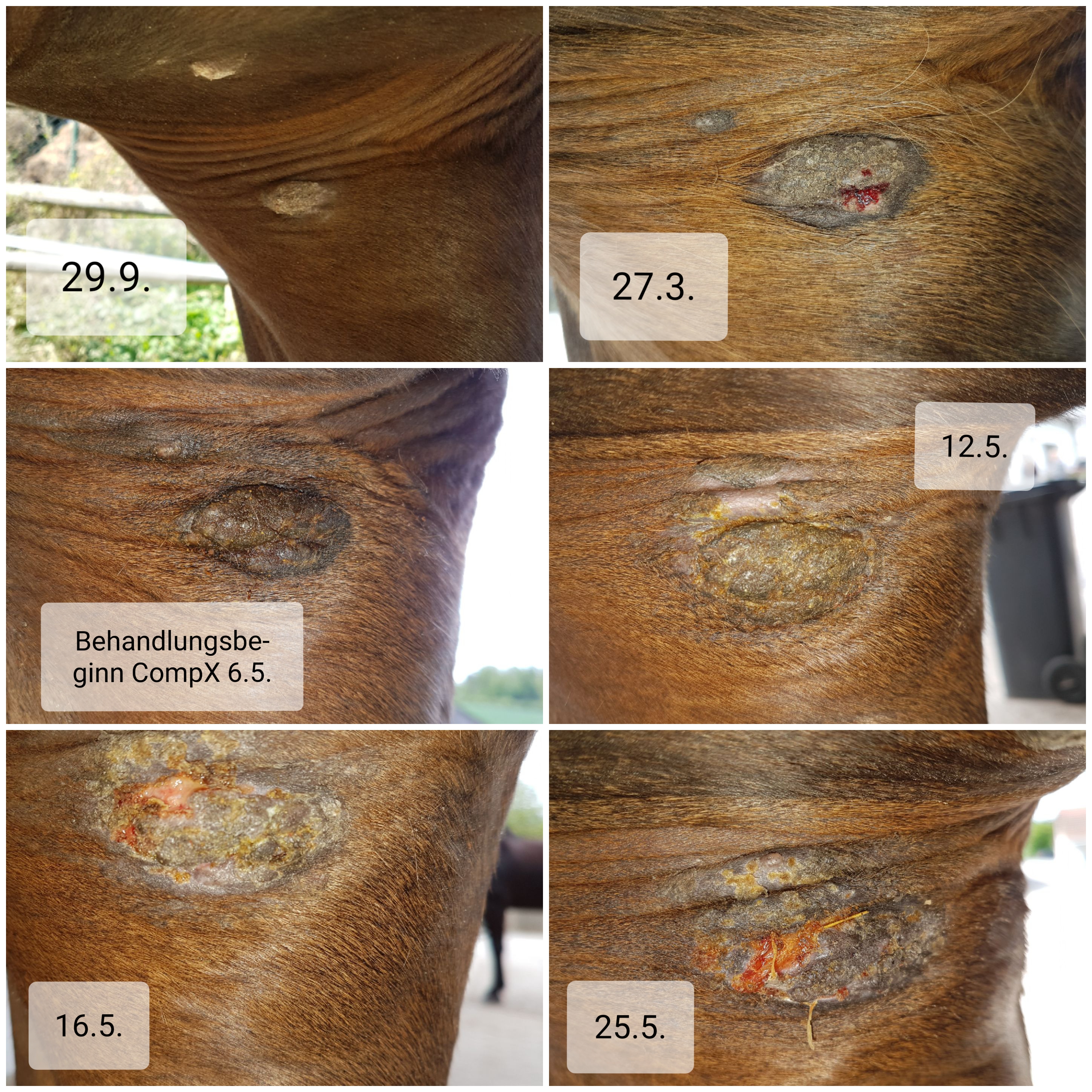 Behandlungsstart war im Herbst 2018 äußerlich Thuja-Tinktur und Meridol-Zahnpasta im täglichen Wechsel, unterstützende Gabe von Sepia- und Thuja-Globuli. Durch Nicht-Veränderung bzw. Verschlechterung dann Wechsel der Behandlungsmethode im Januar 2019 auf Aloe-Vera-Gel (mehrere 200 ml-Packungen der teuren Sorte - sollte ja das gute Zeug sein verschmiert - Kosten ca. 50 EUR). Weitere Verschlechterung und Umstieg ab Ende März 2019 auf Aciclovir (pro Tag 2g verbraucht. Mengenbestellung im Internet und damit ca. 40 EUR pro Monat). Kein durchschlagender Erfolg, daher ab Anfang Mai 2019 Umstieg auf CompX. Verbrauch bis zum Erfolg zwei Dosen á 50g, von denen aber noch so viel Rest da ist, dass wir nochmal etwas behandeln könnten, sollte nochmal was nachkommen, was ich echt nicht hoffen will.