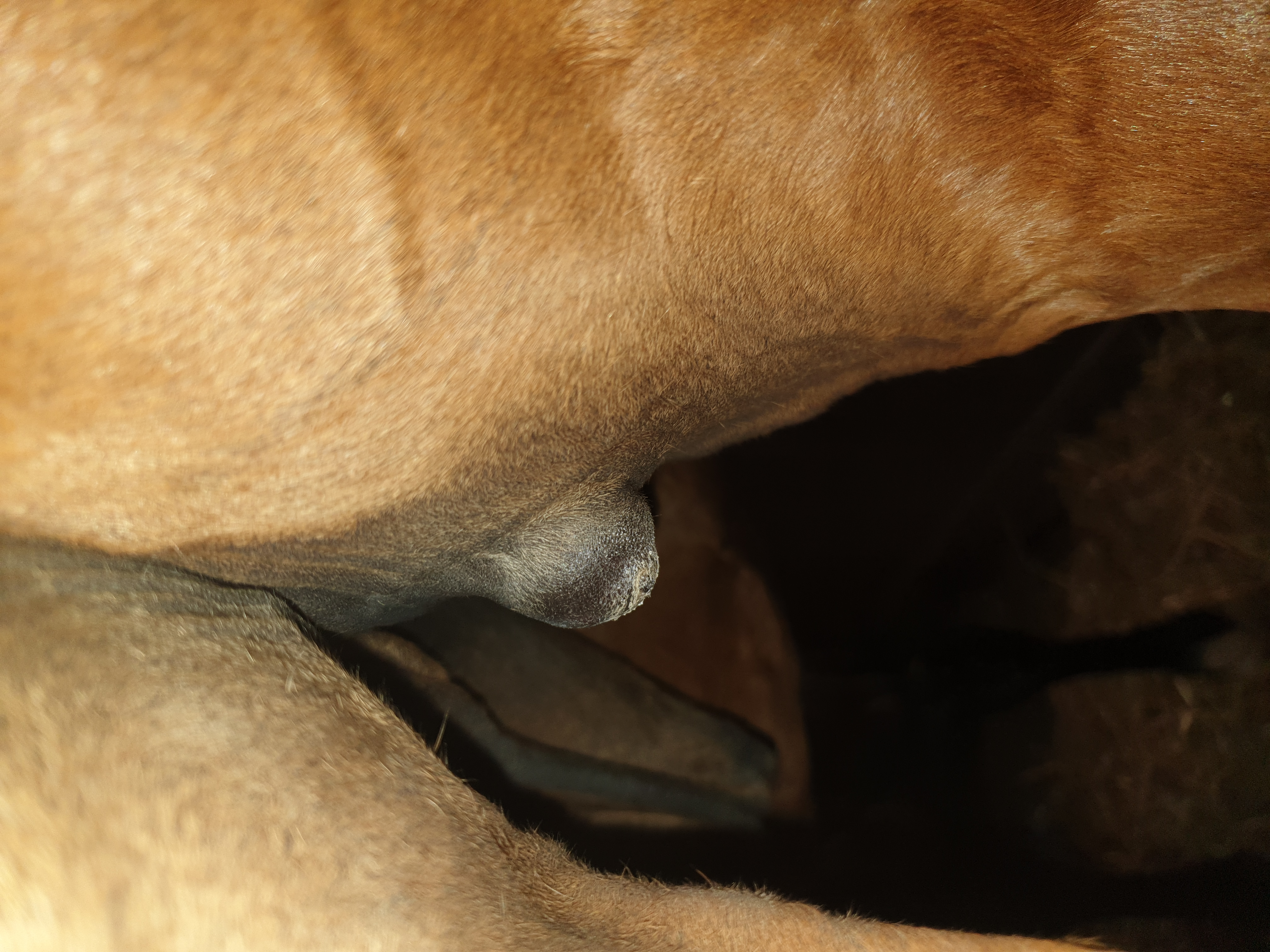 Ich habe mich auch gefragt ob er vielleicht irgendein Insekt wie die Hirschlausfliege oder so an sich kleben hat, aber er hat eindeutig versucht gegen das Sarkoid zu treten oder auch dran zu knabbern. Aber es sitzt gemeinerweise so, dass er selber nicht dran kommt. Er ist beim Versuch mit dem Maul dranzukommen fast umgefallen, so hat er sich verbogen. Wobei es vielleicht auch gut ist, dass er nicht dran kommt, denn wenn er reinbeißen würde wäre sicher auch nicht ideal.