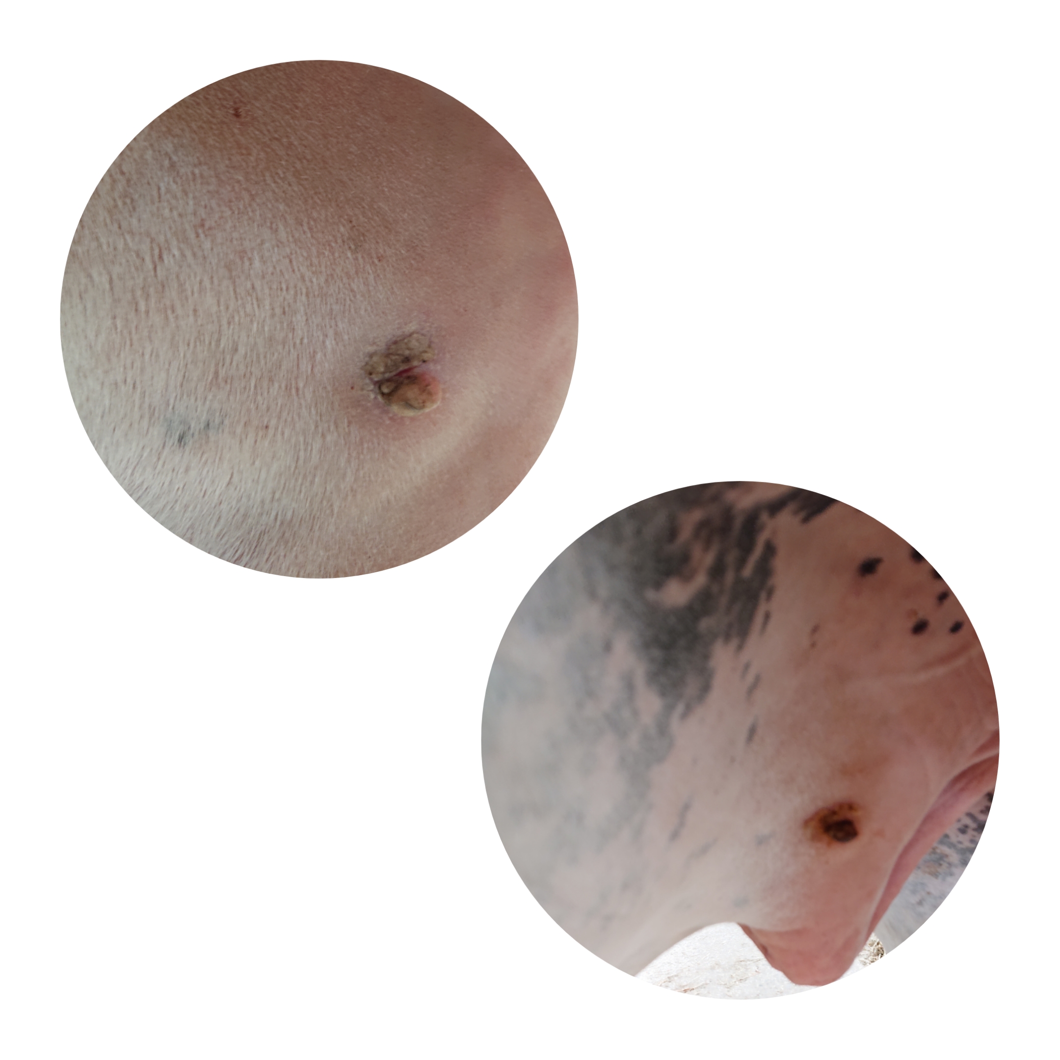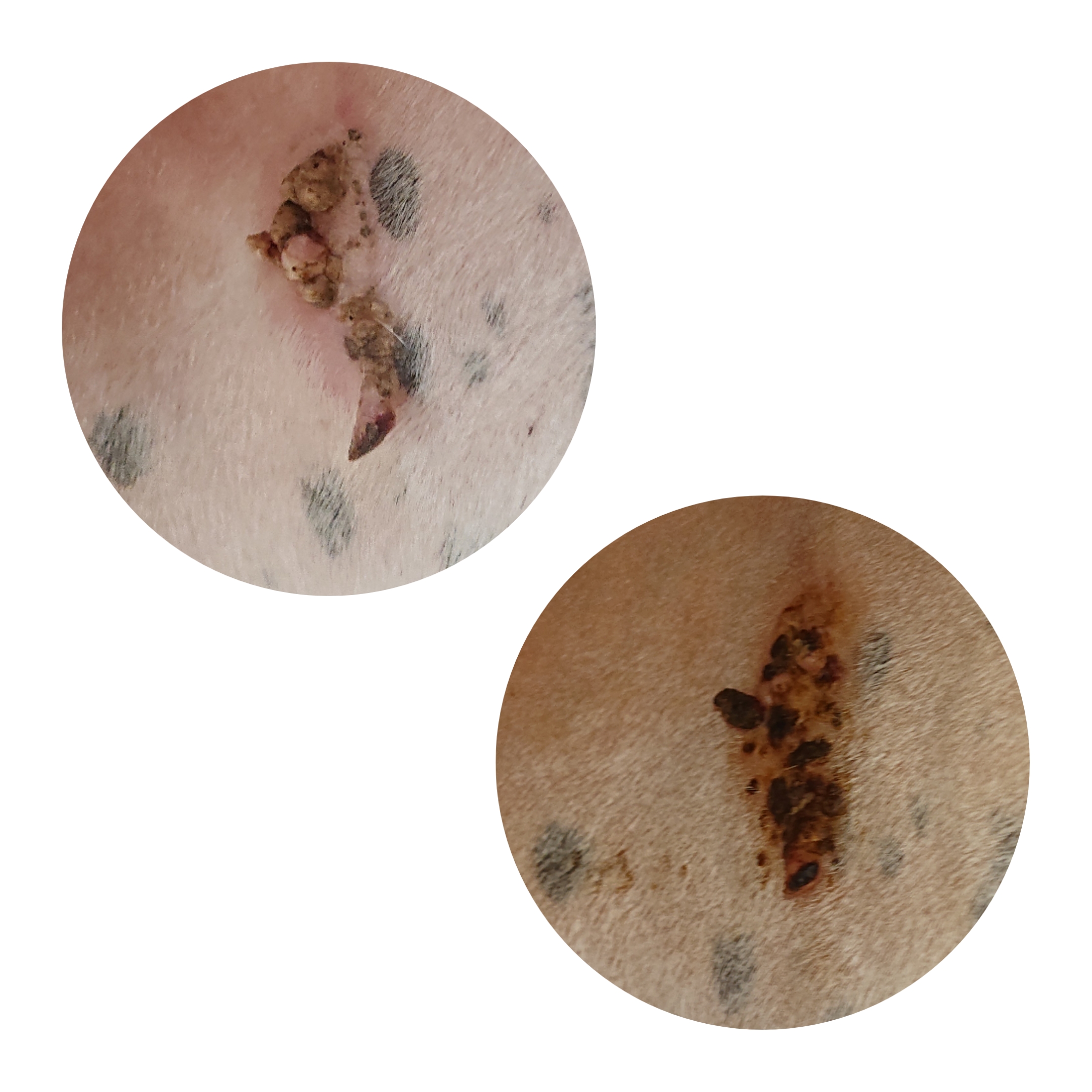 Hier habe ich am 12.6.20 mit der Behandlung mit Compx angefangen. Da die Sarkoide auf beiden Seiten sind habe ich nun mit einer Seite angefangen. Ich dachte, das ist erstmal genug für den Körper. Bitte sagt, wenn ich völlig falsch liege. Die Fliegen fallen diese Stellen sehr an. Das nervt mich.