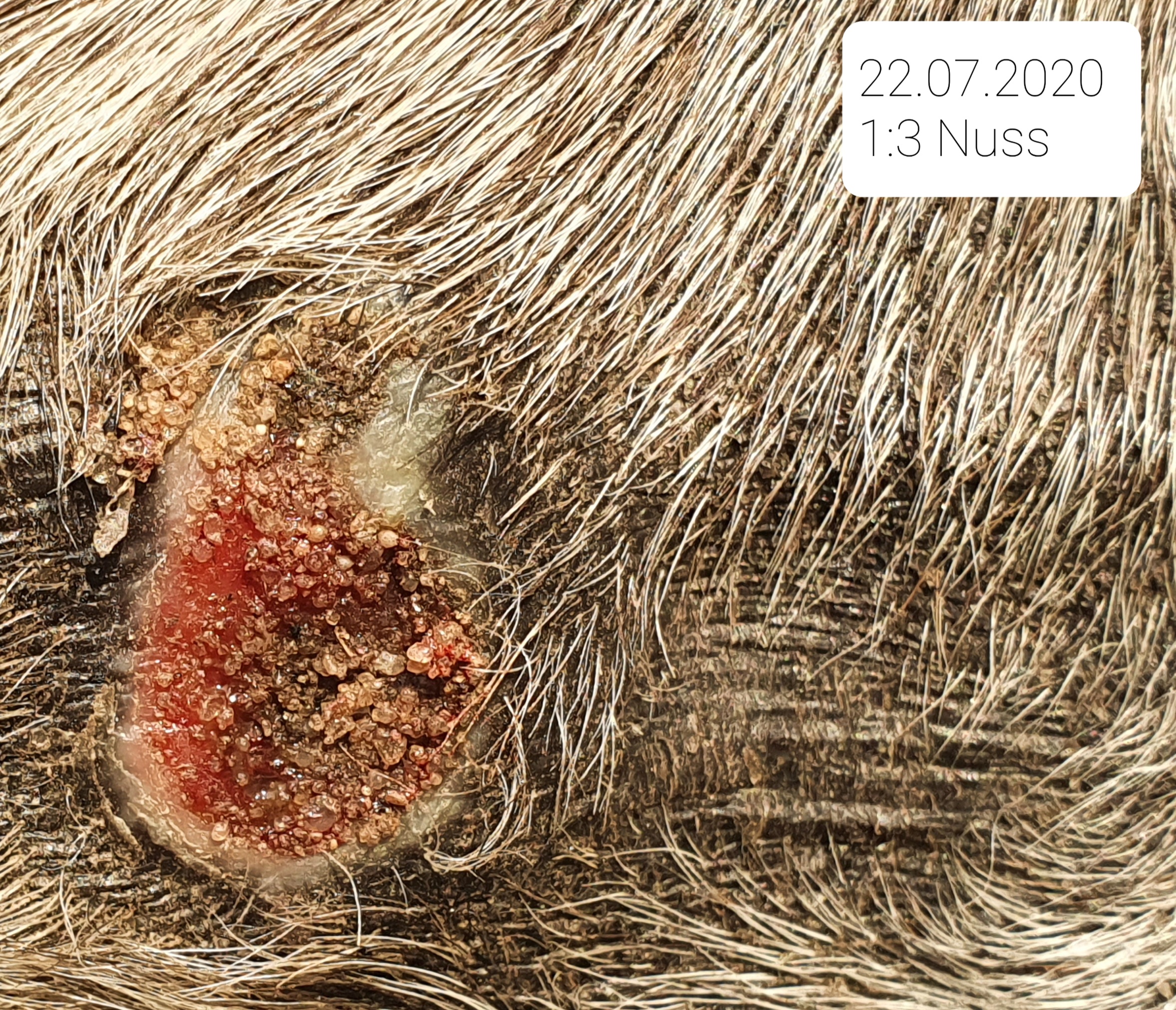 Vielen lieben Dank für eure Soforthilfe! Nuss sieht von aussen betrachtet wirklich gut aus, aber ich bin mir sicher, dass diese Kugel unten drunter ES oder eine eigenartige ( weil rund) Vernarbung ist. Es ist kein Stich. Ich mache den Kompromiss: mal 1:3 wenn ich es ertrage und mal 1:1. Und zum Thema Blindenpferd: deutlich lieber das, als dieses blöde Sarkoid. Er wird dort insgesamt eh eine deutliche Narbe zurück behalten. Die hatte er ja vorher eh schon von der Extremreaktion auf xxterra im letzten Jahr und meine Unfähigkeit... Zumindest schorft Restnuss unten Mitte rechts wieder auf und der kleine schwarze Hubbel auf 12 -1 Uhr auch.