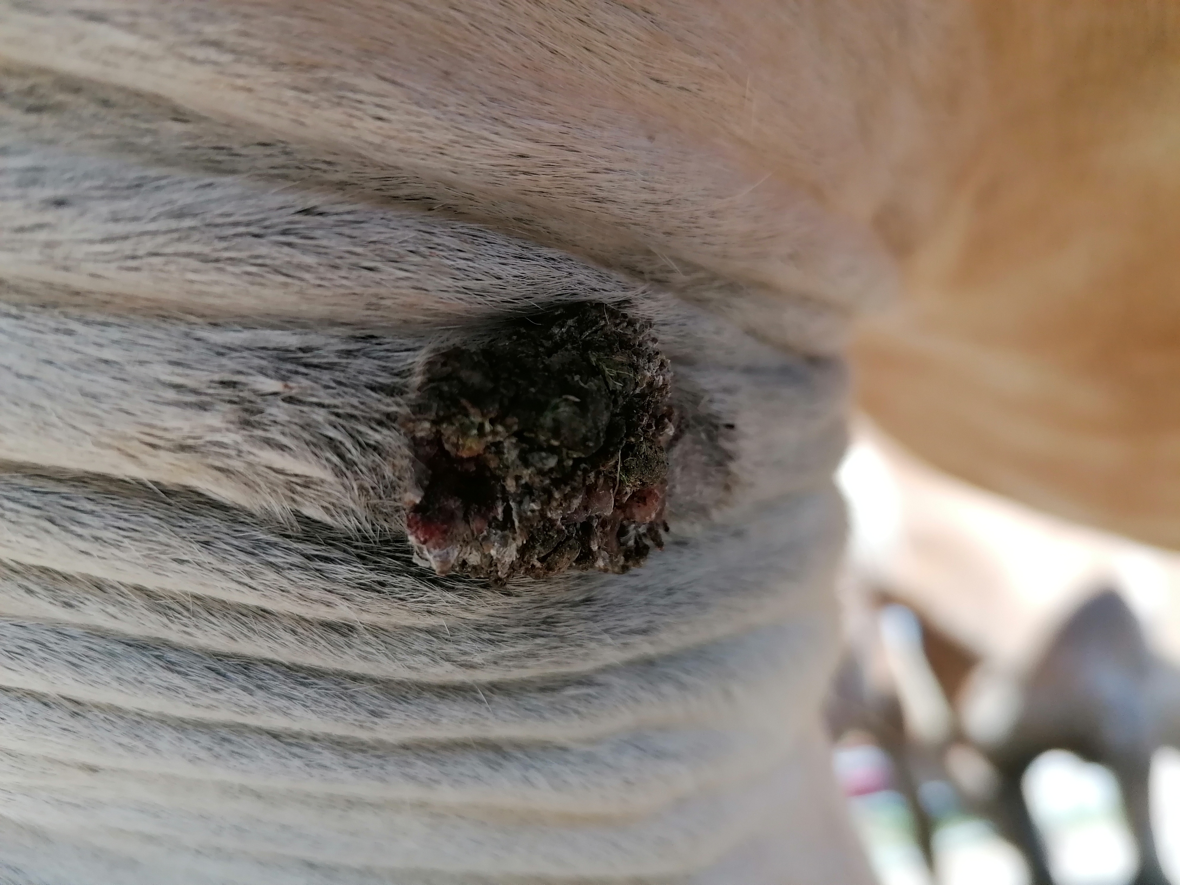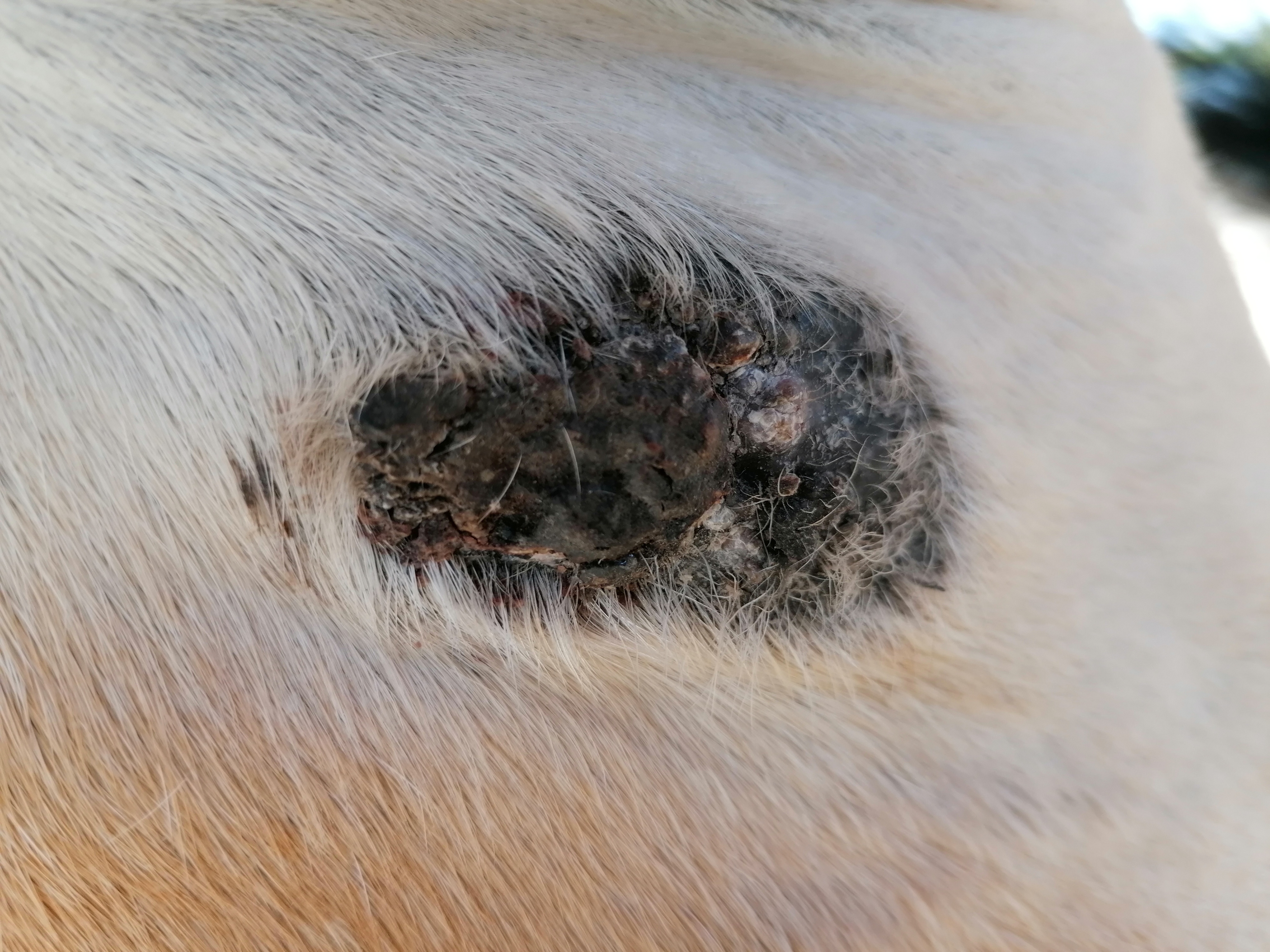 Größentechnisch hat sich nicht viel getan, die Sarkoidfläche ist gleich geblieben. Das größere Sarkoid "unten" ist deutlich platter geworden, die Warzenauswüchse waren vorher wesentlich höher. Ich habe das Gefühl es tut sich was, auch wenn es nicht viel ist. Ich habe das Gefühl, das kleinere Sarkoid oben, ist vom Verlauf her immer ein bisschen hintern dem anderen hinterher. Ich meine das größere hätte vor ein paar Wochen auch so ausgesehen.