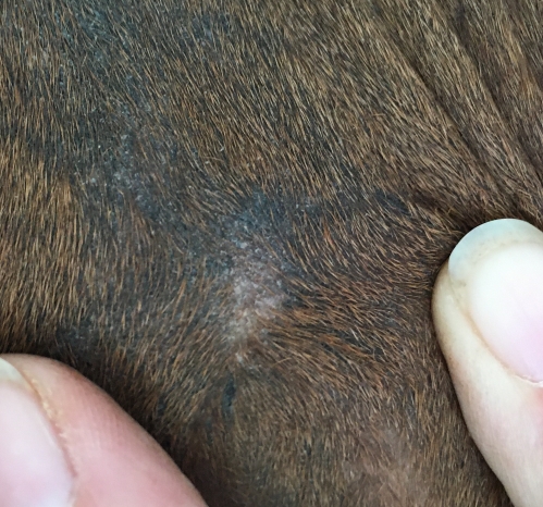 Es lässt sich wieder ein kleiner Pickel fühlen, aber noch nicht so richtig sehen im Fell
