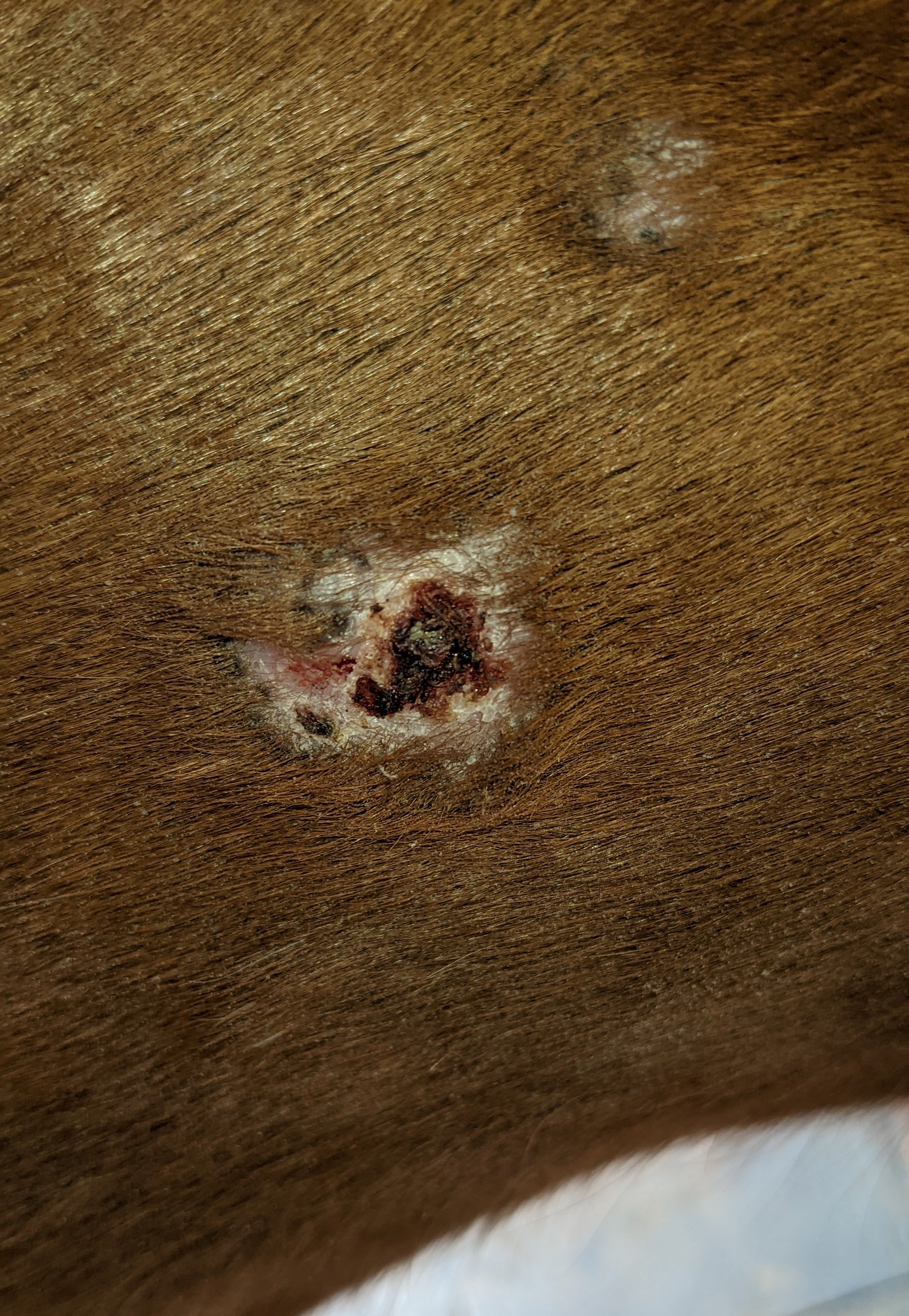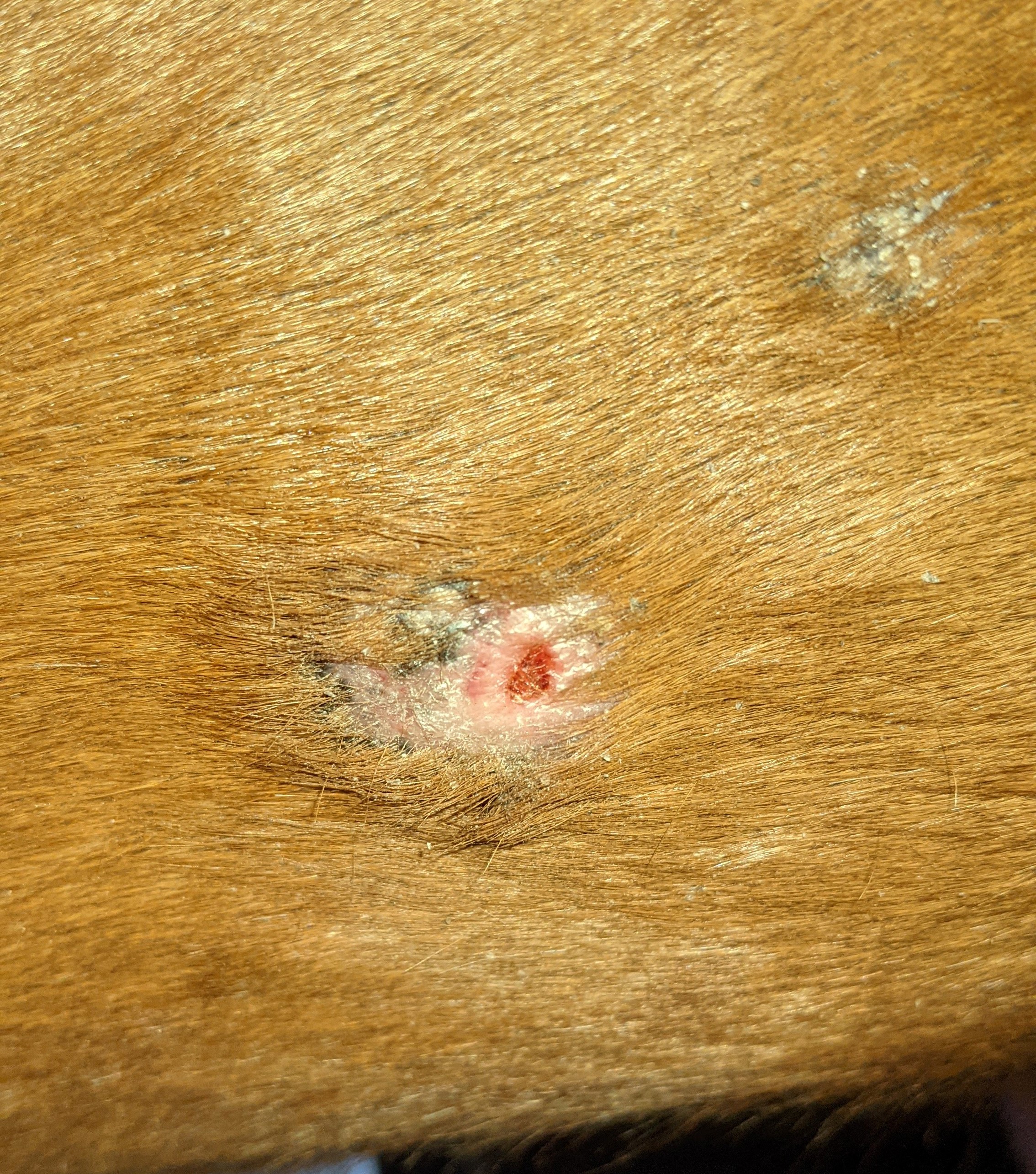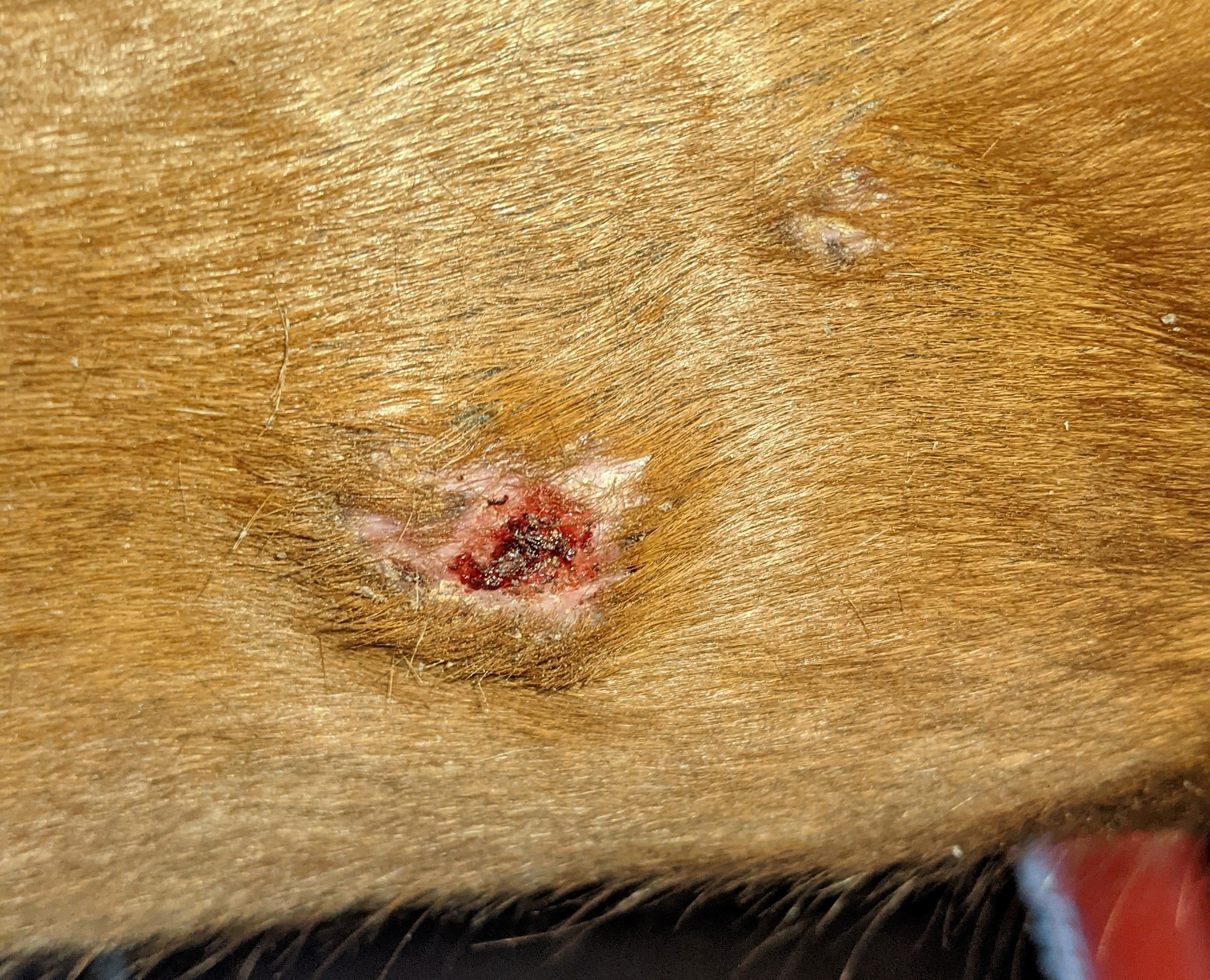 Krustenbildung durch das schmieren ist nicht zu erkenne, der kleine Knubbelchen ist kaum zu spüren und fast unter dem Fell verschwunden.