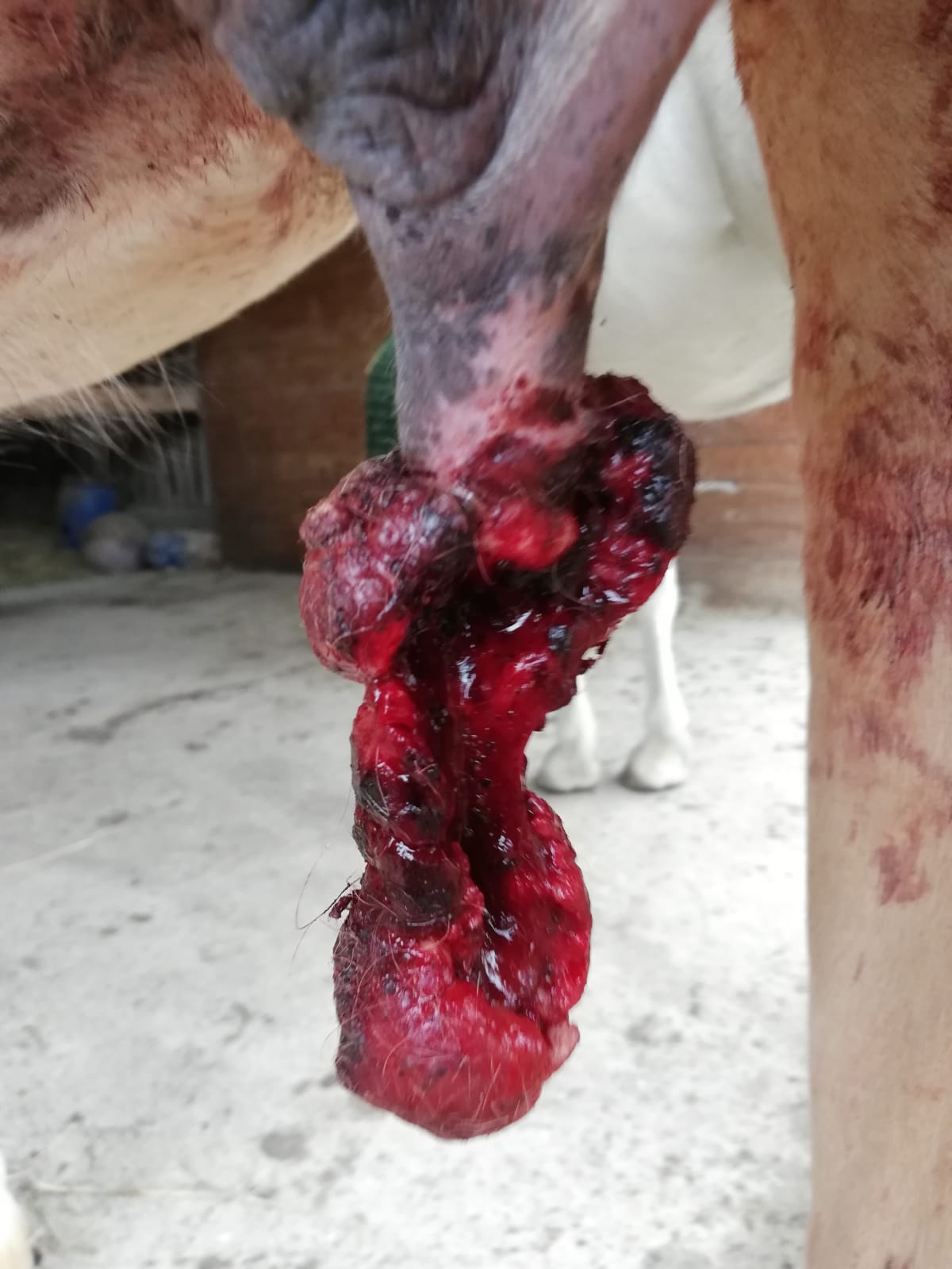Die Tierärztin hat dann entschieden, nur diesen Teil abzubinden, weil sich die Wunde sehr schnell zurückgebildet hatte. Während dem Abbinden ist dann das Teil schon abgefallen, das Gewebe war sehr weich und mürbe.