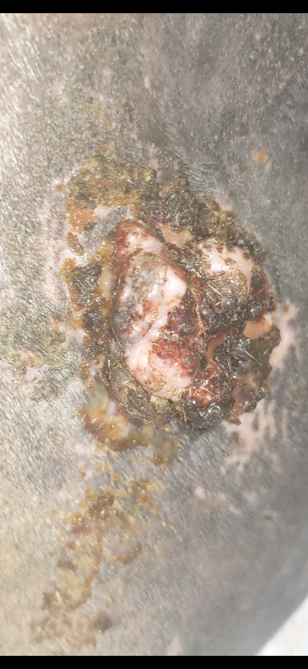 Nr. 1 dort heilt rechts wo es abgebrochen ist, die Haut gut. Sie ist Rose/grau wie die umliegenden Haut und sieht für mich ganz normal aus. Ansonsten ist es von der Fläche her nicht zum letzen Update verändert, aber insgesamt etwas flacher geworden. An den Rändern suppt es ordentlich und wir fleißig beschmiert