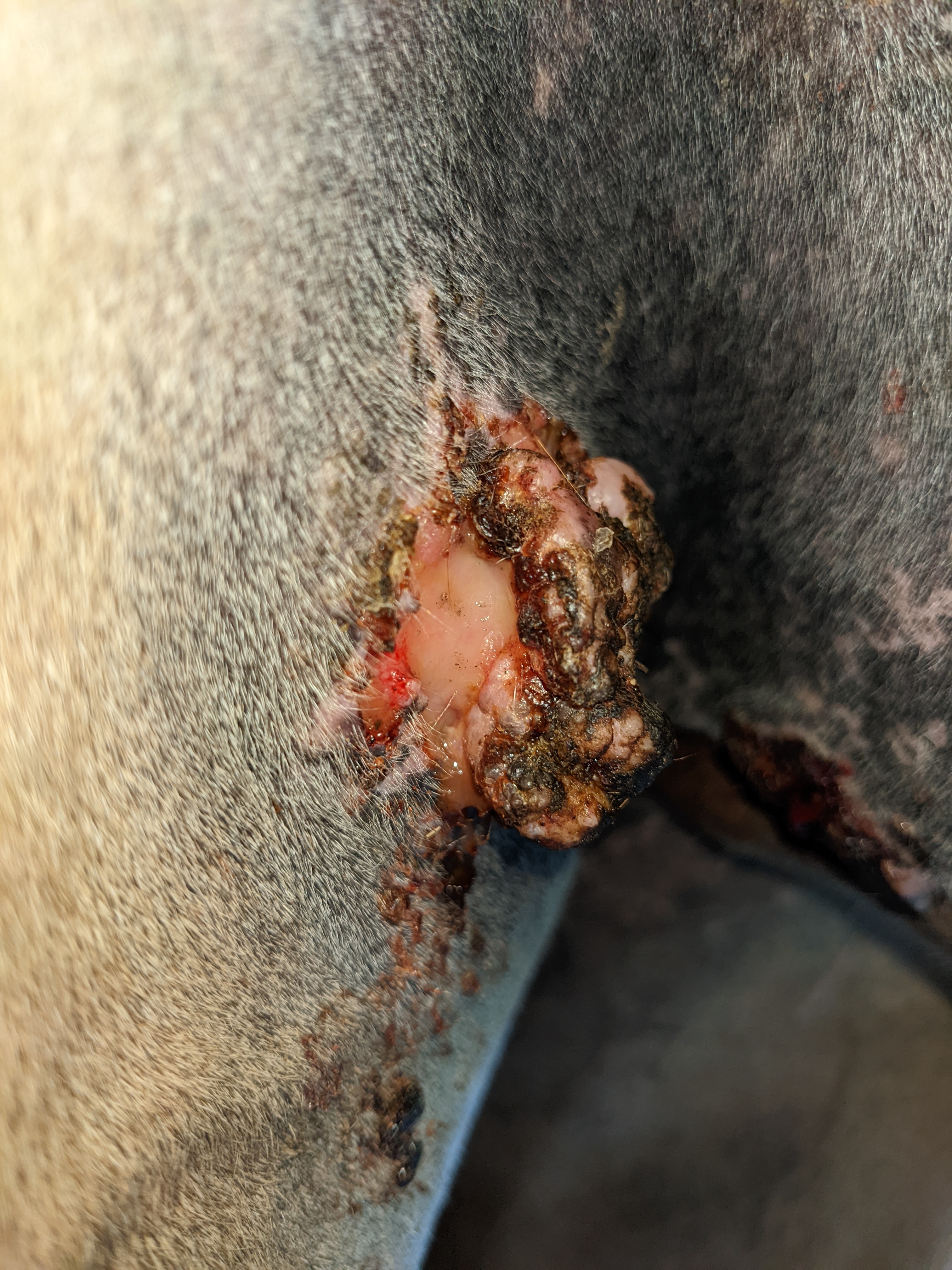 Was ich weiß... es wächst wirklich frisches Sarkoid nach, die harten rosa/grauen Stellen. Da musst du schneller sein mit Schmieren als die nachwachsen (insgesamt am Ende). Zwischendurch hatten wir auch Phasen, wo das aus dem Ruder zu wachsen schien. Ich habe jeden Tag von jedem Sarkoid vor dem Schmieren Bilder gemacht und vorher genau geguckt wo ich 'besonders' genau draufschmieren muss und das sind eben diese neugewachsenen Knubbel. Das verkrustete ist nicht sooo wichtig. Aber auch die Stellen, die so rosa-eitrig sind, sind Sarkoid. Da auch schön in die Sabsche schmieren. Wenn es alles zu dick wird (das Gesunde drumherum), lieber verdünnen, Pause nur im Notfall.