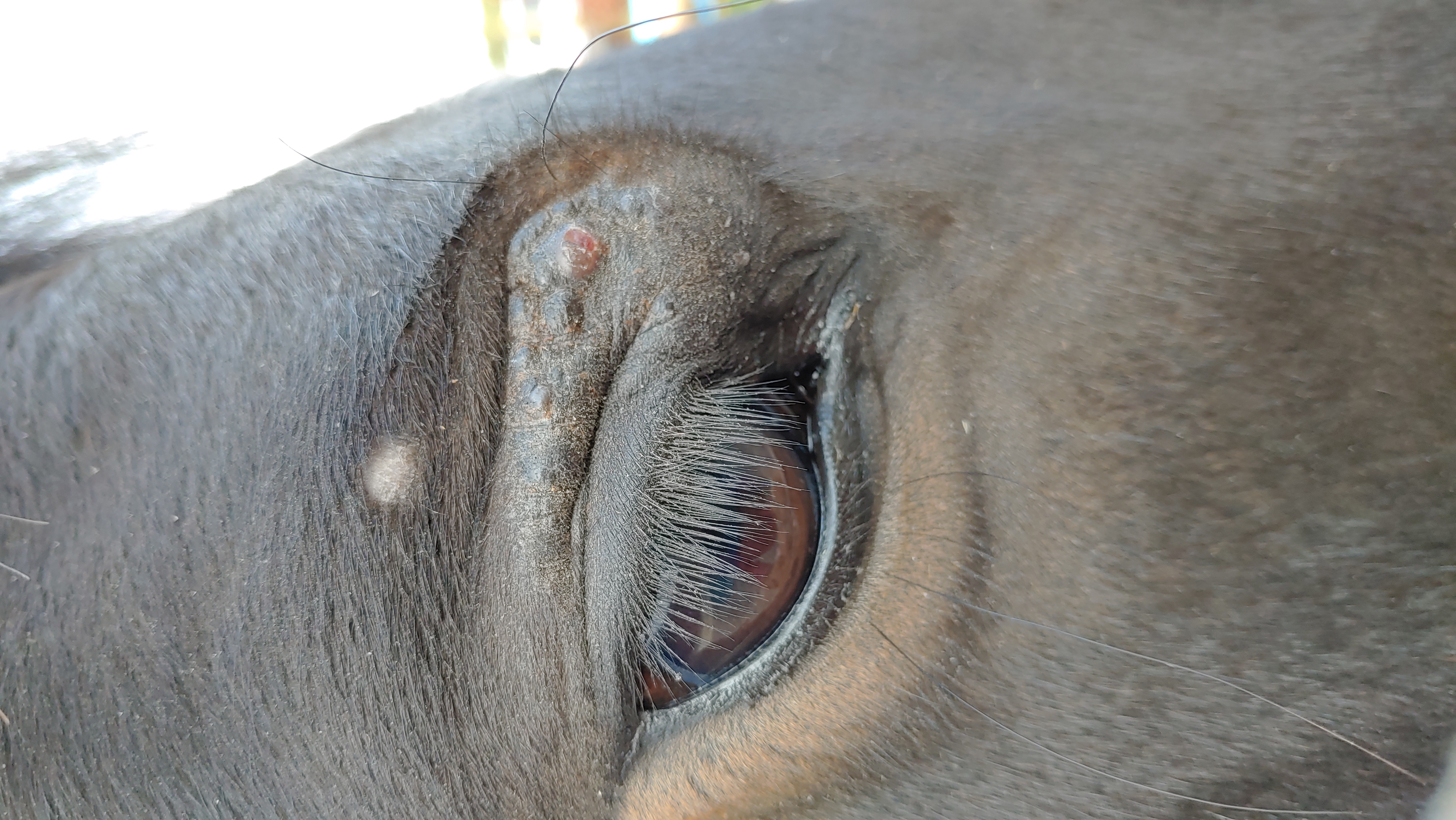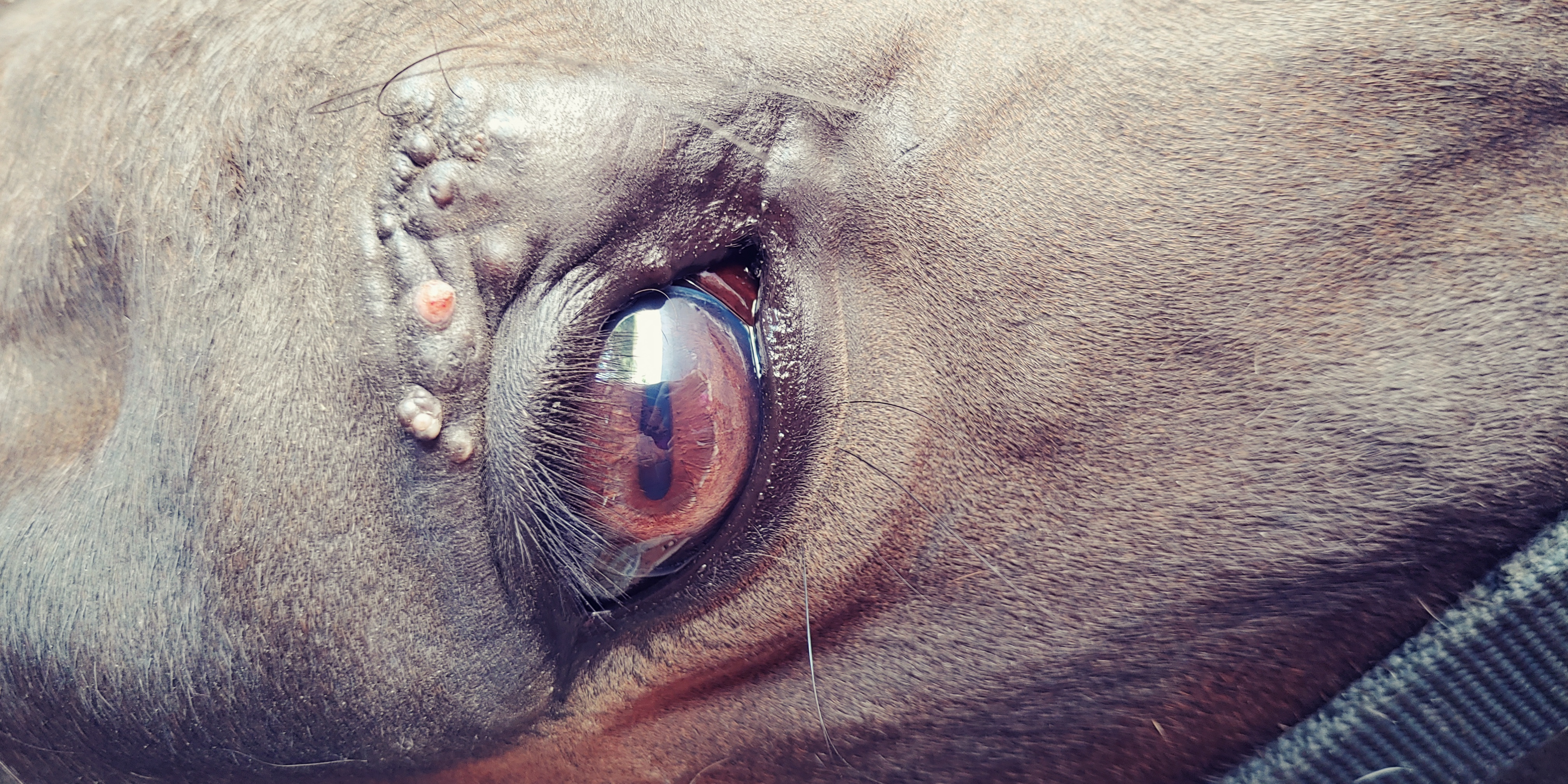 schon länger schaue ich immer mal wieder im Forum vorbei und lese mir Behandlungstagebücher von anderen Pferden durch. Ich selbst habe seit fast 3 Jahren einen Wallach, welcher erstmals im Sommer 2020 Auffälligkeiten am Auge zeigte. Seit er Fohlen ist, hat er über diesen Auge eine kahle Stelle durch eine Verletzung. Zuerst vermutete ich da einen Stich, aber es wurde immer warziger. Ich belas mich dann zu diesem Thema und hatte immer mehr den Verdacht es könnte ein Sarkoid sein.
