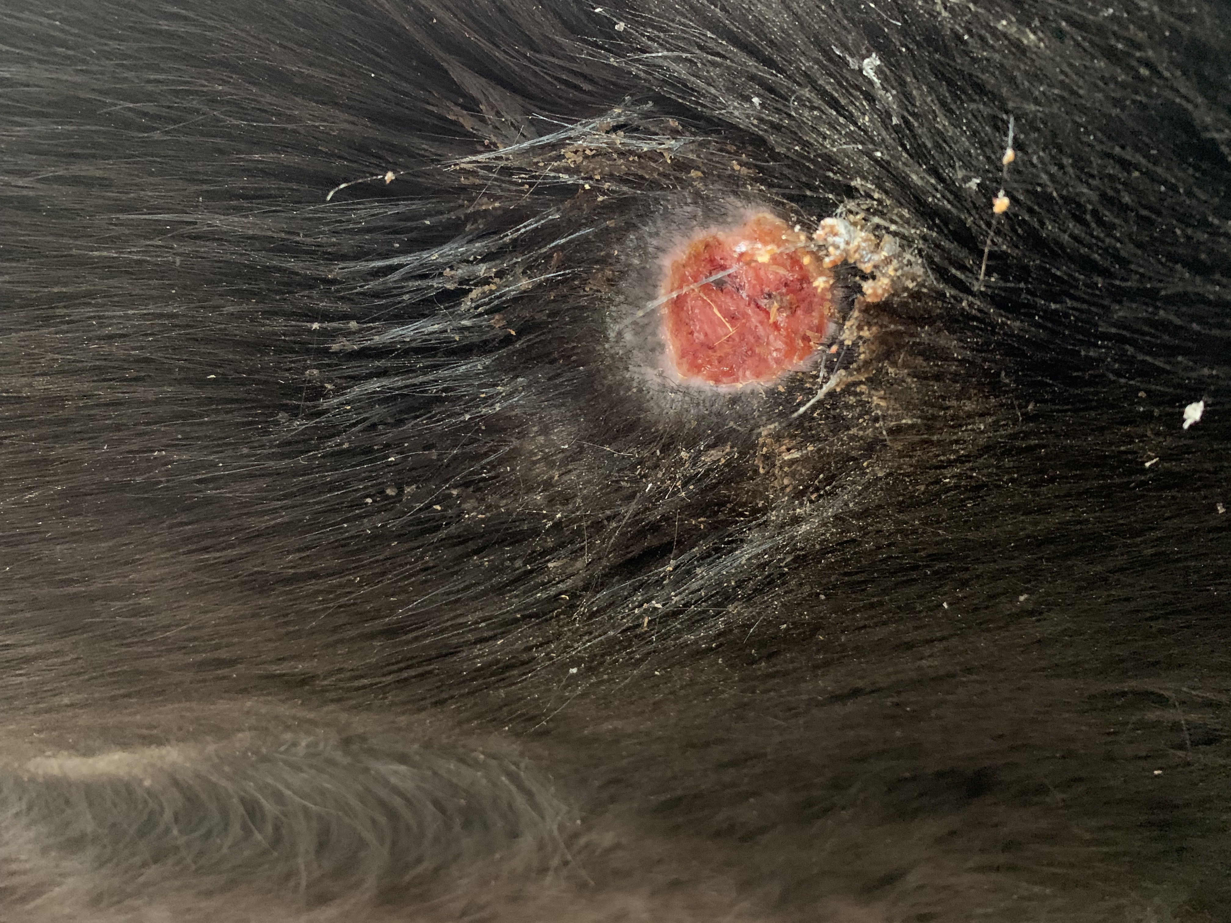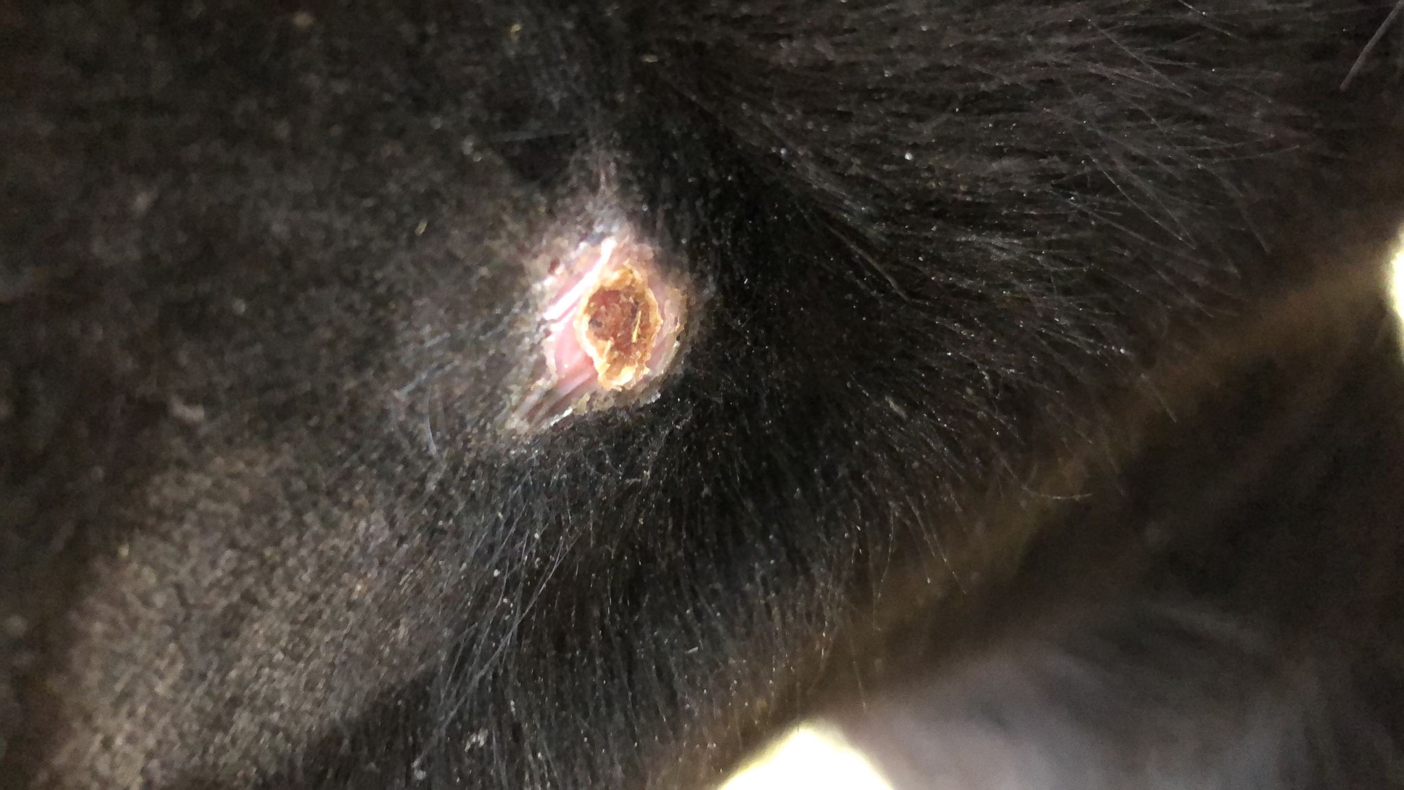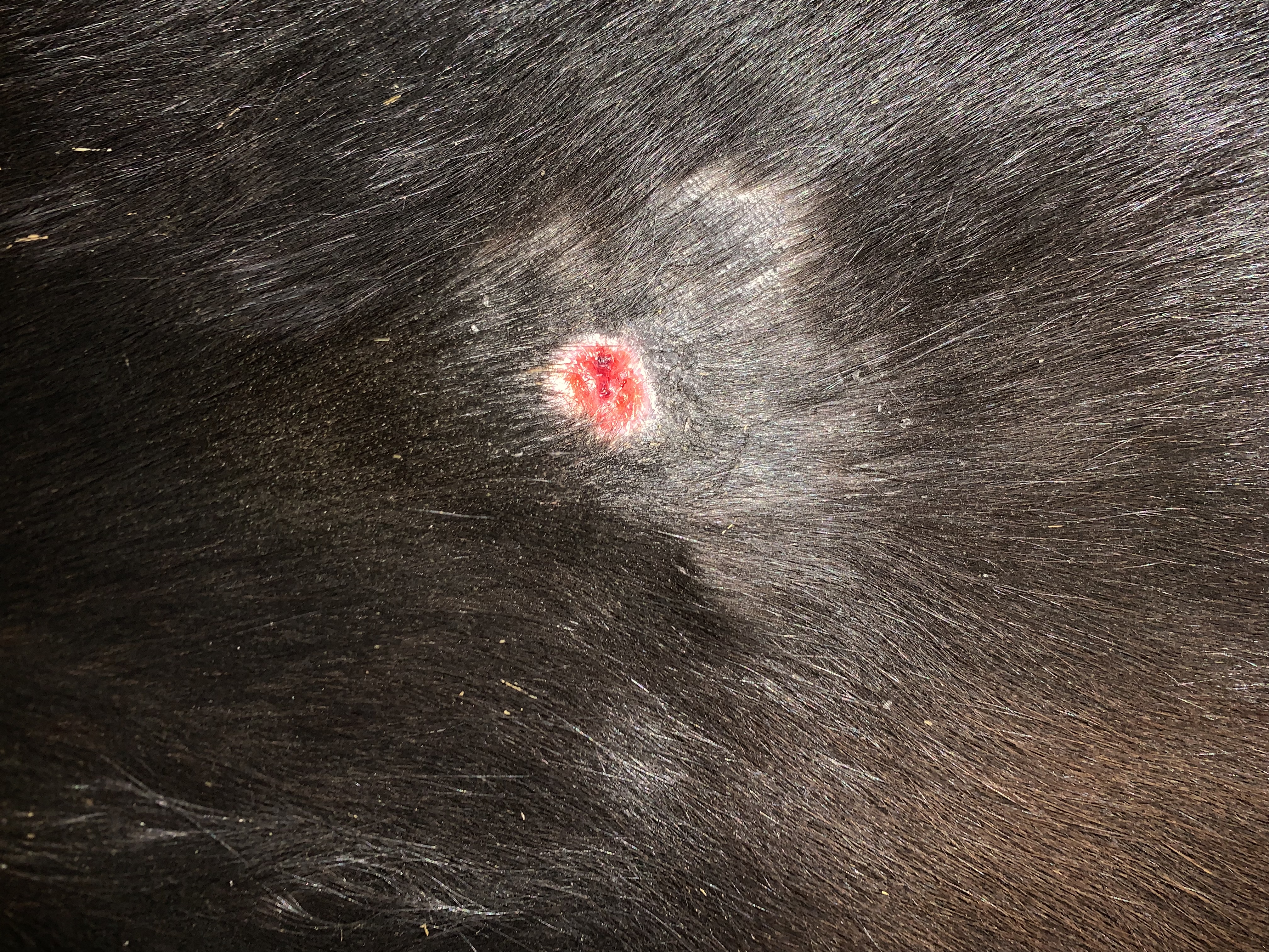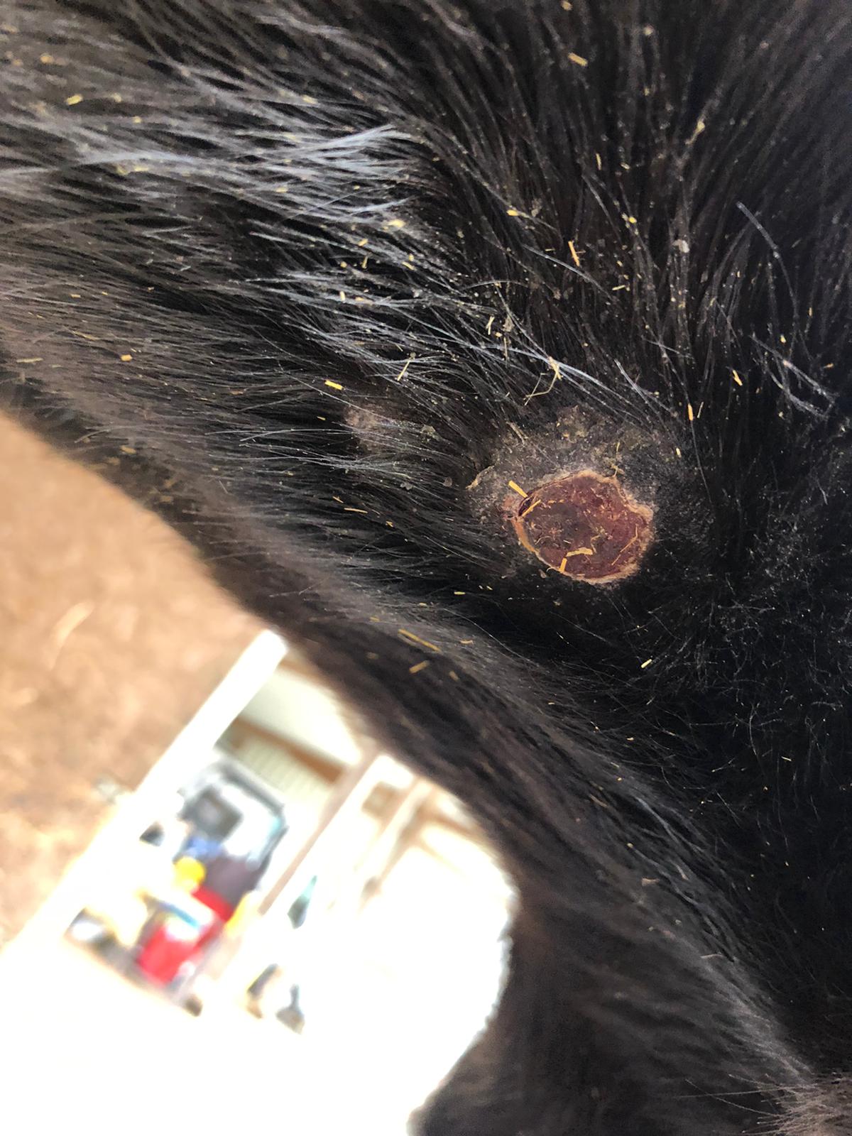 Seit dem 18.12. tragen wir die Salbe alle 3 Tage verdünnt (im Verhältnis 30% CompX, 70% Vaseline) auf und ich glaube und hoffe, dass wr mittlerweile auf dem richtigen Weg sind. Ein aktuelles Foto findet ihr unten. DAs Sarkoid ist genau 2cm groß und es lässt sich am Rand deutlich eine rosa Linie erkennen. Ein dicker Grind bildet sich inzwischen nicht mehr. Deshalb können wir leider im Moment den Gurt überhaupt nicht mehr drauf machen. Wir nutzen wie oben beschrieben normalerweise einen dicken Lammfellgurt mit 2 Schwämmen. Vor ein paar Tagen haben wir es einmal mit Omnifix ausprobiert. Trotz aller Maßnamen war das Sarkoid leider etwas auf, weshalb wir den Gurt nun selbstverständlich wieder weg lassen.