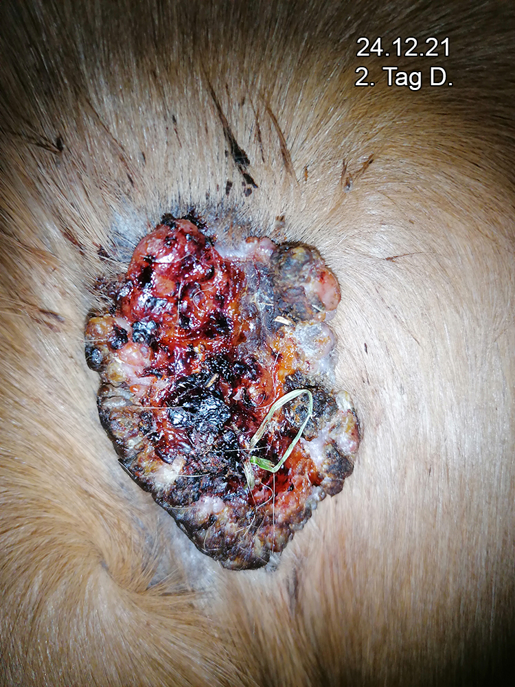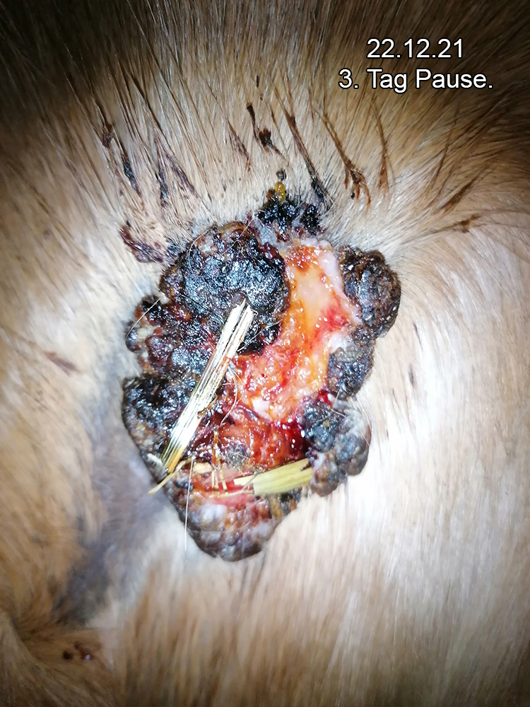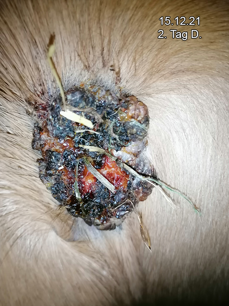 Das am Hinterbein ist weder gewachsen noch kleiner geworden daher habe ich es eine Zeitlang nur beobachtet, weil es nur schwarz wurde aber nicht wirklich reagiert hat (kein eiter, flüssigkeit, abfallen von krusten oder ähnliches)