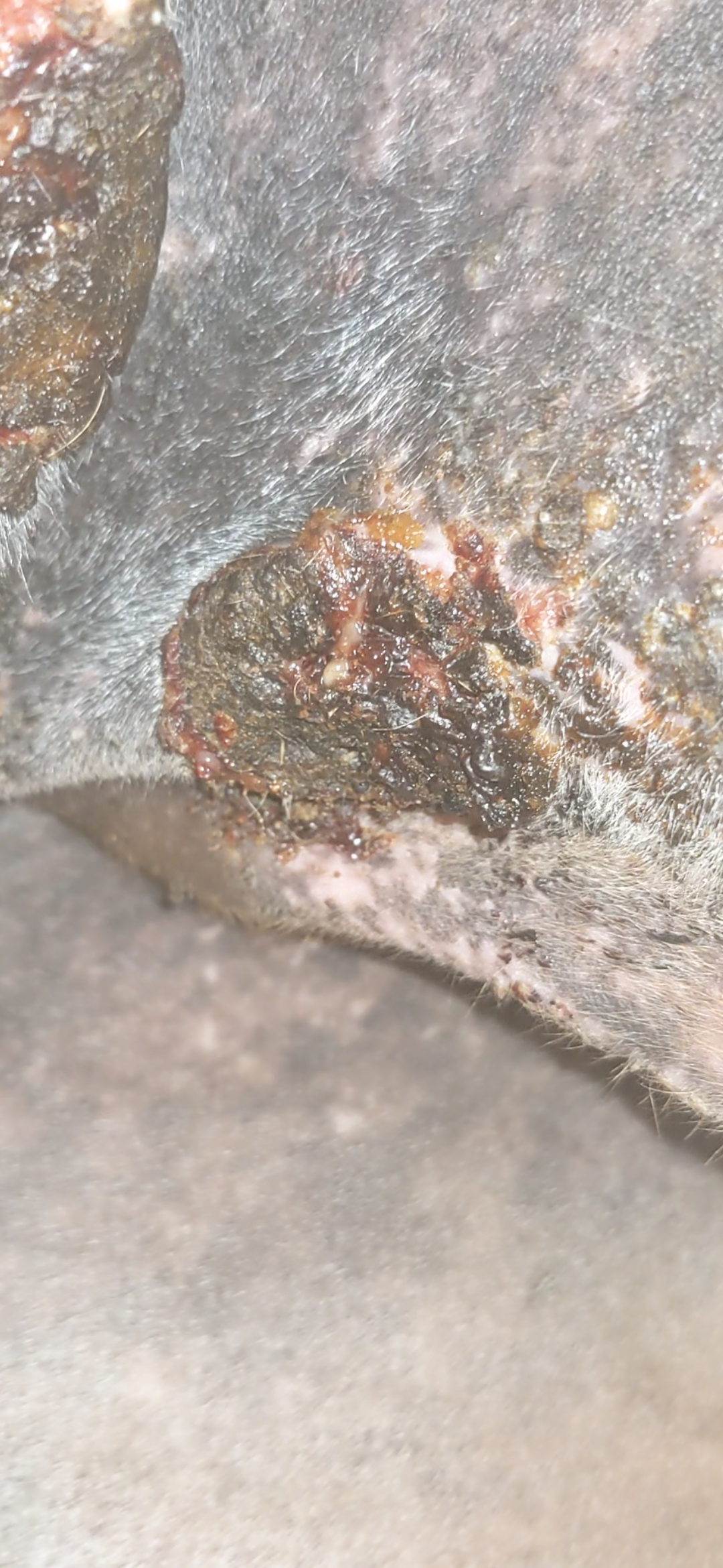 Nr. 4 hat wie Nr.1 auch vorher 1:1 bekommen. Aber auch dem habe ich hochkonzentriertert volle Ladung gegeben. Komischer Weise ist der davon gar nicht angeschwollen. Hier hat Pony aber nach dem ersten Kleistern wieder einmal die Kruste abgebissen. Ich habe dann direkt nochmal volle Ladung drauf gehaun. Gefühlt ist es nun etwas flacher und hat eine neue Kruste.