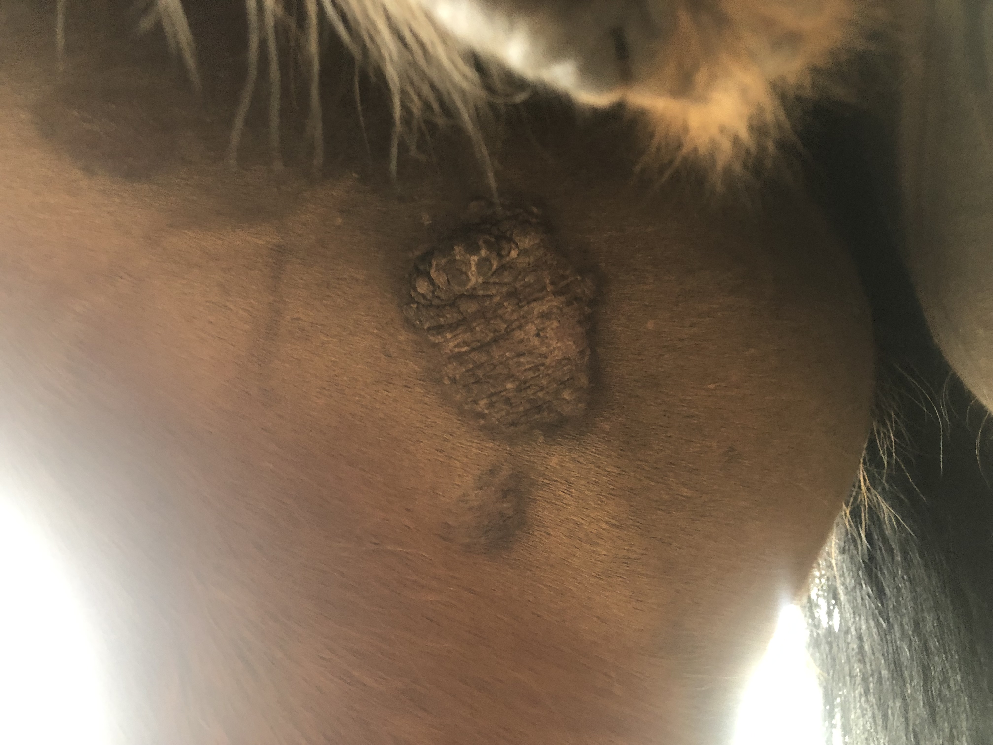 Ich habe jedoch Fotos angehängt von Sarkoiden hinten Oberschenkelinnenseite nähe Schlauch, Widerrist und auralem Plaque im April vor der Behandlung und dann von heute Oberschenkelinnenseite, zwischen den Vorderbeinen,bzw. rechter Ellenbogen und Widerrist nach ca 5 Monaten Behandlung.