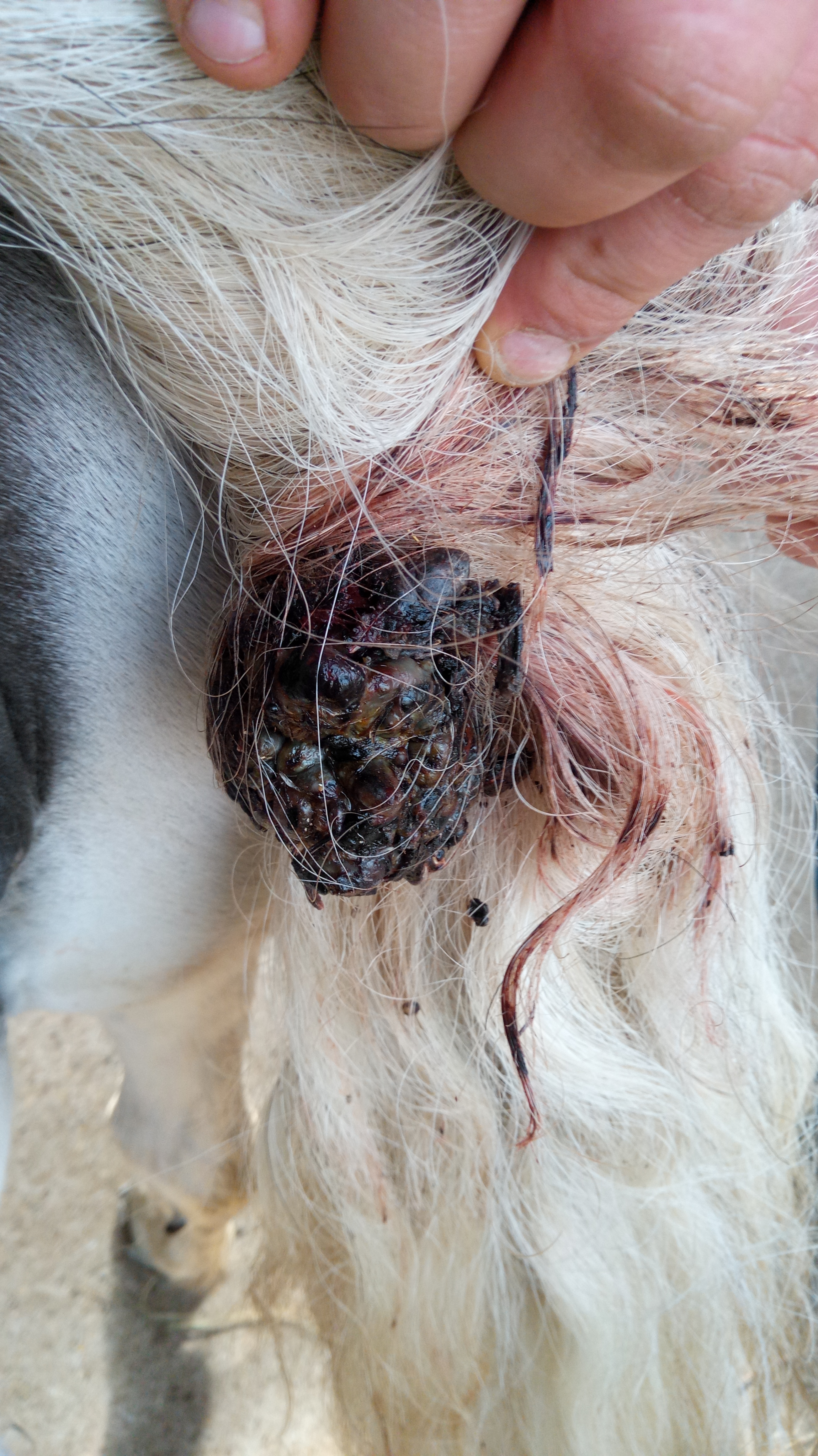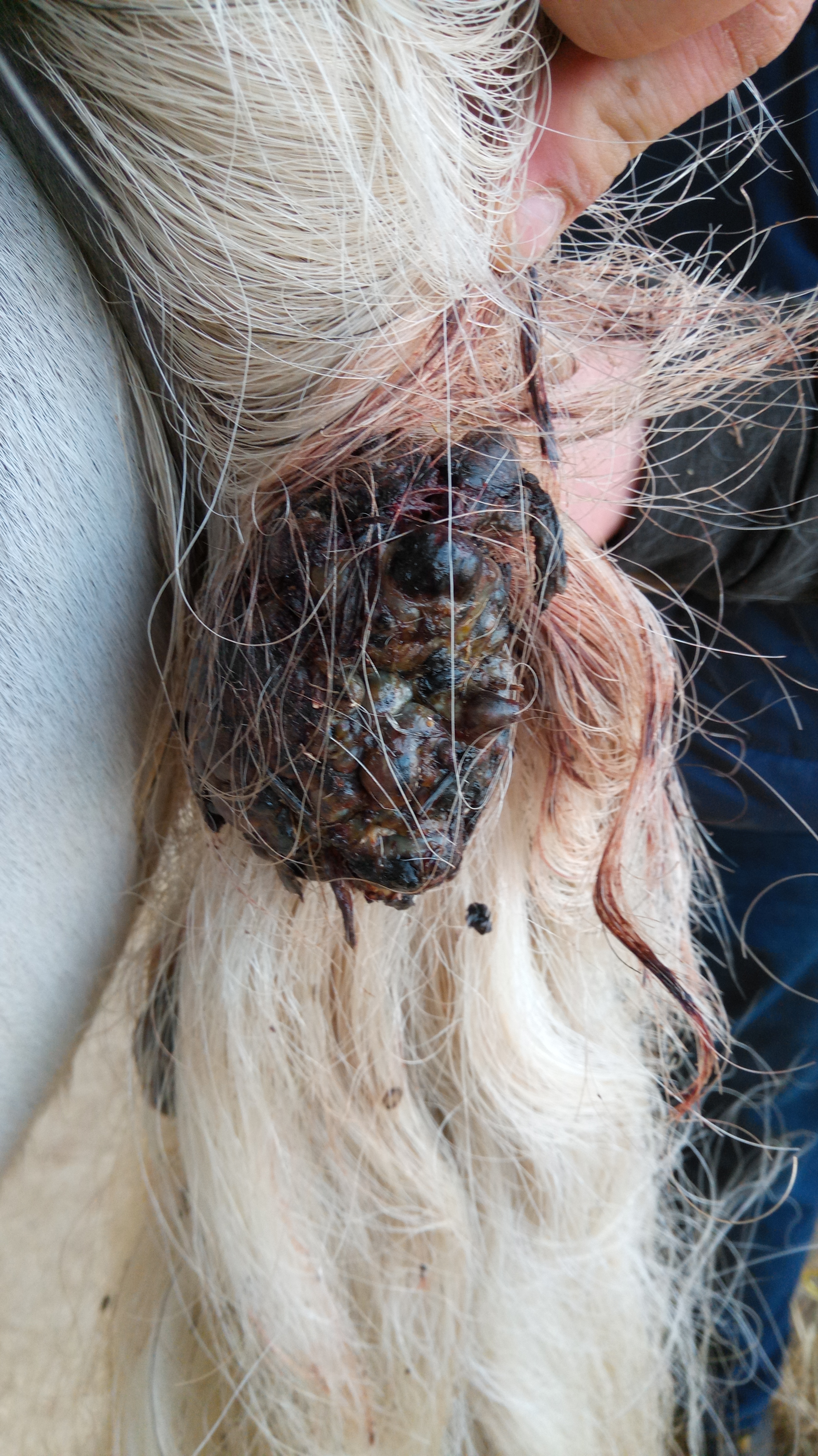 Die Aussage der TÄ ist: Vermutlich Melanom da Schimmel. Ich Frage mich jetzt ob man versuchen könnte es mit Salbe gegen ES zu schmieren. Viel Schlimmer kann es ja kaum noch werden. Vielleicht hat hier jemand Erfahrung mit Wucherungen die SO aussehen? Sie hat noch andere Stellen, die nach Melanomen aussehen am After, unten am Euter aber das sind diese glatten leicht befellten Knübbelchen, die ja auch nicht weiter stören.