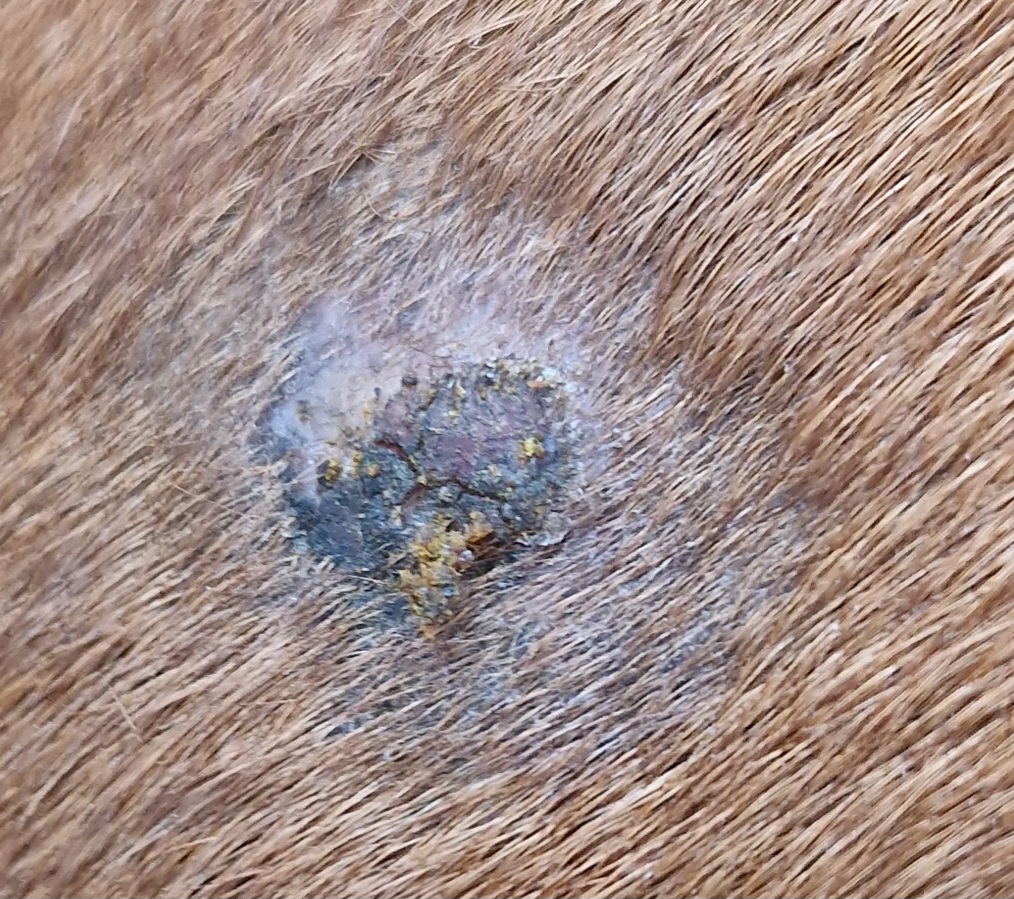 Dann sieht man drumherum noch einen weiteren Kreis wo das Fell etwas kürzer ist. Darunter fühlt es sich krustig und hubbelig an (vor allem unterhalb vom sarkoid, da ist die haut auch dunkler), sodass ist gesagt hätte, dass es auch noch sarkoid ist. Im Forum liest man aber immer wieder, dass wenn fell wächst, ist das Sarkoid dort weg.