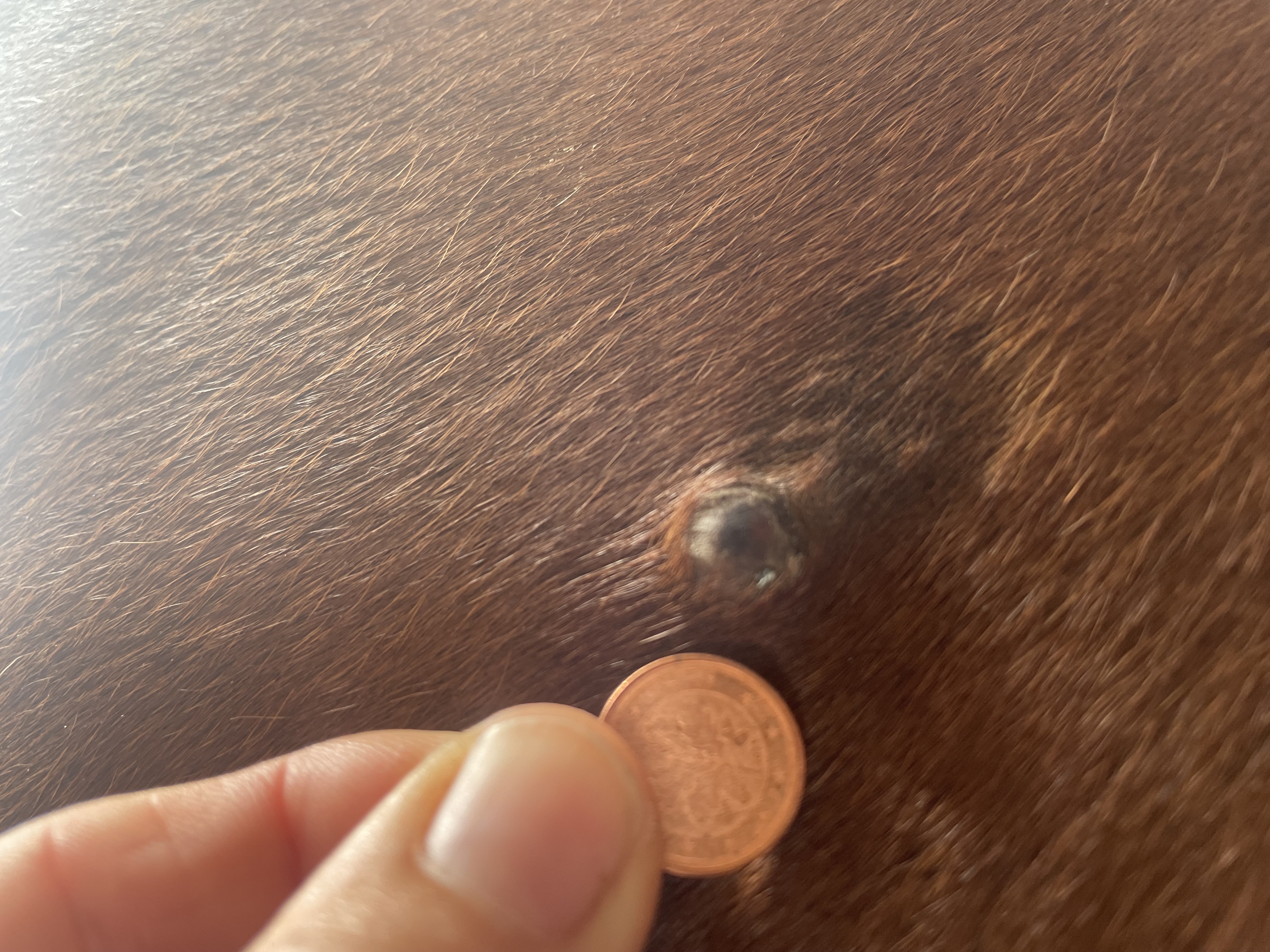Hallo zusammen, so sieht das Sarkoid nach fast 2 Wochen Schmieren aus. Ich bin mir nicht sicher, ob wir voran kommen .Wie ist eure Meinung? Die Größe bleibt immer gleich .