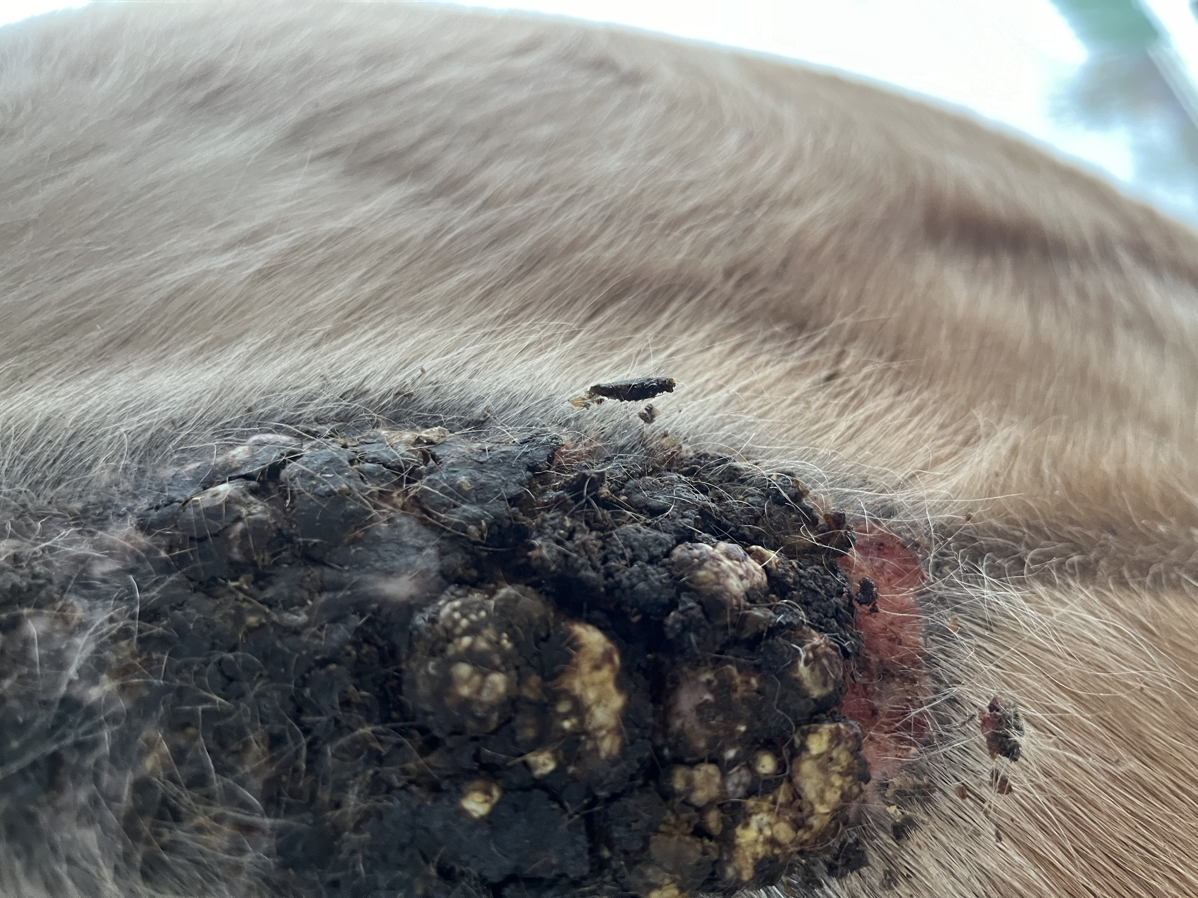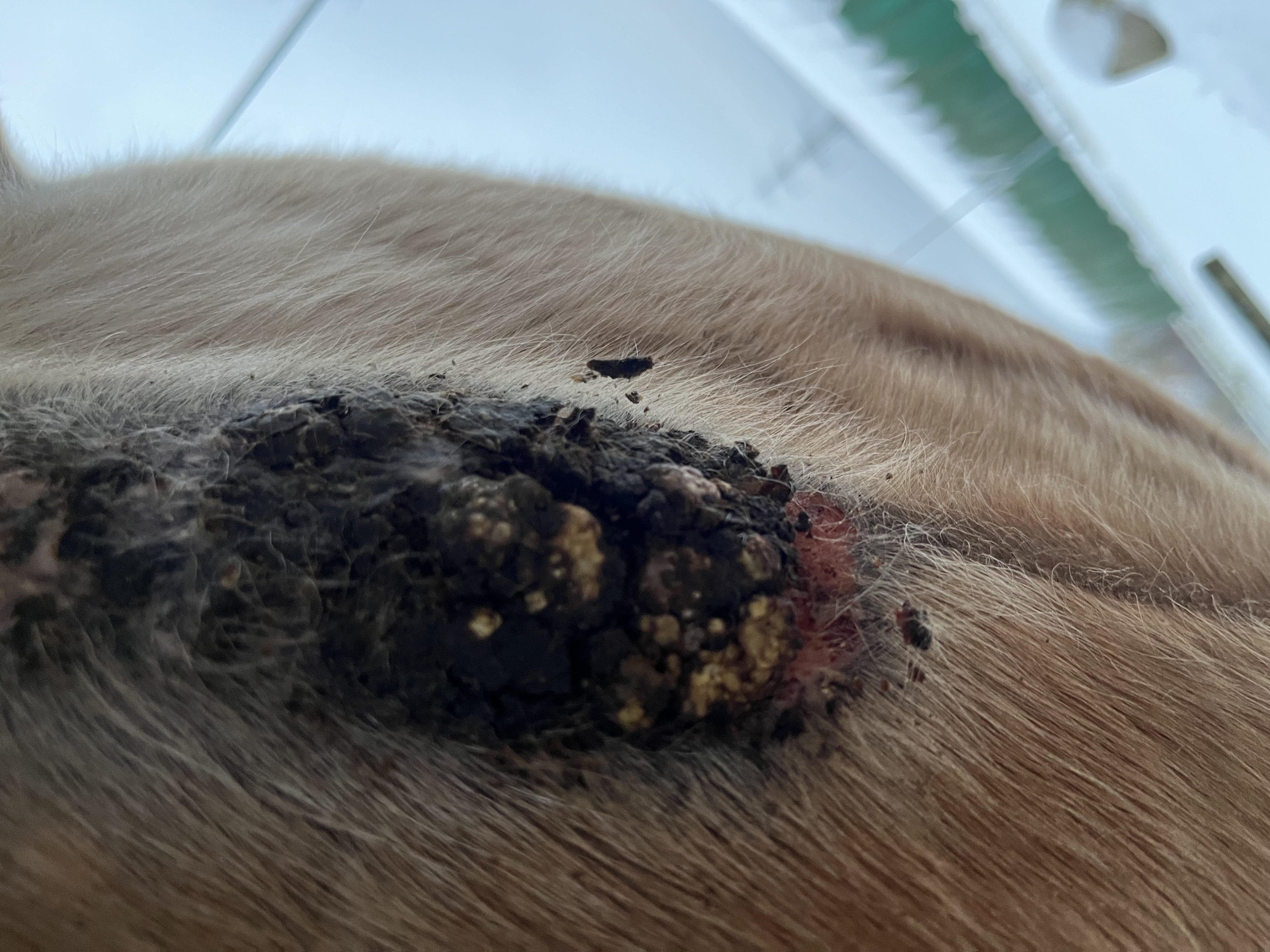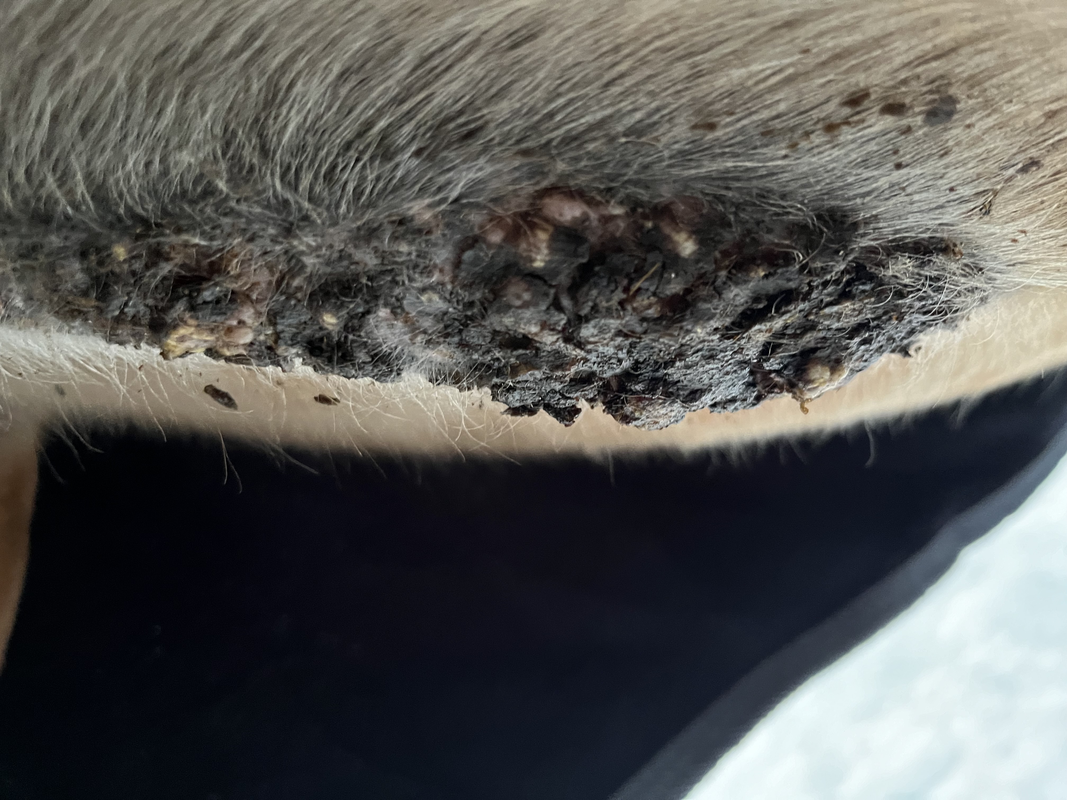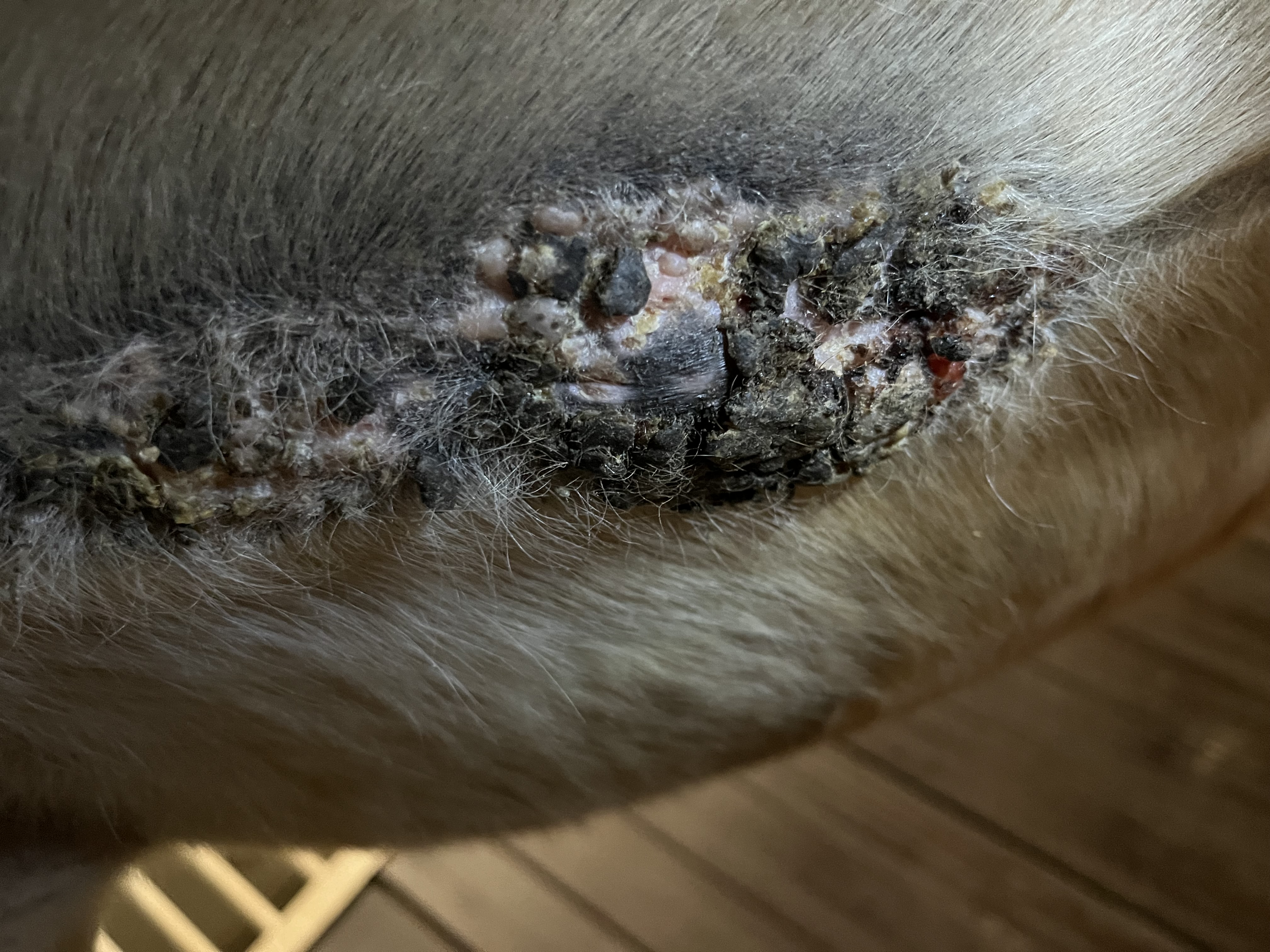 28. Mai da sah es fertig aus, die Roten fleischigen Stellen, zeigen dass es hier fertig ist, die braunen Flecken sind noch Reste, schwarze Krusten arbeiten gerade = hier hätte generell eine Pause gemacht werden sollen oder sehr stark verdünnt 1x die Woche drüber