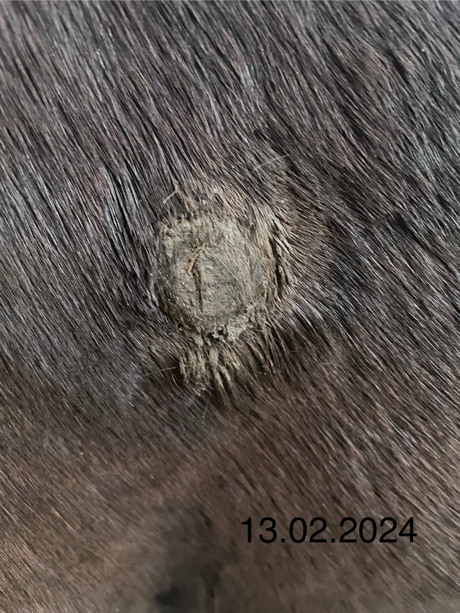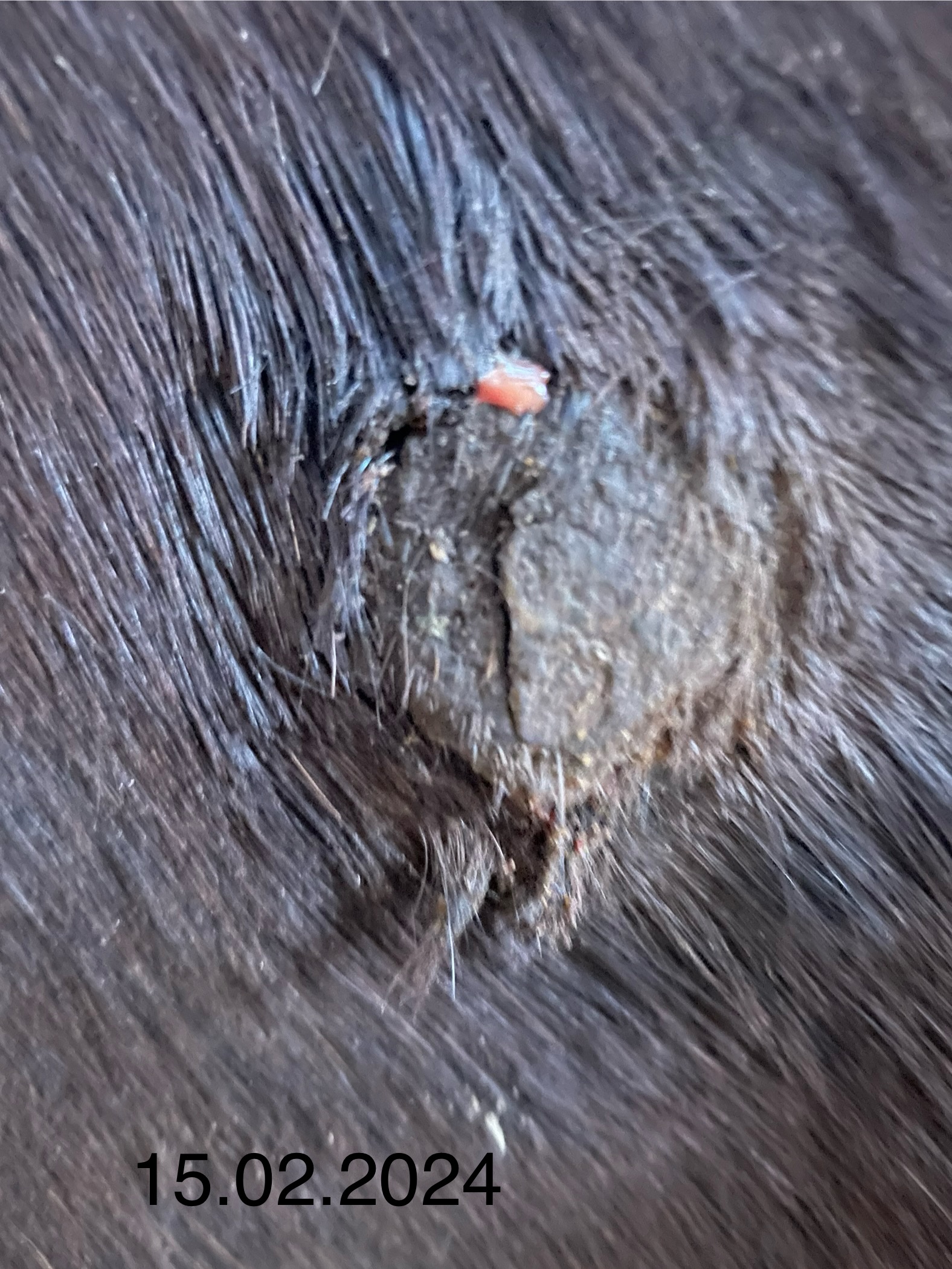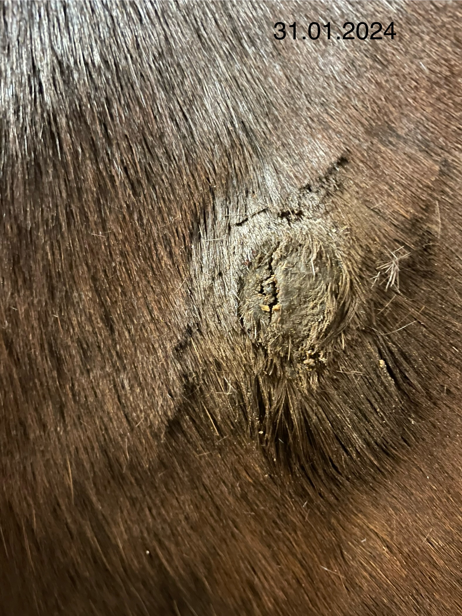 Das sich die Kruste gestern etwas abgehebt hat ist wahrscheinlich der Bewegung und dem (weichen) Sattelgurt geschuldet.