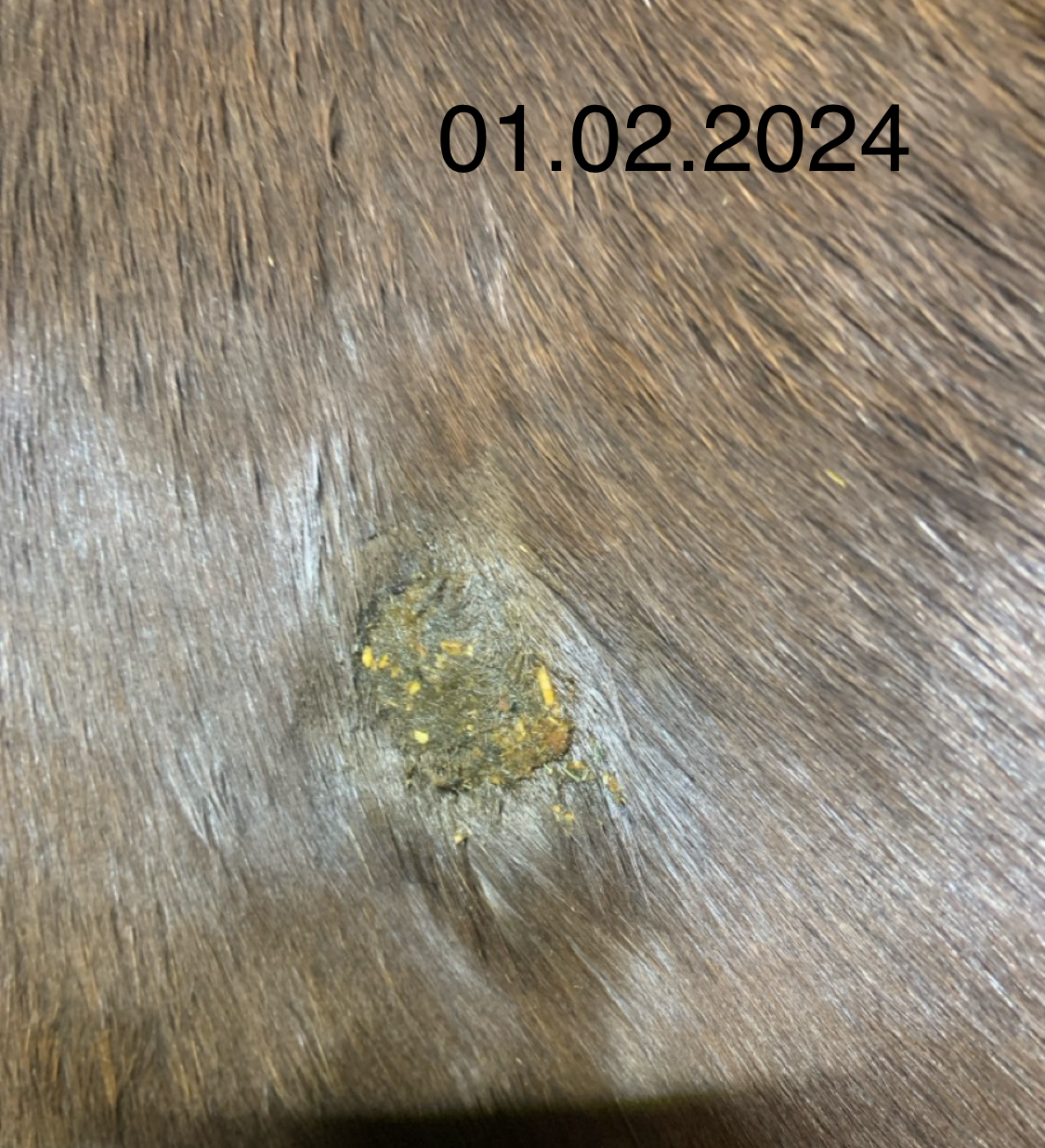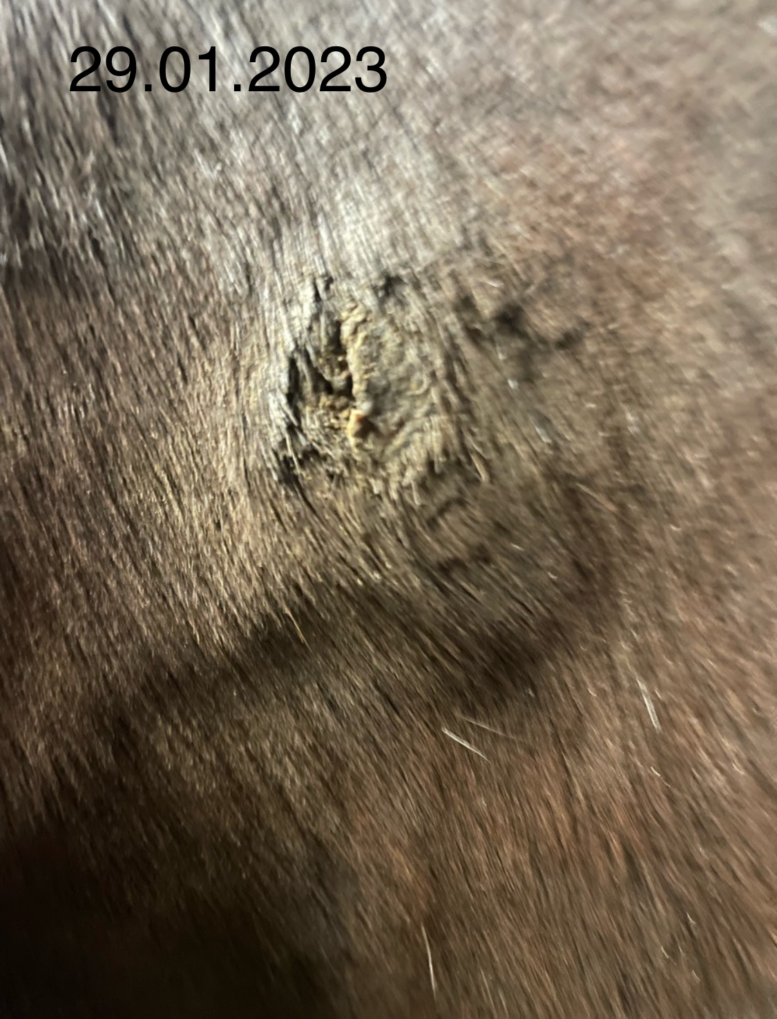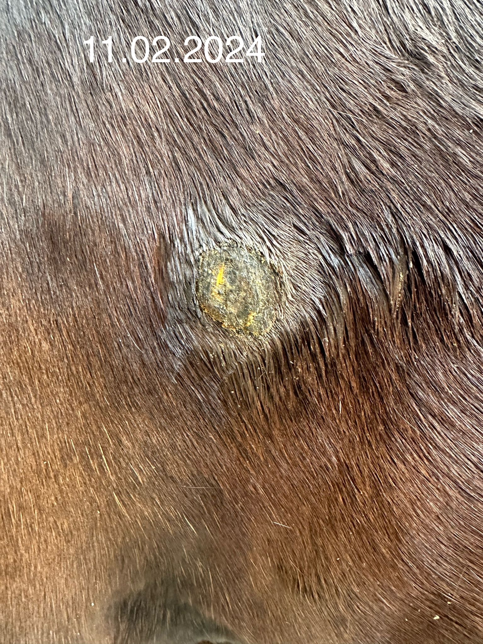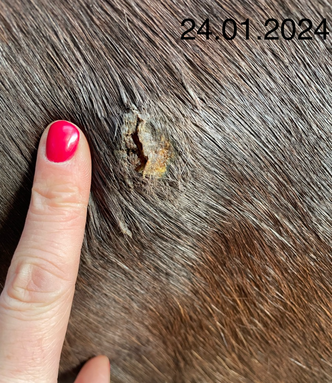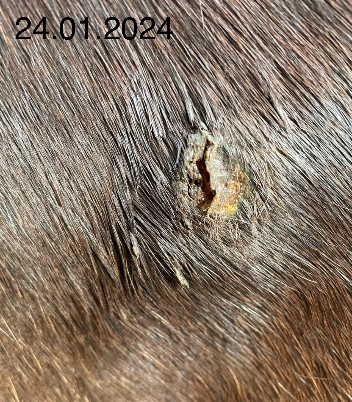 In den ersten beiden Wochen hat sich bereits eine Reaktion mit Sekret und Eiter gezeigt, wo ich auch die Hoffnung hatte die Kruste würde abfallen. Leider nein, mein Pferd ist sehr empfindlich an der Stelle geworden und zwei Tage lang war das umliegende Gewebe geschwollen und warm. Dies hat sich zum Glück wieder gelegt. Die Empfindlichkeit ist allerdings geblieben.