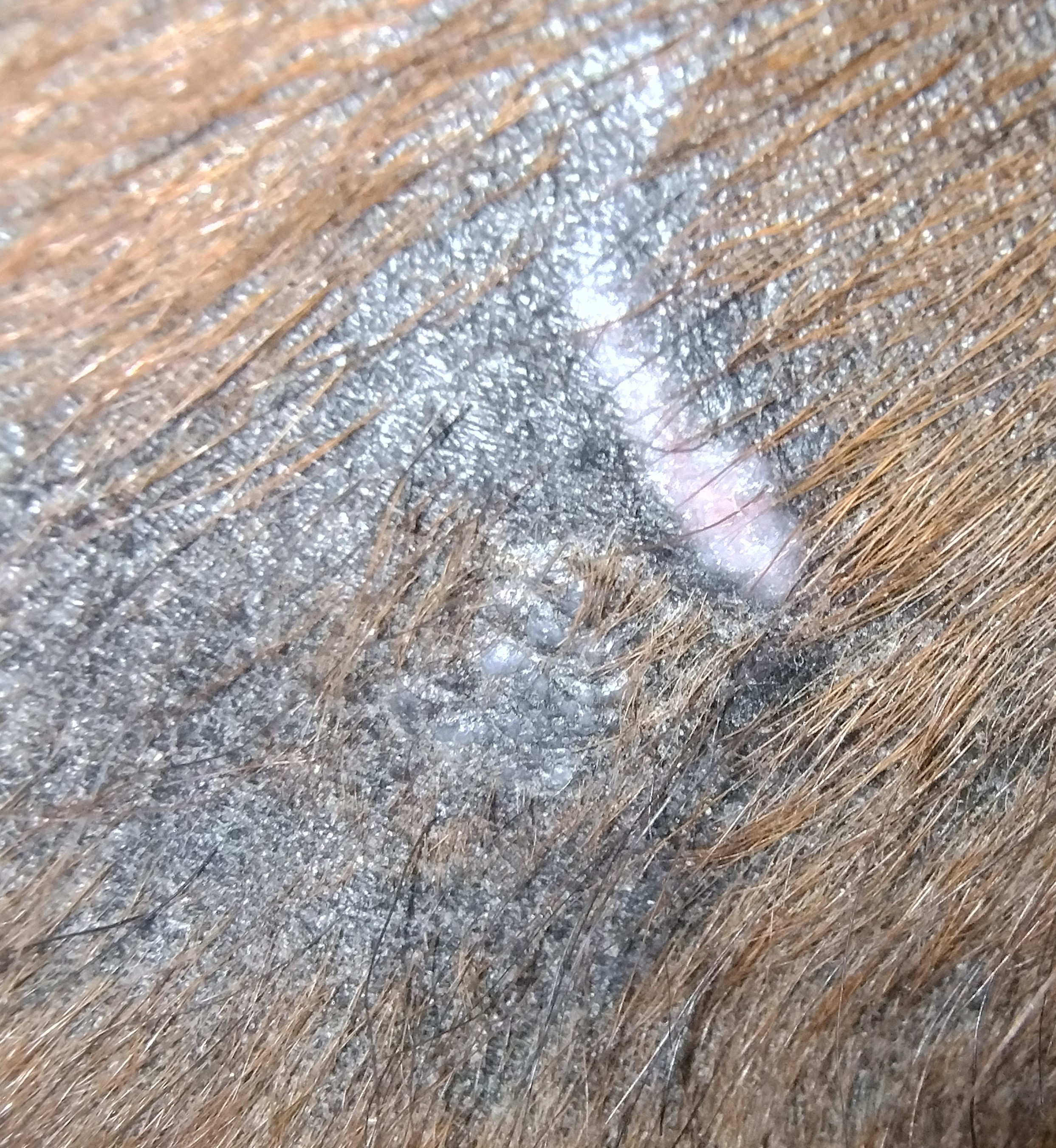 Dienstag Mittwoch Die Flanke sieht momentan so aus: Es ist einiges von der schwarzen Kruste abgebröselt, was darunter ist, lässt sich aber schwer erkennen. Da unterhalb bereits einige Haare ausgehen, schmiere ich direkt dort dick Heilsalbe. Seit letzten Freitag habe ich auf 1:3 gewechselt und tupfe etwas dicker.