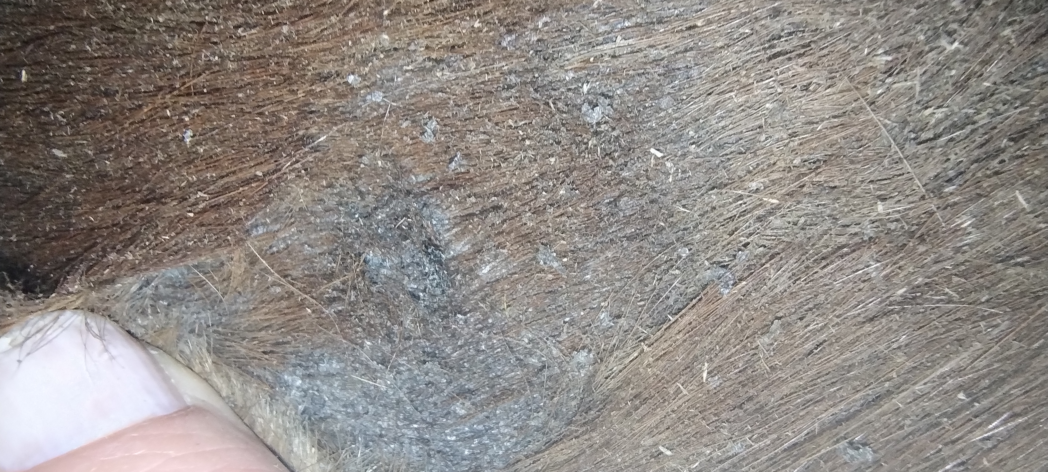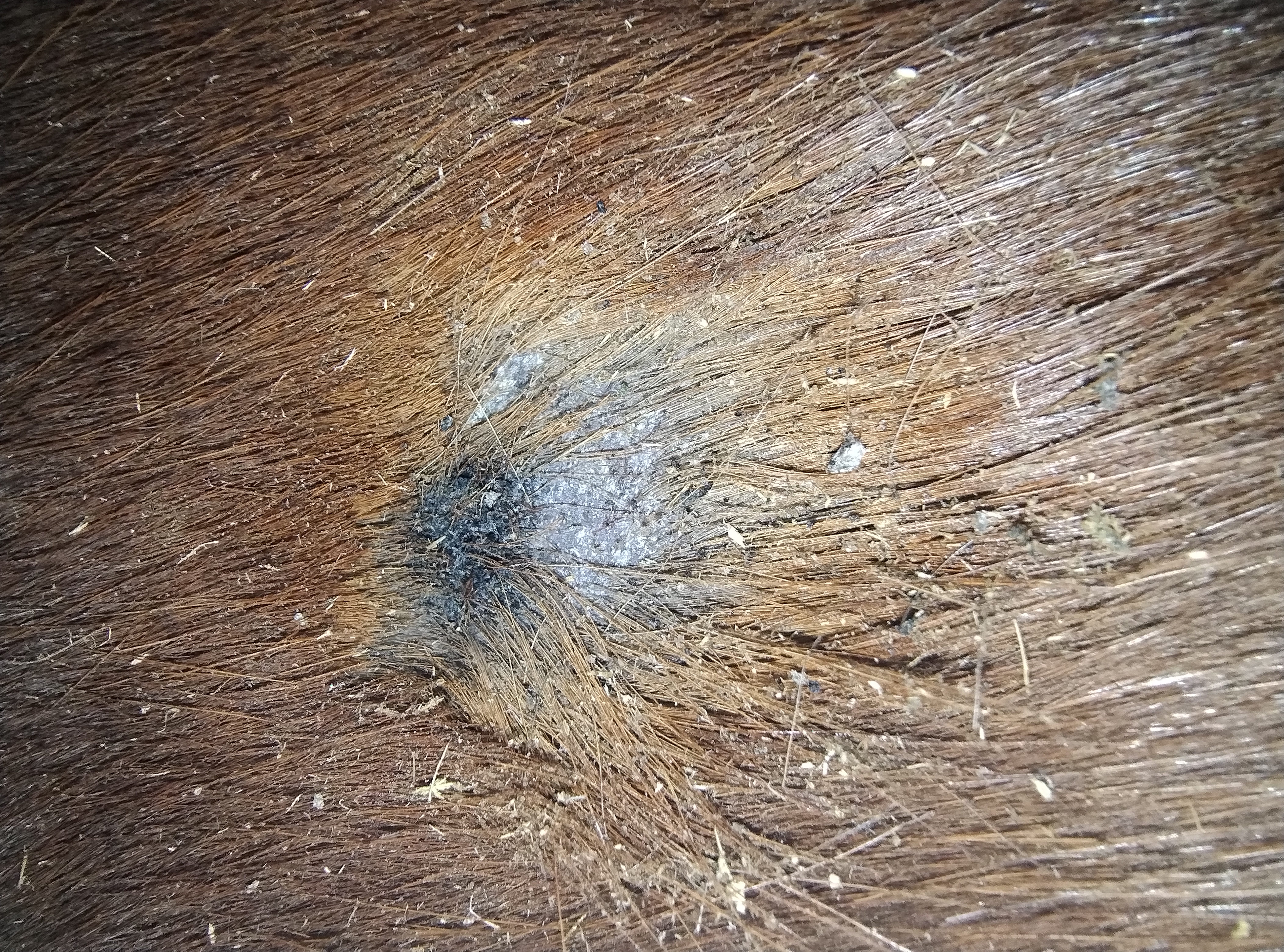 Dienstag Mittwoch Die Flanke sieht momentan so aus: Es ist einiges von der schwarzen Kruste abgebröselt, was darunter ist, lässt sich aber schwer erkennen. Da unterhalb bereits einige Haare ausgehen, schmiere ich direkt dort dick Heilsalbe. Seit letzten Freitag habe ich auf 1:3 gewechselt und tupfe etwas dicker.