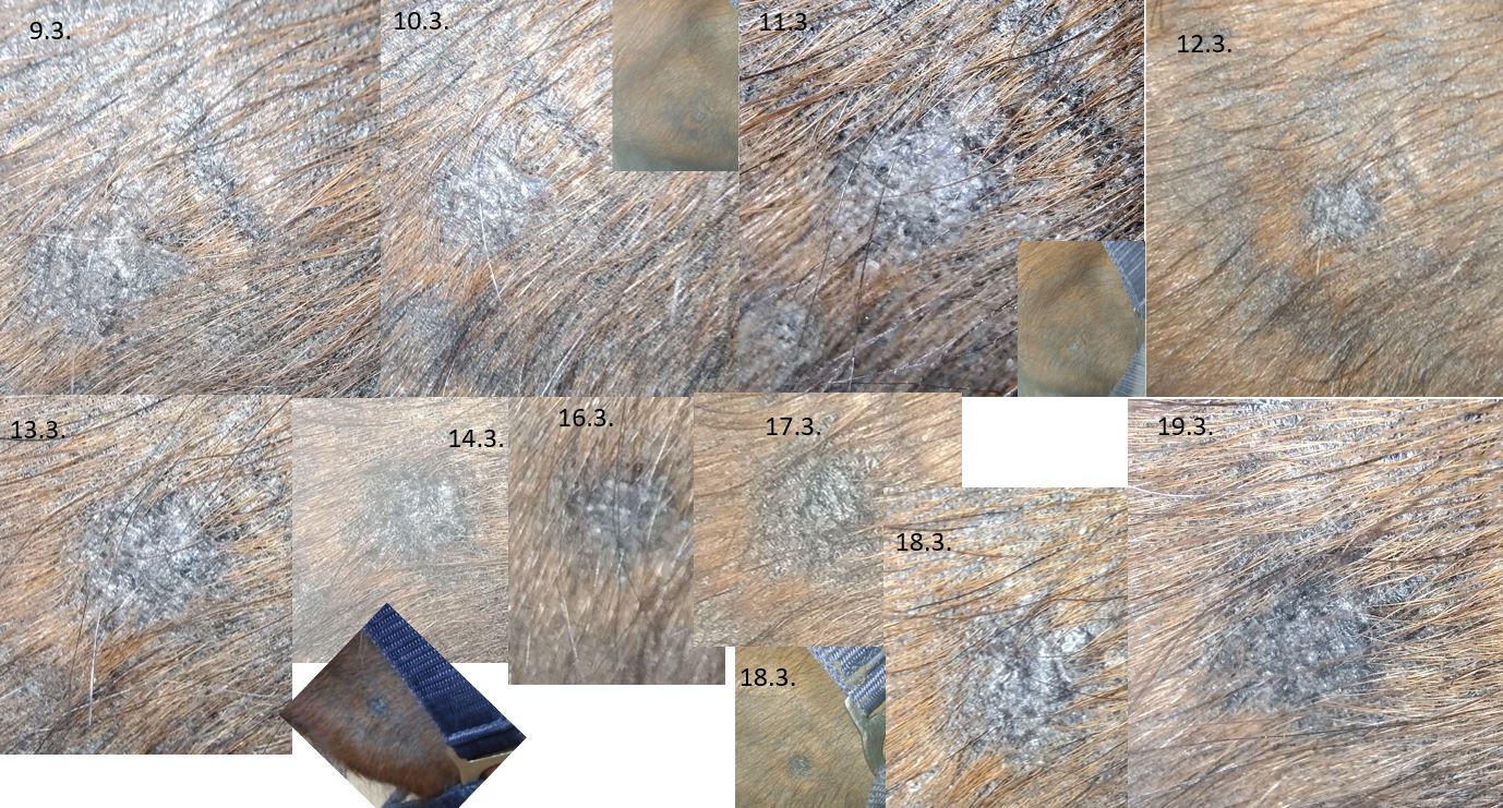 Die Wange habe ich seit 16.2. nicht mehr geschmiert, seit Montag besprühe ich die haarlosen Stellen mit einer Lösung aus Lebermoosextrakt, sonst schmiere ich aktuell nichts auch kein Bepanthen. Der Juckreiz scheint auf jeden Fall etwas nachzulassen.